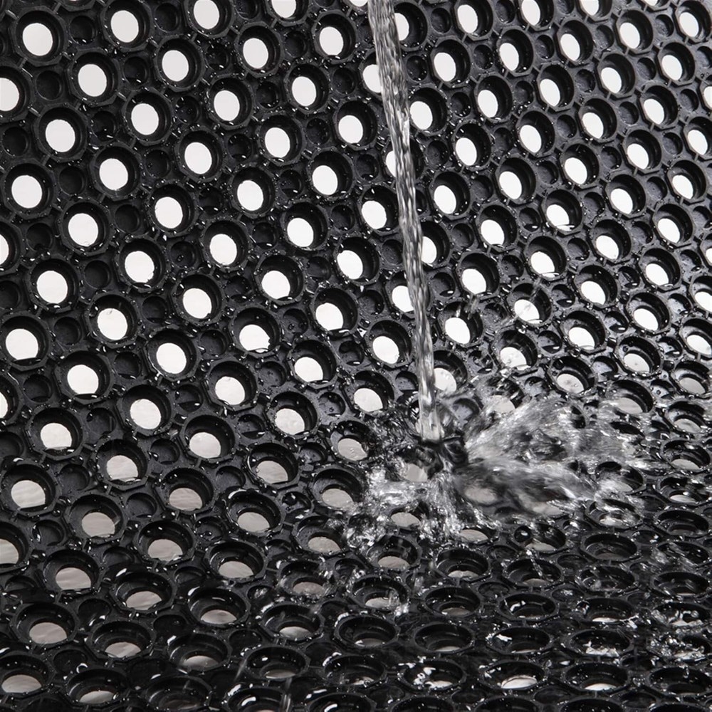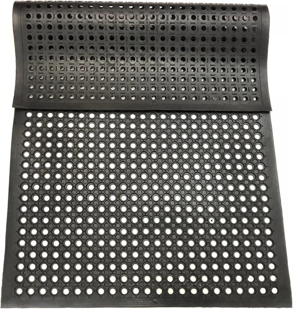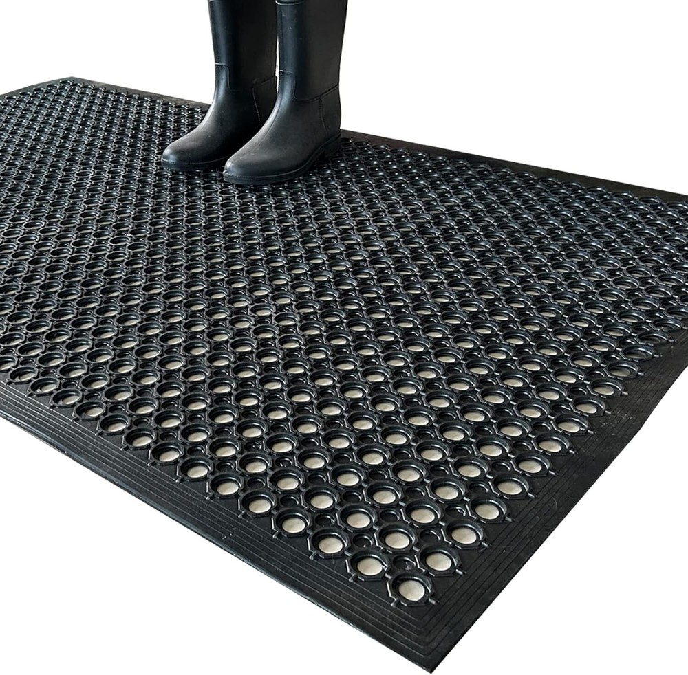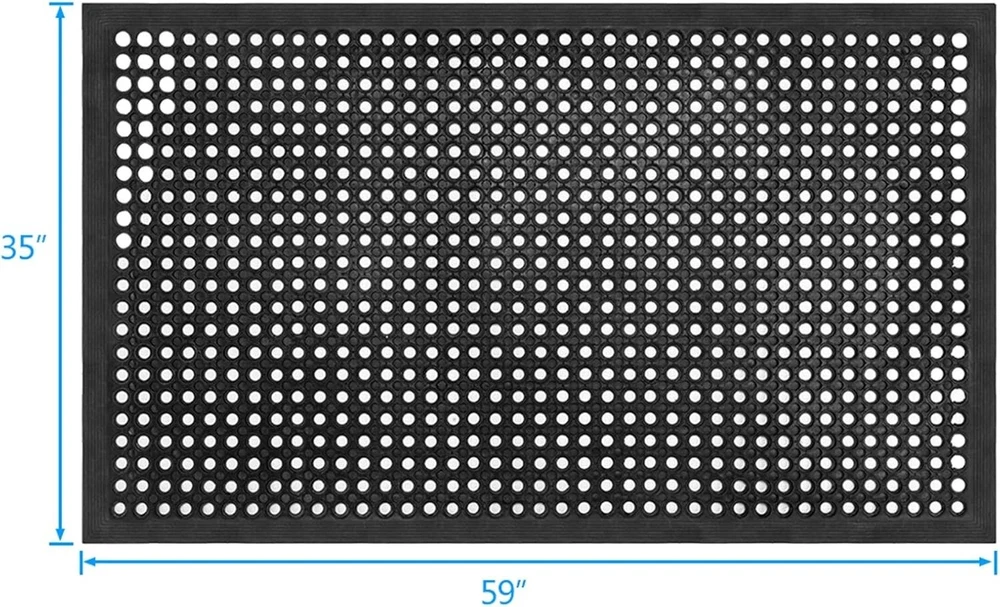 Heavy Duty Outdoor Rubber Floor Mat Anti-Slip for Garage, Restaurant, Kitchen Heavy Duty Outdoor Rubber Floor Mat - Designed to be tough and durable with drainage holes for water, snow, salt, and slush, this well-built rubber mat can be used as a restaurant mat, kitchen mat, safety mat, gym mat and even a bar mat. Durable Commercial Mat - The large mat made of high quality polyester and rubber which prevents moisture leaks while keeping the mat in place, has good grip but is not sticky which can be safe to use on vinyl , wood , tile and cement floors.Because it is made of rubber, there will be some smell at first. Easy to Clean Indoor Outdoor Rubber Mat - Simply vacuum with a hand-held vacuum, sweep with a broom, or shake off outdoors or over your garbage bin or use a garden hose to rinse the outdoor mat, keep the outdoor rubber mat fully air dry before next use. Large Heavy Duty Drainage Mat for Indoor Outdoor - Package comes with 1 large door mat - 59.06'' x 35.43''- 0.31" thick, with large hexagonal holes help to reduce the amount of slippery liquids and oils left on the floor.Grease and water-resistant rubber help keep the entrance mat in place, especially when used in high-traffic areas. Non Slip Mat Help to prevent dangerous accidents - Spend most economical money buy this best floor mat, you will never regret for your choice when you got our mat. Providing premium quality products for your home and office.Ideal for uses in bar, kitchen, restaurant, outdoor, boat, as well as warehouse or other industrial areas where moisture and heavy foot traffic are a problem. Outdoor Entrance Mat,outdoor rugs,Outdoor Mats,Rubber Mat,Rubber Floor Mat,Rubber Kitchen Mat,Anti-Slip Mat,Non-Slip Mat,Commercial Kitchen Mat,Resturant Floor Mat,Drainage Mat,Garage Floor Mat,Heavy Duty Mat For Bar, Garage, Entry, Outside, Stall, Industral, Indoor, Pool, Wet Area Use Mat,Outdoor Rubber Mats With Drainage,Heavy Duty Outdoor Mat Notes : Most of all rubber products have special smell , these are some suggestions, 1,Put your mat at a ventilated place for 3 or 5 days , Don't sunlight, the stink will be weak. 2,If your mat still has stink, please use water to clean and detergent or bleach for further lighten bad smell. Black Weight: 15.54 lbs Material: Rubber & Polyester & PVC Dimensions: (59.06 x 35.43)" / (150 x 90 )cm (L x W )