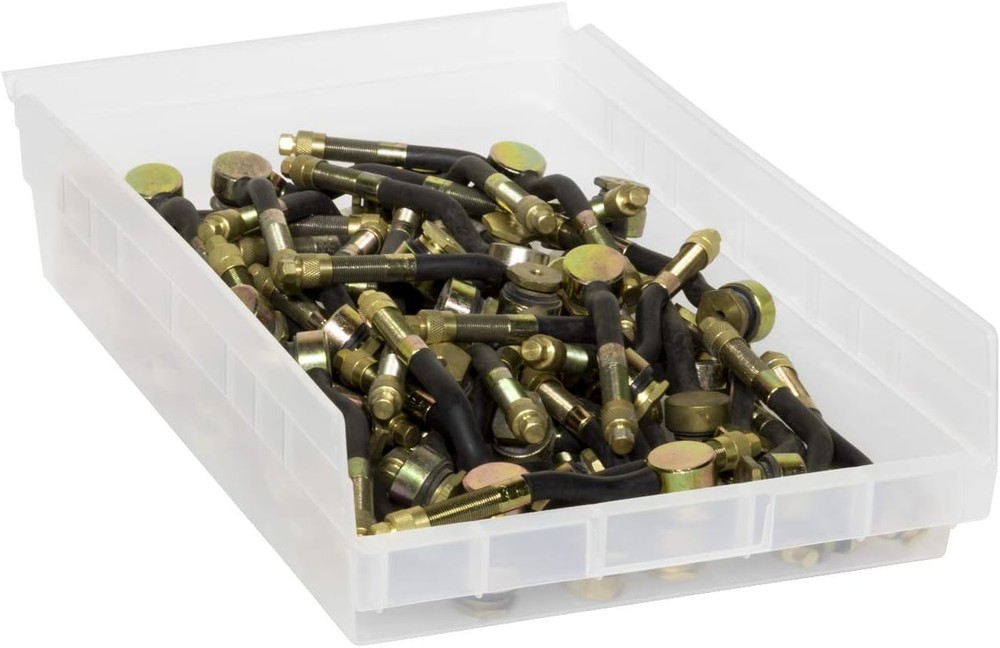 VERSATILE STORAGE CONTAINERS: Shelf Bins are great for any space; Use them on shelves, as an under sink organizer, cabinet organizer, or for garage storage; Bins fit with 12", 18", and 24" deep storage shelves, vertical storage, and pick racks DURABLE ORGANIZATION: These storage bins are made from industrial-grade polymers, offering a strong, long-lasting alternative to weak cardboard bins; Each storage bin is easy-to-clean and can be used indoors or outdoors; Shelf bins are waterproof SPILL-FREE RETRIEVAL: Lip design allows effortless forward tilting of the bin on racks, ensuring spill-free retrieval; Heavy duty plastic storage bins are great for parts storage, kitchen utensils, kitchen cabinet organization, closet storage, and more CUSTOMIZABLE SHELF ORGANIZER: Optional bin cups, dividers, and label holders (sold separately) let you tailor the heavy duty storage bins to your specific needs; Bins come in a variety of colors to color code your storage; Empty bins can be nested DIMENSIONS: Outside Dimensions - 17-7/8" x 11-1/8" x 4"; Inside Dimensions - 16-1/2" x 10" x 4"; Curved-bottom hopper front makes it easy to retrieve small parts; Weight capacity is limited to shelf weight capacity; Proudly made in the USA; Storage bins are NOT stackable