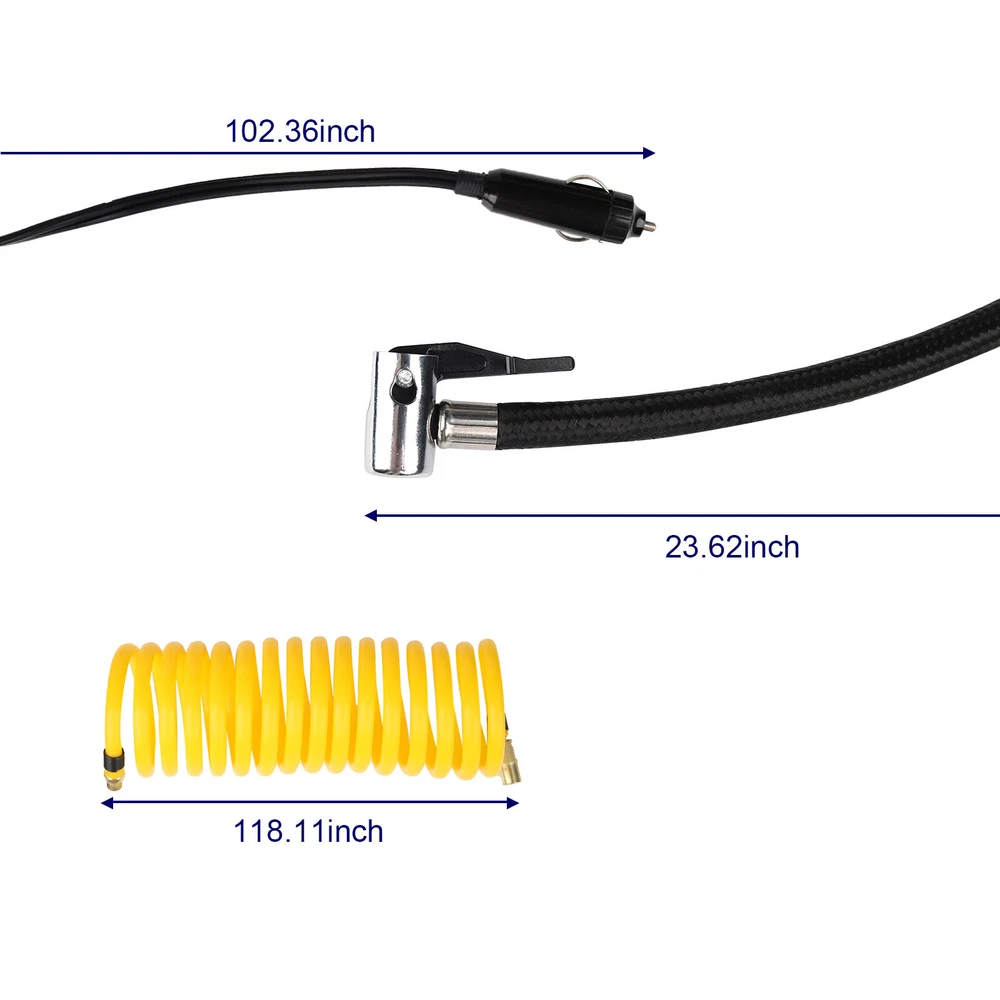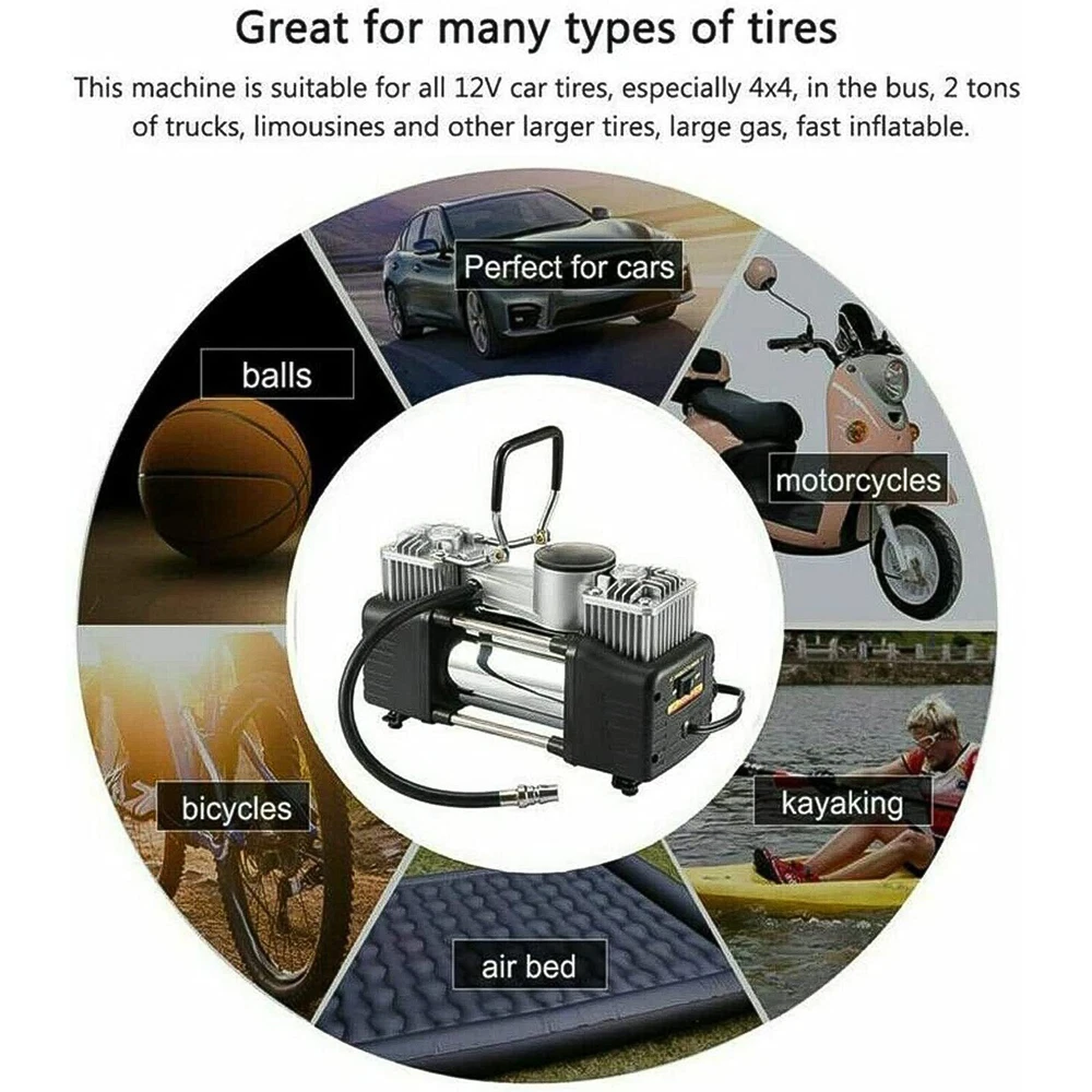 Heavy Duty Portable Air Compressor Car Tire Inflator Electric Pump Auto 12V Item Description Features: ★ Heavy duty air compressor, ideal for inflating many types of tyres including 4WD vehicles and tractors tyres. ★ Huge air flow cylinder 150PSI working pressure, can reach to the normal tire pressure quickly. ★ This lightweight mini compressor is small, compact and portable for easy storage in most vehicle types. ★ Cast metal air pump casing with radiator for better heat dissipation. ★ Supplied with tyre inflator extension adapter and other inflation accessories in the carry bag. ★ Able to inflatebike tyres, car tyres, athletic balls etc. Specification: ★ Type: 2 cylinders Air Compressor ★ Voltage range: DC 12V-13.5V ★ Max Ampere: 30Amp ★ Max Pressure: 150 PSI ★ Air Flow Rate: 70L/min ★ Weight: 2.7kg/5.95Lbs ★ Power Cable Length: 102 IN ★ Hose Length: 118 IN ★ Application: car/electric car/bicycle/motorcycle/ball/kayaking Note: ★ Strictly use it within instructed power voltage DC 12V, do not use high voltage ★ The car motor should be started before using ★ It is better to stop a while after inflating for 15 minutes to extend the lifespan of the motor ★ Generally, when inflate approximately 3 minutes; the normal tire pressure can reach 220KPA. Large tires will need longer time. If the gauge pointer rapidly rising when start inflate, means there is no air going though the tire, you must stop and start over, otherwise, the gauge and the motor will be damaged Package Include: ★ 1 x Portable Air Compressor Pump ★ 1 x Power Cord With Battery Clamps ★ 1 x Extension Air Hose ★ 3 x Inflatable Adapters ★ 1 x Carrying Bag Detail Images Shipment 1.We ship to your eBay or Paypal address. Please make sure your eBay and Paypal address is correct before you pay. 2.Items will be shipped within 1-3 business day when we received payment. 3.Delivery time depends on destination and other factors; 4.International buyers please note: a.Import duties, taxes and charges are not included in the item price or shipping charges. These charges are buyer's responsibility. We will try our best to reduce the risk of the custom duties. b.Please check with your country's customs office to determine what these additional costs will be prior to buying. Payment 1.We accept PayPal only. 2.All major credit cards are accepted through secure payment processor PayPal. 3.Payment must be received within 7 business days of auction closing. 4.We ship to your eBay address. Please make sure your eBay address is correct before you pay. Return & Refund Customer satisfaction is our first priority. We accept return within 30 days after delivery. Buyer is responsible for return shipping and insurance cost. Please email first before returning. We will return the money to you after got the return item(s). We can not refund to you if any broken or damaged of your return item. Please ensure its safety. Feedback Your feedback is very important to us. If you can't leave us a "5-Star" rating and a positive feedback, please contact us first prior before leaving feedback. We are eager to work with our customers. We believe in communication. Give us a call or send us an email, we will make things right for our buyers. Positive feedback for our buyers will be left automatically by eBay Seller Manager Pro. On Sep 2, 2024 at 19:56:23 PDT, seller added the following information: On Sep 17, 2024 at 15:36:07 PDT, seller added the following information: