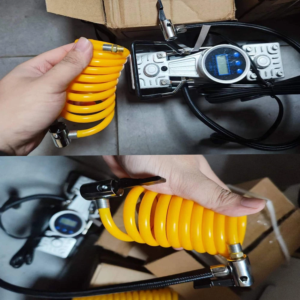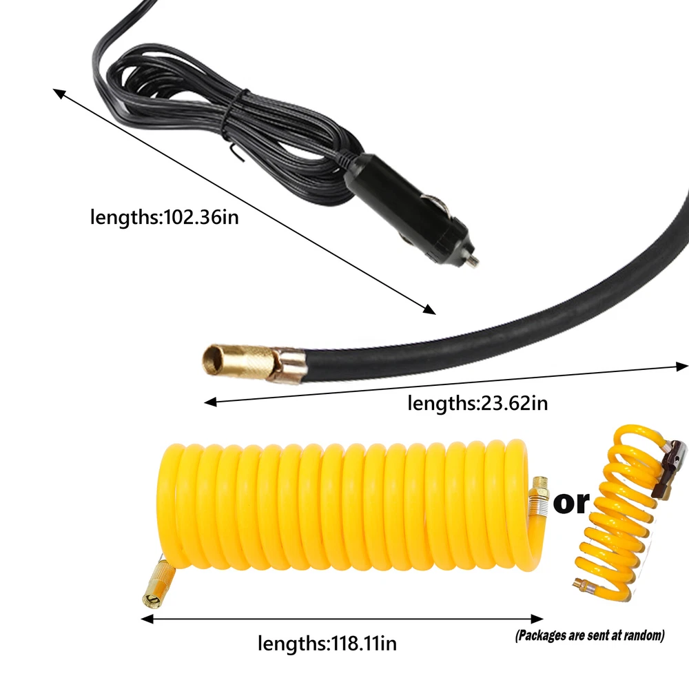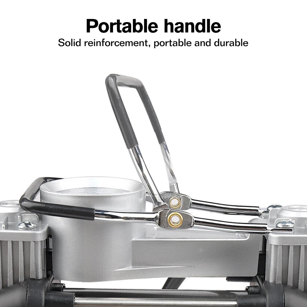 Product Description: 🥳 Feature : 【Inflate in seconds】 Unlike ordinary air compressor tire inflators that take a long time, ours does the job in 1.5 minutes or less. This 12V portable air compressor has dual cylinders with a maximum pressure of 150Psi and a flow rate of 60L/min; 4 times faster than other products. 【Equipment included】 Considering the problem of tire leaks, we put a tire repair tool in the tool pouch. The tire repair tool kit includes pliers, knife, screwdriver, tire repair strip, split-eye pins, and sharpeners. It also comes with 3 nozzle adapters and locking air clips to easily inflate air cushions/bikes/toys/inflatables. 【LCD Digital Pressure Gauge (with backlight)】 In addition to inflating the tire pump, the built-in digital air gauge checks and monitors tire pressure with a large bright LCD backlit digital display. 【Application scope】 Especially suitable for SUV, truck, van, RV, crossover, MPV, camper, trailer, van, also can be used for car, motorcycle, golf cart, bicycle, etc. 【Travel Gift】 Carry our small air compressor on your car trip, it's easy to use and keep your tires in good condition, you can buy a small tire inflator as a gift for your friends or family. 🚗 Specification: Air Flow: 60L/min Use 12 Volt DC 23A Only Color: Silver Material: Carbon Steel+Plastic+Electronic Component Power: DC 12V 280W Power Cord Length: 300cm Current: 23A(Max) Maximum Output: 150 PSI Working Temperature: -55°C to 60°C Size: 9.6*4.7*4.7inch (L x W x H) 🎁 Package Include: Package Included 1 x Portable Air Compressor Pump 1 x Power Cord with Battery Clip 1 x Extended Air Hose 3 x Inflation Adapters 1 x tool pouch 1 x User Manual 【Application scope 】 Especially suitable for SUV, truck, van, RV, crossover, MPV, camper, trailer, van, also can be used for car, motorcycle, golf cart, bicycle, etc. 【 Inflate in seconds 】 Unlike ordinary air compressor tire inflators that take a long time, ours does the job in 1.5 minutes or less. This 12V portable air compressor has dual cylinders with a maximum pressure of 150Psi and a flow rate of 60L/min; 4 times faster than other products. 【 LCD Digital Pressure Gauge (with backlight) 】 In addition to inflating the tire pump, the built-in digital air gauge checks and monitors tire pressure with a large bright LCD backlit digital display.