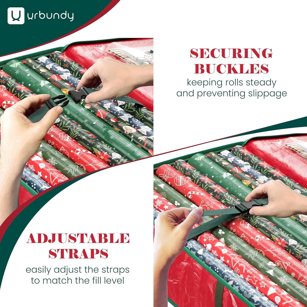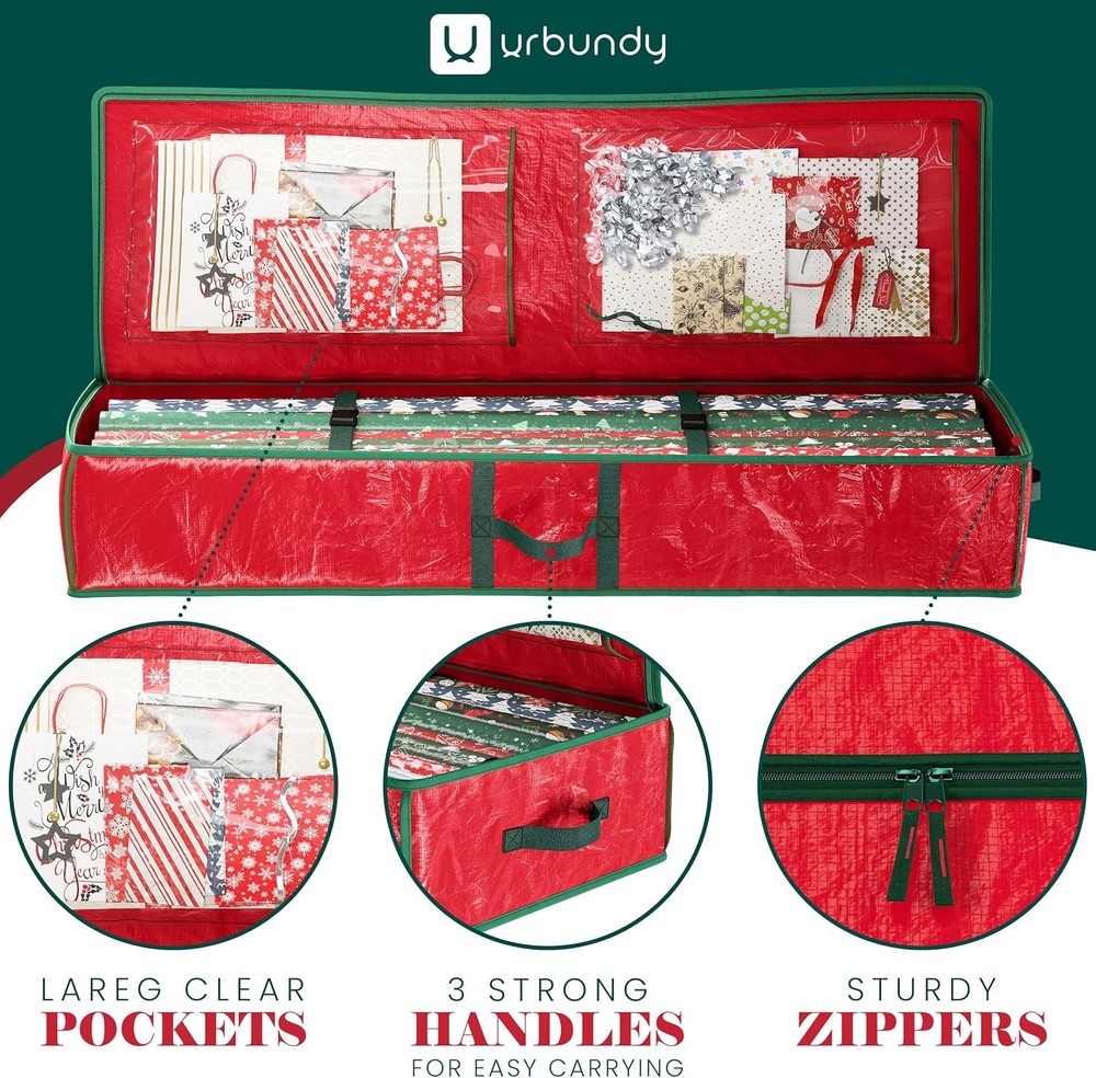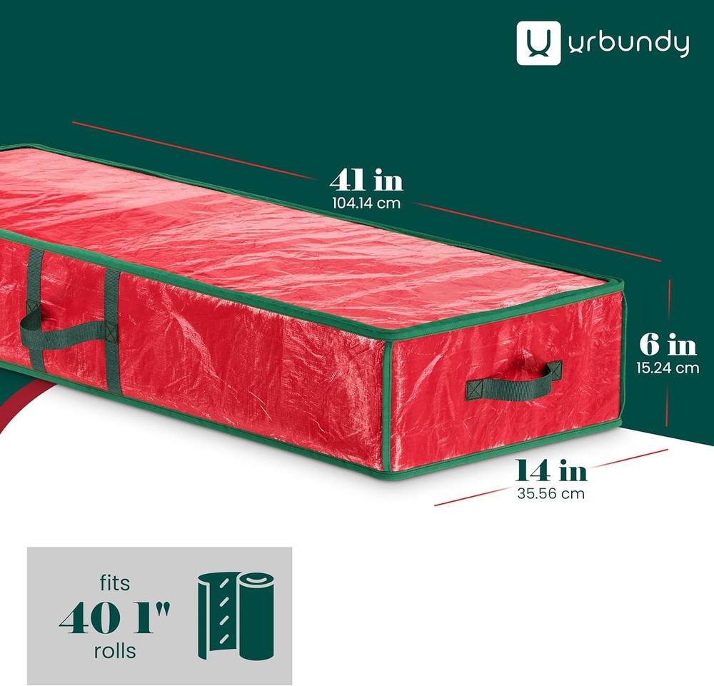 Heavy Duty Wrapping Paper Organizer Storage Bag Red - Christmas Product Details Brand: URBUNDY Material: PE Plastic Color: Red Special Feature: Waterproof Closure Type: Zipper Shape: Rectangular Number of Items: 1 Number of Sets: 1 Item Weight: 0.66 Pounds UPC: 810143582840 Product Dimensions: 41 x 14 x 6 inches Item Weight: 10.6 ounces Manufacturer: URBUNDY Batteries required: No ULTIMATE PROTECTION AND ORGANIZATION: Keep all your gift wrap essentials neatly organized with our wrapping paper organizer storage bag. Designed to hold rolls of wrapping paper, this bag also features pockets for your ribbons, scissors, tape, and other accessories. Made to shield your supplies from dust, dirt, and moisture, this wrapping paper storage solution ensures everything stays in perfect condition. Ideal for Christmas storage, it's the perfect gift wrapping organizer storage. SPACIOUS WRAPPING PAPER ORGANIZER: Measuring 14 x 6 x 41 inches, this storage organizer can hold up to 40 one-inch rolls, making it the ultimate gift wrap storage solution. With its generous size, this gift bag storage organizer ensures you have plenty of room for all your wrapping essentials. Whether used as a Christmas storage bag or a year-round wrapping paper holder, it keeps everything neatly stored and ready for any occasion. THOUGHTFUL FEATURES FOR EASY ORGANIZATION: This wrapping paper organizer features a strong zipper to keep contents secure and easy-carry handles for effortless transport. The large pockets are perfect for storing gift bags, ribbons etc, making it the ideal gift bag organizer. An adjustable strap keeps your wrapping paper rolls firmly in place. Designed for efficient holiday storage, this wrapping paper storage organizer ensures all your supplies are neatly contained and ready for use. WATERPROOF PROTECTION AND DURABLE MATERIAL: Crafted from heavy-duty, waterproof material, this wrapping paper storage bag is designed to keep moisture, dust, and dirt out, ensuring your wrapping paper stays in pristine condition. It’s a must-have for your Christmas storage containers, providing long-lasting durability to protect your holiday essentials. Built to handle seasonal use, this Christmas wrapping paper storage solution keeps your supplies safe year after year. URBUNDY HOLIDAY STORAGE SOLUTIONS: We don’t just offer wrapping paper organizer storage—Urbundy provides a complete line of organizers and storage products to meet all your holiday décor storage needs. Keep your decorations neatly organized and enjoy a hassle-free setup every season! We're confident you'll love your wrapping paper organizer, and when you do, we’ll be here with more solutions for all your holiday storage essentials.