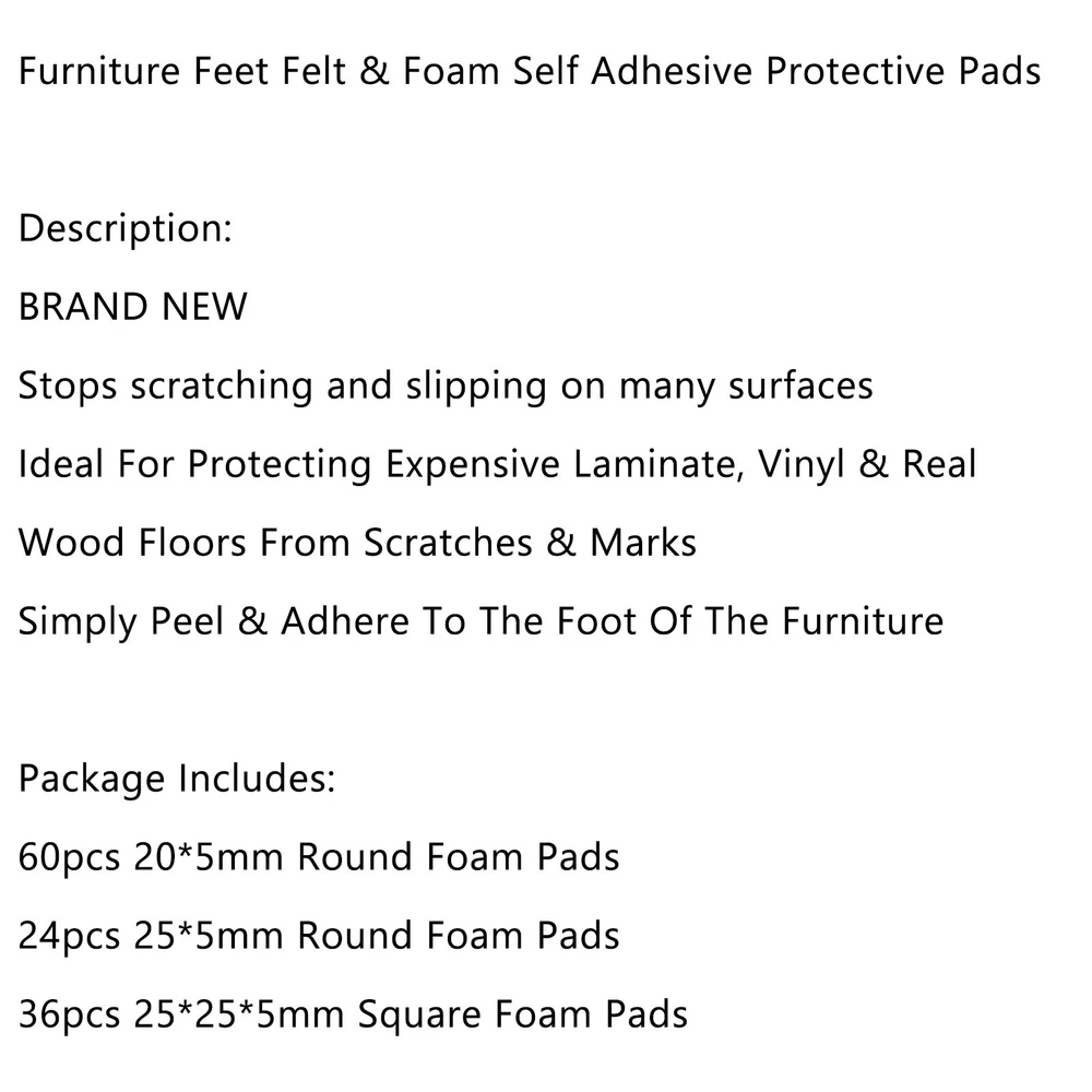 Product Description Furniture Feet Felt & Foam Self Adhesive Protective Pads Description: BRAND NEW Stops scratching and slipping on many surfaces Ideal For Protecting Expensive Laminate, Vinyl & Real Wood Floors From Scratches & Marks Simply Peel & Adhere To The Foot Of The Furniture Package Includes: 60pcs 20*5mm Round Foam Pads 24pcs 25*5mm Round Foam Pads 36pcs 25*25*5mm Square Foam Pads Shipping Returns Warranty Feedback About US ✔ Same business day free shipping within United States ✔ Delivery Time: 3-5 business days (continental U.S.). ✔ Order Processing: Ships within 3 business day (Mon-Fri, excludes holidays). ✔ Tracking Info: Provided automatically via eBay. ✔ All orders will be shipped through USPS First Class, UPS and Fedex depends on the weight of the items. ✔ Shipping notification will be emailed to you once package has been shipped Fast & Reliable Shipping – Your order is our priority! We package all items with care to ensure safe arrival! Tracking number emailed as soon as your order ships! 🌍 Ships from U.S. Warehouse – No long waits! 📦 Standard Shipping (Free): 3-5 business days (U.S. only). ULTRA-FAST SHIPPING – Because you shouldn't wait! We guarantee on-time delivery or your shipping fee back! 60-Day Hassle-Free Return Policy We offer 60-day free returns for your peace of mind. To ensure a smooth process, please contact us first before opening a return request—we'll gladly help resolve any issues! ⭐ Return Requirements: ✅ Unused & in original packaging ✅ Contact us immediately if the item is defective/damaged (photos/video required) ✅ Repack securely to prevent shipping damage ⚠️ Important Notes: • If returning due to change of mind, please select: "Changed mind" or "Didn't like item" Defective/damaged items? Contact us immediately with photos/video proof • Incorrect return reasons (e.g., falsely claiming "defective") may result in a refused refun d. ⭐ Return Process: • Contact us → We'll provide return instructions. • Ship the item back with tracking (recommended). • We inspect returns within 3-5 business days. Approved refunds are issued to your original payment method (processing time varies by bank). ⭐ Need Help? Message Us First! We're happy to offer alternative solutions, including replacements or discounts, before you proceed with a return. Your satisfaction is our top priority! No-Questions-Asked Warranty ⭐ HASSLE-FREE WARRANTY • 90-365 Day Coverage (varies by product - see listing details) • No Return Required for claims under $50 - we ship replacements immediately ✖ Exclusions: • Physical damage (drops/accidents) • Installation errors (YouTube tutorial links provided) • Modified/tuned vehicles Professional Installer Warranty ⭐ CERTIFIED INSTALLATION WARRANTY ✔ installed by licensed mechanics ✔ Free Technical Consultation before installation ⭐ Feedback & Satisfaction Policy Your 5-Star Reviews Help Us Grow! We're committed to your complete satisfaction. When you receive your item and are happy : ✅ Please consider leaving positive feedback about your experience ✅ Share what you loved (fast shipping? great packaging? accurate description?) Our Promise to You: ✔ 100% satisfaction guarantee - we stand behind our products ✔ Open, honest, and timely communication ✔ Always respond within 24 hours to any concerns Before Leaving Feedback: ⭐ Contact us first if anything is less than perfect ⭐ Allow us to make it right (replacement/refund/store credit) ⭐ Negative feedback won't solve issues - but we will! Important Notes: • Feedback about shipping carriers should go to their official channels • eBay cases opened without contacting us first void satisfaction guarantees We value your voice - let's work together for a great eBay experience! Our company [Amotopart] begins our business in ebay since 2006. We Mainly sell Bike, Sport goods, Home & Garden products, Computer Accessories, Consumer Electronics, Industrial and more to meet your needs. Our Advantage: [High Quality] - We focus on R&D, cooperating with professional manufacturers, ensuring that we provide our customers with top quality and innovative products. [Great Price] - We try our best to offer you the best price in all markets. [Excellent Customer Service] - We try our best to service our customers all time, professionally and sincerely solve your problem and reply quickly within 24 hours(excluding weekends). [International Warehouse] - We have many warehouses around the world, such as in USA, UK, AU and so on, ensuring the fastest shipping for your orders. We value honest and fair business with our customers. We welcome you to contact us and look forward to working with you! Shipping ✔ Same business day free shipping within United States ✔ Delivery Time: 3-5 business days (continental U.S.). ✔ Order Processing: Ships within 3 business day (Mon-Fri, excludes holidays). ✔ Tracking Info: Provided automatically via eBay. ✔ All orders will be shipped through USPS First Class, UPS and Fedex depends on the weight of the items. ✔ Shipping notification will be emailed to you once package has been shipped Fast & Reliable Shipping – Your order is our priority! We package all items with care to ensure safe arrival! Tracking number emailed as soon as your order ships! 🌍 Ships from U.S. Warehouse – No long waits! 📦 Standard Shipping (Free): 3-5 business days (U.S. only). ULTRA-FAST SHIPPING – Because you shouldn't wait! We guarantee on-time delivery or your shipping fee back! Returns 60-Day Hassle-Free Return Policy We offer 60-day free returns for your peace of mind. To ensure a smooth process, please contact us first before opening a return request—we'll gladly help resolve any issues! ⭐ Return Requirements: ✅ Unused & in original packaging ✅ Contact us immediately if the item is defective/damaged (photos/video required) ✅ Repack securely to prevent shipping damage ⚠️ Important Notes: • If