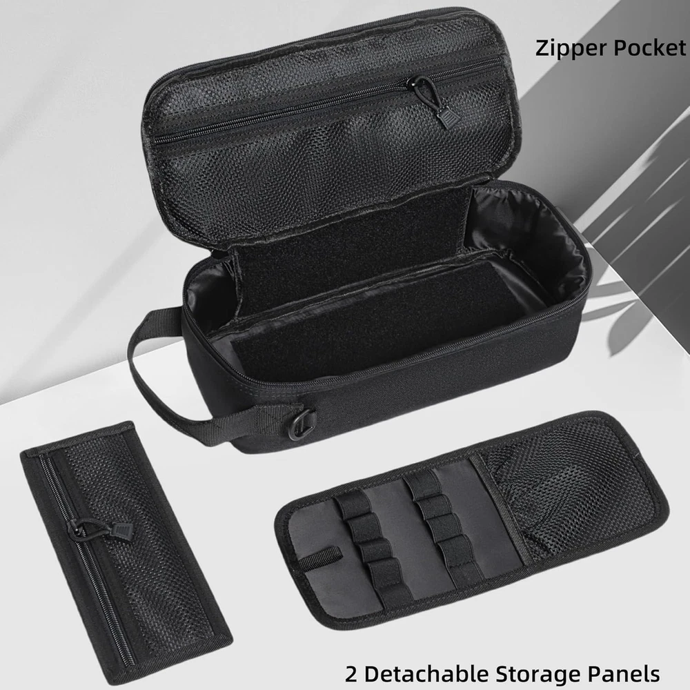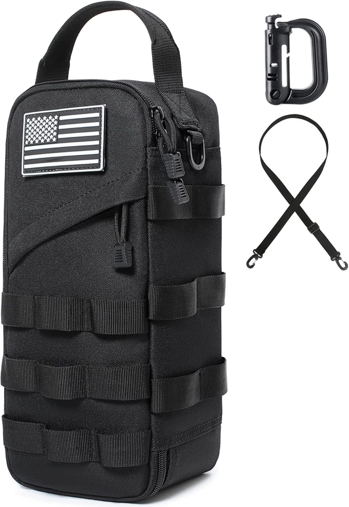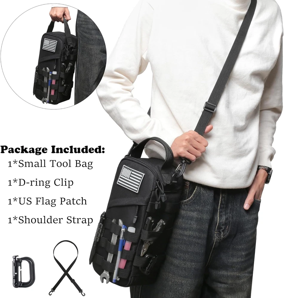 Package Included:1*Heavy Duty Small Tool Bag+1*D-ring Clip+1*US Flag Patch+1*Shoulder Strap. Size:12.6*5.5*4.3 in Partition Storage:The Small Tactical Tool Pouch features a main compartment with a front zipper pocket,a top zipper pocket and two detachable storage panels to hold your tool gadgets.Unique tactical Molle element design, cool and practical.Sturdy double zippers for the top to the sides quickly ,easily see what you have,easy access and no noise Durable and Long Lasting: Small Tactical Molle Zipper Tool Bag Pouch is made of 1000D nylon,all straps are stitched using tough to withstand strong forces and prevent tears over time. Durable and water-resistant and provide anti-scraping protection for even the most rugged user Portable Design:The compact and portable multi-purpose tool bag design is the perfect choice for beginner and professionals. The widened handle makes it easy to carry wherever you go. Convenience meets functionality in this must-have tool storage solution TACTICAL MUST HAVES:It is great tactical accessories and wonderful choice for men. The molle tool pouch can be used as tool storage box, electrician tool bag, motorcycle tool bag, art supply storage organizer, craftsman tool bag. Alternatively, use as medicine bag at home or travel Heavy Duty Small Tool Bag Pouch Portable Utility Organizer Case with Zipper Handle. Perfect for EDC, Motorcycle, Road Bike, Electricians & More