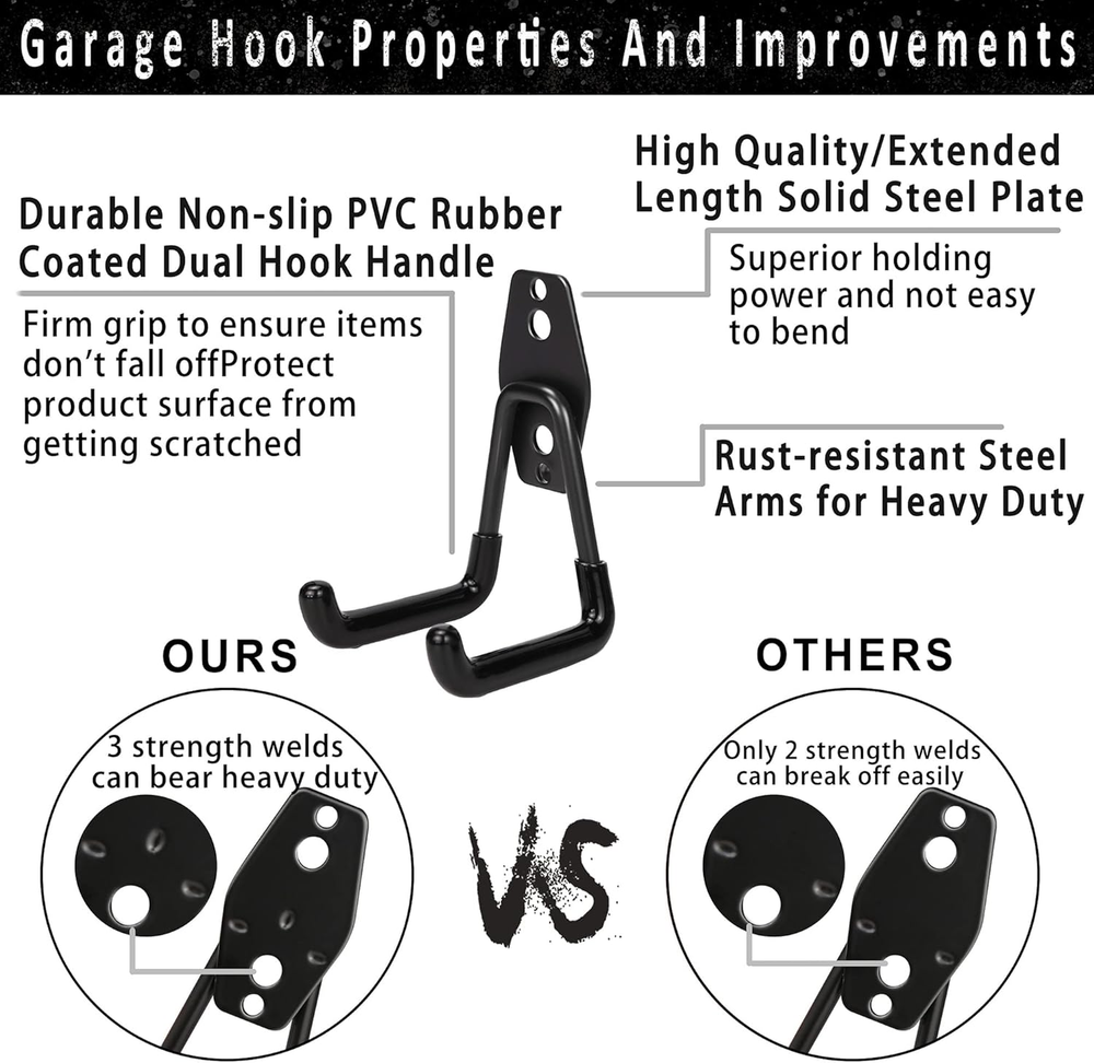 Store New Arrivals Add to Favorite View Feedback Contact Steel Garage Storage Hooks - 16 Pack Anti-Slip Coating, Heavy Duty Wall Mount Hooks Description Item model number Garage Hook-3 Style Classic Batteries Included? No Batteries Required? No Finish Pvc,Steel Brand KOFANI Material Iron Maximum Weight Recommendation 3.5 Kilograms Minimum Weight Capacity 88 Pounds Number of Hooks 16 Maximum Weight Capacity 88 Pounds Finish Type Pvc,Steel Package Dimensions 8.98 x 7.4 x 3.5 inches Manufacturer KOFANI Item Package Quantity 1 Item Weight 1 pounds Surface Recommendation Concrete, Brick, Wood Special Features non_slip, heavy_duty Special Feature non_slip, heavy_duty Weight Limit 88 Pounds Part Number Garage Hook-3 Mounting Type Wall Mount Color Black Shape U-shape, J-shape EXTREMELY STURDILY MATERIAL: The garage hooks is made of premium heavy-duty solid steel and the plate are reinforced with three layers, providing superior load capacity, the utility hooks are great for ladders, sports equipment, lawn trimmers, gardening equipment and other bulky items! NON-SLIP PVC COATING: The ladder hooks with sturdy non-slip PVC rubber coating, can grab the item firmly and protect the item surfaces from getting scratched or marred well. Preventing the hooks for garage storage from rusting, can be used many years! EASY TO INSTALL: Comes with two kind of screws and anchors, can suitable for plaster walls, wooden, brick or concrete walls, simply with a drill, hammer and screwdriver, can easily install them to hold any item to storage. VARIOUS SIZES: There are 14 garage hooks heavy duty with 5 Sizes: 5 small U hooks, 3 medium U hooks, 2 large U hooks, 2 large J hook and 2 small J hook. We also provides 2 extension cord organizer straps for hanging tools of different sizes and weight. EFFICIENT STORAGE FUNCTION: Design with double hooks, utilize the vertical storage method to create additional space, the garage wall hooks can be used wherever you need, such as garage, shop, shed, garden, warehouse, basement, ect. Perfect garage wall hooks to keep everything organized and clear at a glance. Product Description KOFANI Steel Garage Hooks Set KOFANI hooks are committed to maximizing the safety and capacity of organizational tools, the garage hooks are able to hold weight up to 88 lbs, which will create efficient storage space and make your stuffs arranged in good order. Your next organization project starts right here with our high quality hooks! KOFANI Steel Garage Storage Double Hooks Various size of hooks to adapt different scenes and create more rooms!Such as garage, basement, shed, shop, kitchen, and bathroom, to create efficient storage space. Package List - 5 x Small U Wall Hooks - 3 x Medium U Wall Hooks - 2 x Large U Wall Hooks - 2 x Large J Wall Hooks - 2 x Small J Wall Hooks - 2 x Extension Storage Straps - 2 x 28 anchors and screws Product Details Multi-positioned Holes For Different Walls Reinforced with three layers is designed to provide more protection Premium Grade Steel Material Is Not Easy To Bend Surface dealt with special spray process, which makes our hooks glossy, corrosion-resistant, you can use them indoor and outdoor Covered Non-slip PVC Coating Keep Your Items From Being Scratched PVC coating will avoid the scracth to the tools which need organized High Quality Extension Storage Straps Adjustable Size — Adjust the extension storage straps freely to fit items Rust-Resistant Grommet — Suitable for most pegboard hooks and garage hooks Lightweight And Easy To Store — Perfect for extend storage and garage organize ABOUT US We offer the best prices around on high quality products. Our E-store includes media such as books, movies, music and games while offering electronics, toys, sporting apparel, clothing, tools, general home, garden items and more. SHIPPING We are always working hard to ensure your package arrives as soon as possible. Please understand that some factors like weather, high postal traffic, and the performance of shipping companies are outside of our control. We offer free shipping to the lower 48 states and ship within 2 business days of payment, usually sooner. We do not accept P.O. Boxes. Please provide a physical address. No Return Policy – Defective Items Only We do not accept returns. However, if you receive a defective or damaged item, we are happy to assist. To qualify for a refund or replacement: • The issue must be reported within 24 hours of delivery. • You must provide clear photos of the defective item showing the issue. • Once verified, you may keep the item, and we will issue either a refund or a replacement at our discretion. CUSTOMER SATISFACTION We try our very best to make sure every customer is completely satisfied. If there's a problem, message us! We're happy to help.