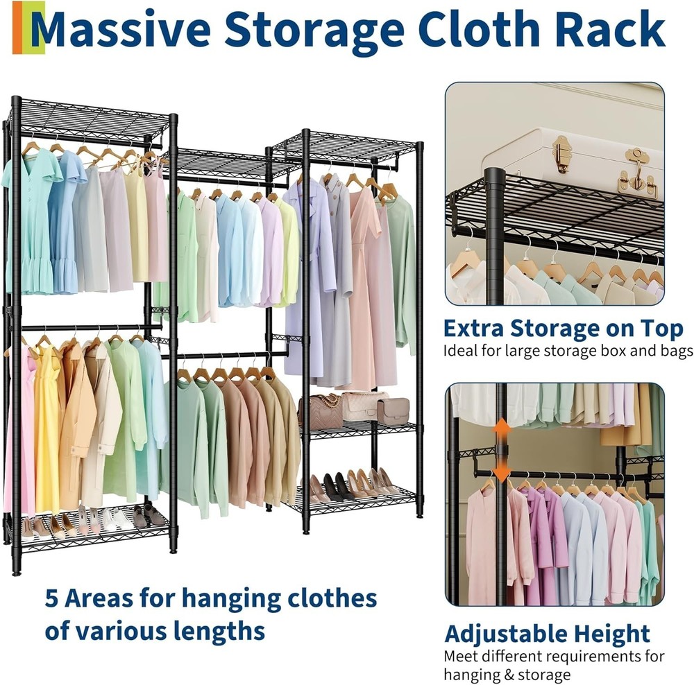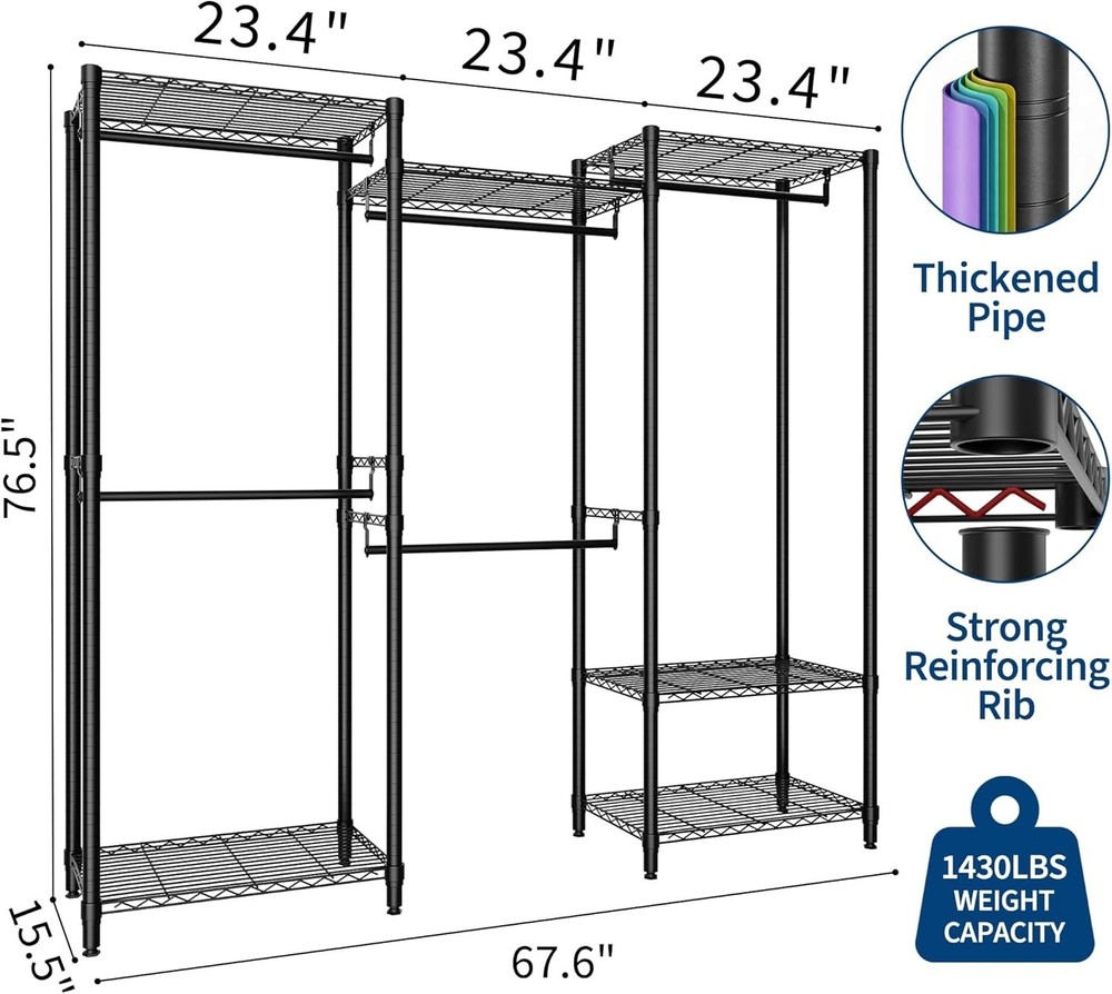 Heavy Duty Storage Clothes Rail Rack Garment Hanging Stand Open Wardrobe Shelf About this item Large Clothes Storage Space: Boasting dimensions of 76.5"H x 67.6"L x 15.5"W, this clothes rack is designed to maximize your storage capacity. It features FIVE dedicated hanging zones tailored for clothes of different lengths, perfect for hanging suits, coats, long dresses, jackets, pants, shirts, or other heavy garments, paired with robust metal wire shelves ideal for stowing shoes, bags, and storage boxes. Sturdy and Strong Construction: Crafted with thickened metal poles (19.1 mm diameter) and reinforced V-shaped wire shelves, this heavy-duty clothes rack delivers exceptional sturdiness and load-bearing capacity—supporting up to 1430 lbs without easy deformation. The durable powder-coated finish enhances its performance by making the portable closet water-resistant and rust-resistant, ensuring reliable, long-lasting use in various environments. Customizable Storage Configuration: The adjustable shelves and hanger rods of this closet organizer can be repositioned or removed in just minutes. This flexibility allows you to accommodate clothes of different lengths, cater to specific storage requirements, and adapt to seasonal wardrobe changes. Maximize your available space and create a cleaner, more efficient organizing environment with this practical storage solution. Versatile for Any Room: With its sleek, neutral design, this freestanding clothing rack seamlessly blends into any room decor. It is perfect for bedrooms, entryways, living rooms, cloakrooms, walk-in closets, and laundry rooms. Serve as a large wardrobe closet or a multi-functional storage unit—its versatility makes it a great fit for any space in your home. Quick Assembly: No more hassle with complicated assembly! This clothing racks for hanging clothes can be easily put together in just 10 minutes with clear, step-by-step instructions. Additionally, the thoughtful floor-protecting design ensures your floors stay unscratched, making this heavy-duty wardrobe rack a practical choice for home organization. Payment Delivery details Returns details Feedback Payment We accept Payoneer only. All major credit cards are accepted through secure payment processor PayPal. Payment must be received within 7 business days of auction closing. If you have bought multiple items from me, you can send me one payment for all the items instead of paying for them individually. When you click the Pay Now button, eBay will automatically determine if there are other items you have won or purchased from me and will combine them for your review. NOTE: Import duties, taxes and chargers are not included in the item price or shipping charges. These charges are the buyer's responsibility. Please check with your country's customs office to determine what these additional costs will be prior to bidding buying. Delivery details 1. We will delivery out at the handing time when we receive the payment. 2. The delivery time is 3-5 business days to US by usually time.The parcel maybe delay 1-2day of the weekend.Due to the bad weather,Holidays,Hot Season ect.the parcel maybe delay,If you have any problems,mssage us,we will try our best to solve it. 3. We ship to your eBay address. Please make sure your eBay address is correct before you pay. 4. If you want to change the shipping address,message us before our send out. 5. We cannot deliver your order if your state is PR. Returns details 1. If you donot receive the items at the delivery time,the parcel has broken/missing,Please message us before you open case/return,we will try our best to solve it. 2. We offer a 30 day return policy from checkout winning date. 3. An RMA number is required for all returns. Message us for return instructions. Items Returned without a RMA number will not be processed. 4. Items defective upon receipt must be packaged in their retail packaging as if new and returned with a detailed description of the problem. 5. Return shipping fees are not refundable. We reserve the right to decline any returns if the above guidelines are not followed. Feedback If you are not satisfied with the item for any reason, please do not quick to leave negative/neutral feedback even open request and case without any communication with us. We devote ourselves making EVERY CUSTOMER in 100% Satisfactory and resolve any problem. Thank you for your understanding and recognition,we are always leave positive feedback to all our customers. Reply: All replies will be sent to your email box, if you do not get response within 24 hours (Sat. & Sun. excluded) please check your eBay My Messages in case that our emails will be filtered automatically by your settings. Color Black UPC Does not apply Material Metal Item Length 67.6 IN Colour Black Brand Unbranded Mounting Free Standing Department Adults Type Clothes Rail Rack Assembly Required Yes Item Height 76.5 IN Features Adjustable, Durable, Heavy Duty Item Width 15.5 IN