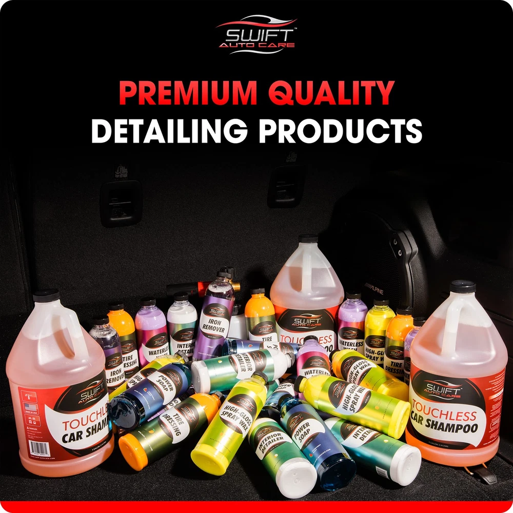 The Swift Premium Foam Cannon is a heavy-duty, top-of-the-line foam cannon designed for car enthusiasts who demand the best. It is made of the most durable materials on the market, ensuring that it will last for years of heavy use! One of the key features of the Swift Premium Foam Cannon is its wide-neck to easily fill your canister with any Swift soap products. Additionally, it has a knob that enables you to control the foam level, giving you complete control over the thickness and amount of foam produced. Designed to create clingy, thick, snow foam that will blanket your vehicle in thick layers of suds, loosening and lifting dirt and grime away from the surface. This ensures that your vehicle is thoroughly cleaned without the need for harsh scrubbing or abrasive cleaning methods that can scratch or swirl your paint. Using the Swift Premium Foam Cannon is incredibly easy. Simply fill it with your favorite Swift soap product, attach it to your pressure washer, and you're ready to go! The foam cannon is compatible with most pressure washers, making it a versatile tool that can be used by anyone. An absolute must for a detailing enthusiast! ✅AN AUTO DETAILING NECESSITY: A tool that every auto detailing enthusiast should have! Leave the bucket methods behind and ease your car/truck/boat washing experience with a premium foam cannon. Layers of thick foam create lubricity and help reduce the chances of harming your vehicles paint, wheels, trim, or other delicate surfaces. ✅SUPER EASY TO USE: Simply fill up the canister with any Swift soap or Swift foaming solution, click the ¼ connector into your existing pressure washer gun, adjust the knob for your desired foam level, and spray! (Twist knob clockwise for less water and thicker foam.) ✅ PROFESSIONAL, HEAVY-DUTY, AND LONG-LASTING: A thought-out design using premium materials and extreme attention to detail differentiate this foam cannon from the rest! From upgraded brass & stainless steel fittings, to a dual adjustable spray fan for vertical/ horizontal adjustments, all the way to a versatile foaming nozzle that fits regular 16 Oz Swift bottles besides the wide body canister. ✅ HIGH VOLUME CANISTER OR ATTACH SWIFT 16OZ BOTTLES DIRECTLY: Canister holds 1 liter of liquid, OR simply attach your 16 Oz Swift bottle instead of the canister. Perfect if two different soaping solutions are being used, saving you time on rinsing the canister. Mix either Swift Power Soap, Touchless Soap, or Ceramic Soap with water, and create blankets of snow foam! ✅ VERSATILE APPLICATION: Perfect for Car, SUV, Truck, Trailer, Motorcycle, RV, and fleet washing! Also use for jobs around the house like cleaning walkways, driveways, windows, roofs, and floors.