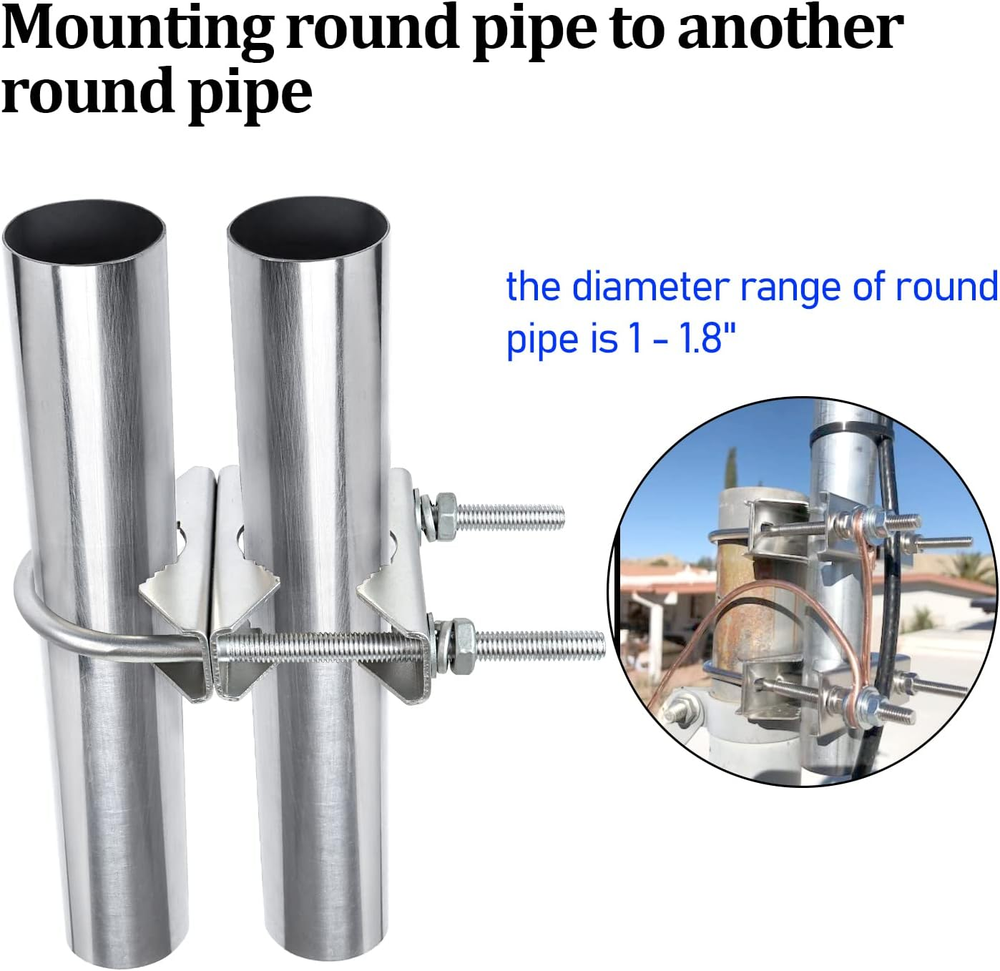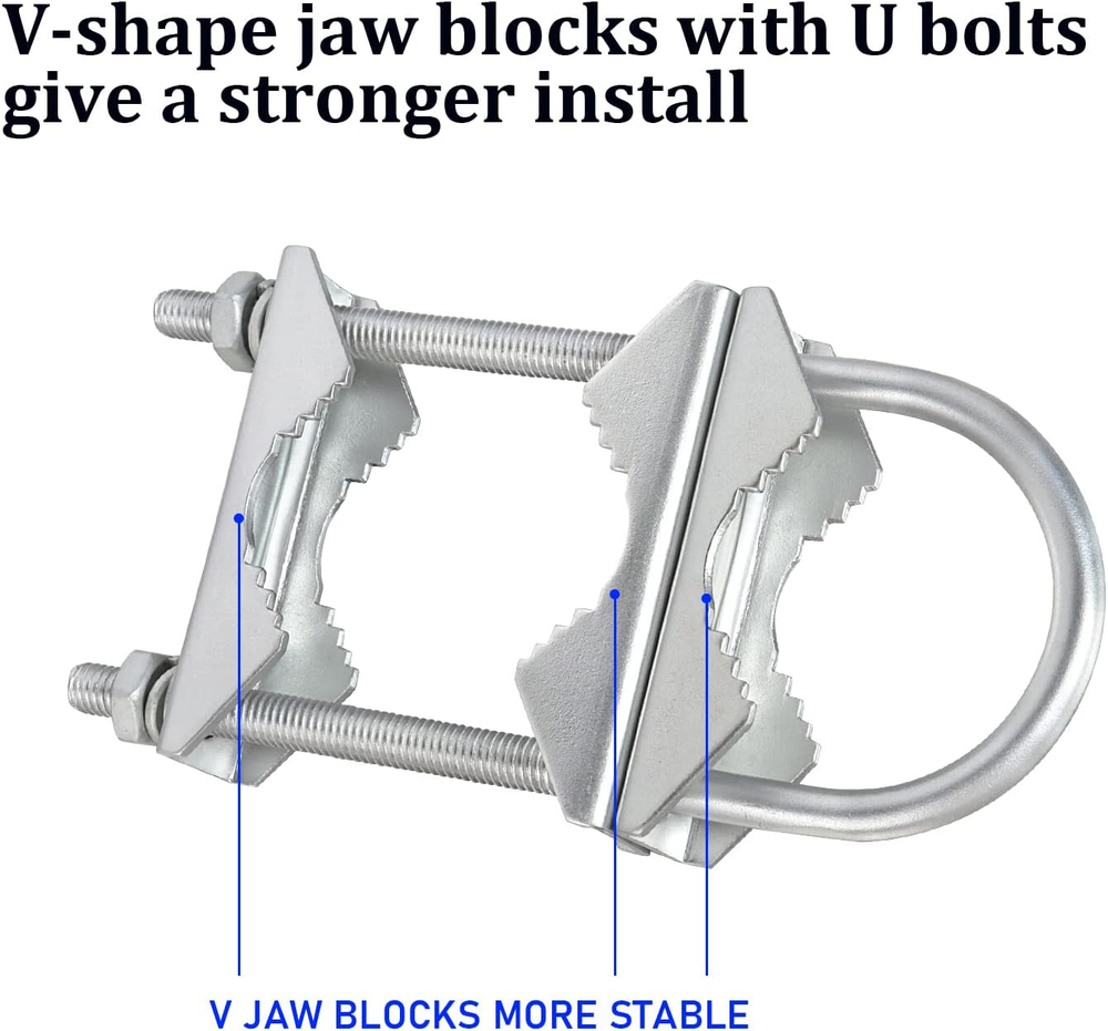 Store New Arrivals Add to Favorite View Feedback Contact Double Antenna Mast Clamp V Jaw Block with U Bolts, Heavy Duty Mast to Mast Description Item dimensions L x W x H 6 x 3 x 2 inches Color Silver Material Zinc-plated Iron Style 2 PCS Item Weight 0.25 Kilograms Product Dimensions 6 x 3 x 2 inches Nice Heavy Duty Clamps: The mast clamps are made of zinc-plated iron with anti-rust coating finish, prevent rusting in outdoor rainwater. The V-jaw brackets are what makes the assembly so good and secure in bad weather. Using the V jam brackets with U-bolt, the clamp kit can securely hold pipes and antenna tight in place, will not budge in the wind. Dimension: Support pipe with diameter raging from 0.98” to 2.1”/24mm-54mm The mast clamps are suitable to mount an antenna on a pipe/ pole, or attach one pipe to another pipe to mount an outdoor antenna. Quality hardware to connect 2 different sizes of pipe together. Package Includes: 2 sets antenna mast clamps (6pcs jaw brackets, 2pcs U bots, 4pcs nuts, 8pcs washers) Product Description Nice heavy duty Antenna mounting hardware! Quality hardware to connect 2 different sizes of pipe together. The V-jaw brackets are what makes the assembly so good and secure in bad weather. The double mast brackets handled two mast well, spaced to support the height and weight of the antenna/load. The antenna mast pole worked very well to join two pipes together when erecting satellite dish on a flag pole. Package Includes: 2 sets antenna mast clamps (6pcs jaw brackets, 2pcs U bots, 4pcs nuts, 8pcs washers) ABOUT US We offer the best prices around on high quality products. Our E-store includes media such as books, movies, music and games while offering electronics, toys, sporting apparel, clothing, tools, general home, garden items and more. SHIPPING We are always working hard to ensure your package arrives as soon as possible. Please understand that some factors like weather, high postal traffic, and the performance of shipping companies are outside of our control. We offer free shipping to the lower 48 states and ship within 2 business days of payment, usually sooner. We do not accept P.O. Boxes. Please provide a physical address. RETURNS We offer a 30-Day Return Policy on items which you are not completely satisfied with. You have the option for a full-refund or an exchange of the item. No returns are available on items shipped outside of the USA. PAYMENT We accept PayPal. CONTACT US This page content is yet to come Please ad us to your favorite seller and visit again later Thank You CUSTOMER SATISFACTION We try our very best to make sure every customer is completely satisfied. If there's a problem, message us! We're happy to help.