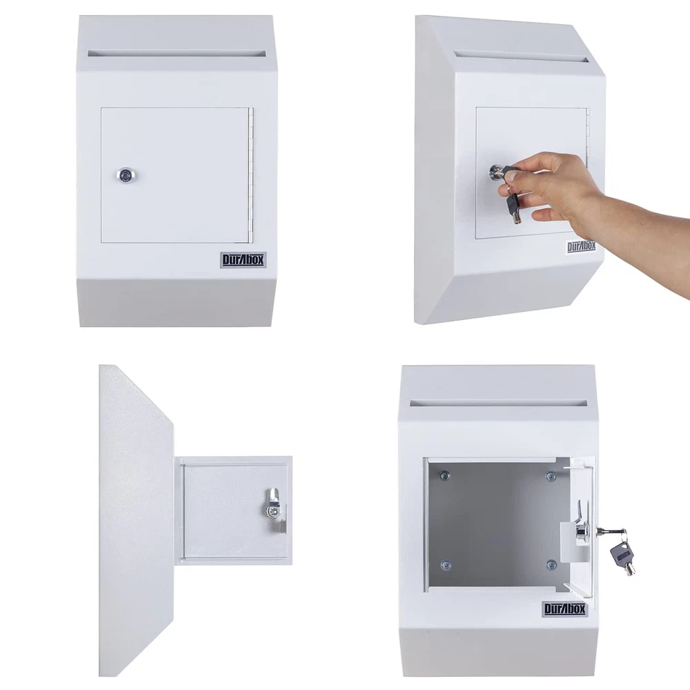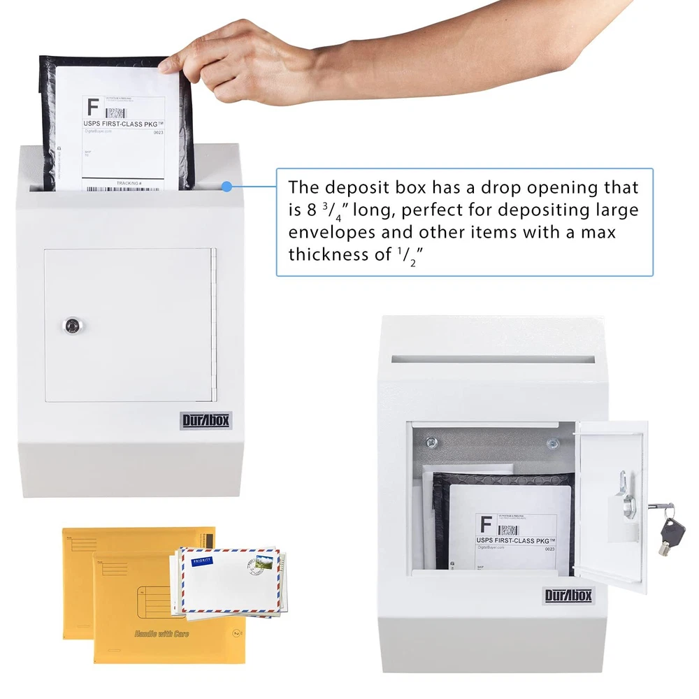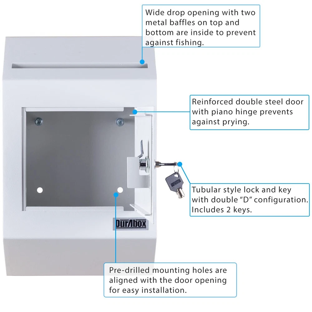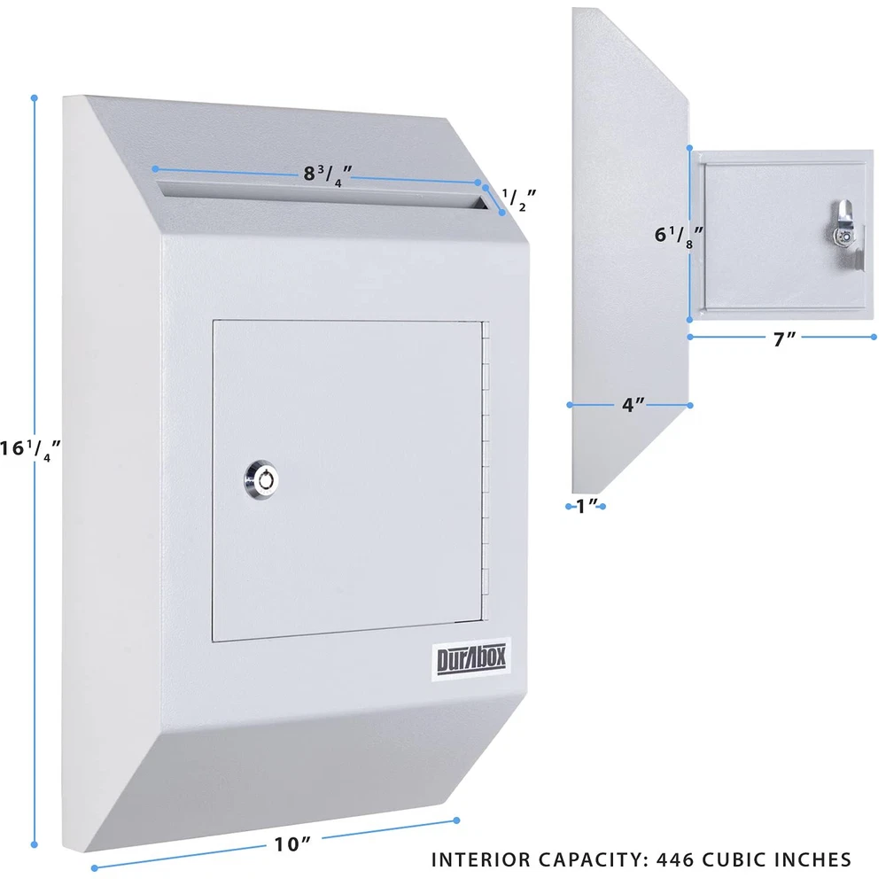 W300 letter size wall drop box with tubular key provides secure all-day storage for valuable or private items like money, checks, and mail. Keep important things locked away and protected from theft. The perfect solution for when in-person exchanges become impractical or impossible; pick up items at your leisure. Best suited for indoor use. The W300 wall-mount drop box features a piano hinge reinforced double steel door to prevent prying. Metal baffle inside the drop opening protects against fishing. Includes a pair of tubular keys that are harder to duplicate than standard keys for added security. 8-3/4" wide opening fits letter size envelopes. Pre-drilled holes on the back of the drop box align with the door opening for better tool access and easier wall mounting. Accommodates drop items up to 1/2" thick. Features: Maximum thickness of drop items is 1/2" thick Piano hinge with reinforced double steel door protects against prying Tubular style key lock with Double "D" configuration (can be retrofitted with other cam locks) Recommended for inside use only Metal baffle protects drop opening from fishing 2 tubular keys Pre-drilled mounting holes in back (includes hardware for wood/concrete) All 4 pre-drilled mounting holes align with door opening for easier installation Specifications: Exterior Dimensions: 16-1/4" H x 10" W x 4" D Collection Door: 7" W x 6-1/8" H Drop Opening: 8-3/4" W x 1/2" Door Thickness: 1/8" Capacity: 446 cu in. Weight: 12.2 lbs. Warranty: 1 Year Manufacturer (applicable when used indoors only) HEAVY DUTY - Durable wall-mount locking mailbox provides secure all-day depositing of valuable and private items such as cash, checks, letters, and payments. SECURE DEPOSITS - Full steel construction. Piano hinge with reinforced double steel door protects against prying and the two metal baffles above and below the inside of the drop chute prevent against fishing. Tubular lock and keys are difficult to replicate and provide an added layer of protection CAPACITY - Drop slot opening is 8-3/4" Wide x ½" High. Exterior Dimensions: 10" Wide x 4" Deep x 16-1/4" High. Interior Dimensions: 13" x 9-3/4" x 3-3/4" D VERSATILE - Constructed out of heavy-duty 14-gauge powder coated steel, the large safety deposit box is perfect for everyday and commercial use. EASY TO INSTALL - Wall mount locking mailbox includes installation hardware for both concrete and wood. 4 pre-drilled mounting holes align with the door to facilitate the installation process