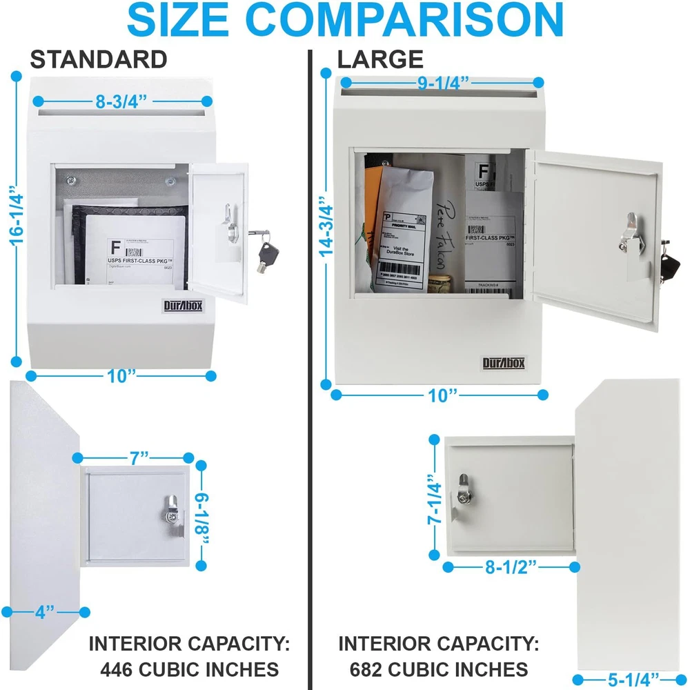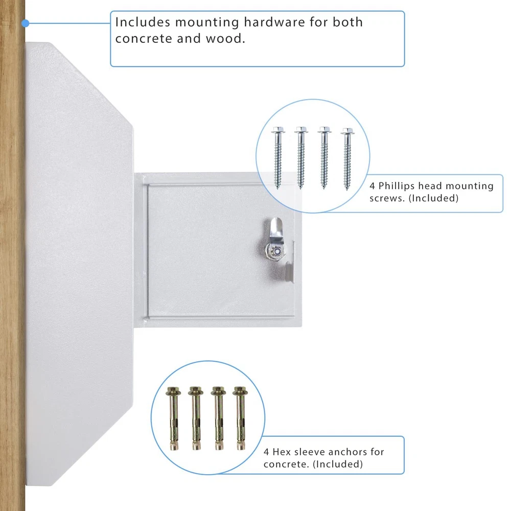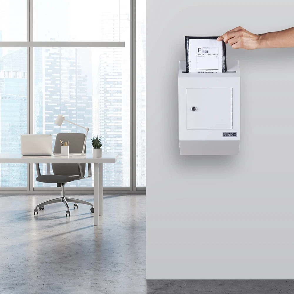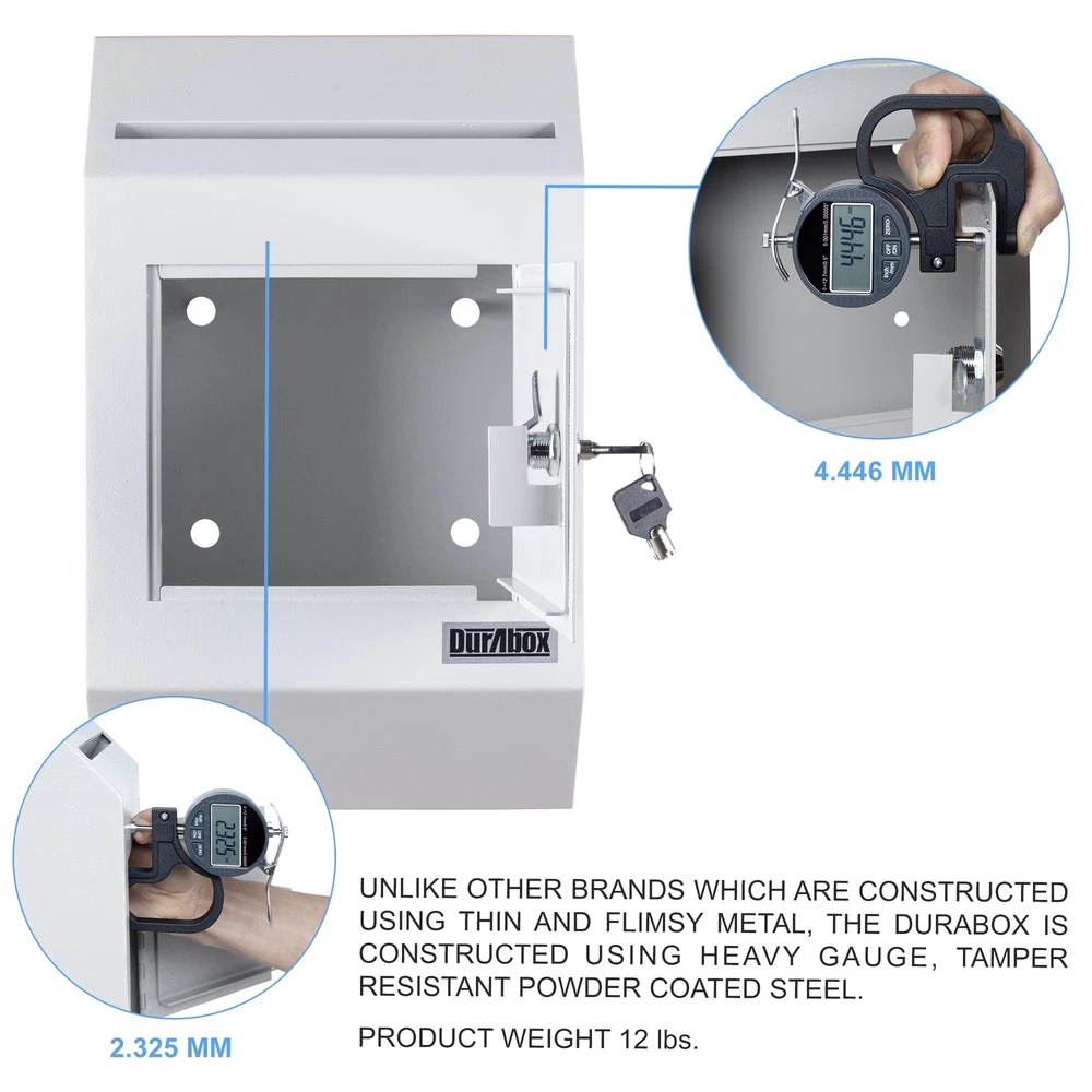 W300 letter size wall drop box with tubular key provides secure all-day storage for valuable or private items like money, checks, and mail. Keep important things locked away and protected from theft. The perfect solution for when in-person exchanges become impractical or impossible; pick up items at your leisure. Best suited for indoor use. The W300 wall-mount drop box features a piano hinge reinforced double steel door to prevent prying. Metal baffle inside the drop opening protects against fishing. Includes a pair of tubular keys that are harder to duplicate than standard keys for added security. 8-3/4" wide opening fits letter size envelopes. Pre-drilled holes on the back of the drop box align with the door opening for better tool access and easier wall mounting. Accommodates drop items up to 1/2" thick. Features: Maximum thickness of drop items is 1/2" thick Piano hinge with reinforced double steel door protects against prying Tubular style key lock with Double "D" configuration (can be retrofitted with other cam locks) Recommended for inside use only Metal baffle protects drop opening from fishing 2 tubular keys Pre-drilled mounting holes in back (includes hardware for wood/concrete) All 4 pre-drilled mounting holes align with door opening for easier installation Specifications: Exterior Dimensions: 16-1/4" H x 10" W x 4" D Collection Door: 7" W x 6-1/8" H Drop Opening: 8-3/4" W x 1/2" Door Thickness: 1/8" Capacity: 446 cu in. Weight: 12.2 lbs. Warranty: 1 Year Manufacturer (applicable when used indoors only) HEAVY DUTY - Durable wall-mount locking mailbox provides secure all-day depositing of valuable and private items such as cash, checks, letters, and payments. SECURE DEPOSITS - Full steel construction. Piano hinge with reinforced double steel door protects against prying and the two metal baffles above and below the inside of the drop chute prevent against fishing. Tubular lock and keys are difficult to replicate and provide an added layer of protection CAPACITY - Drop slot opening is 8-3/4" Wide x ½" High. Exterior Dimensions: 10" Wide x 4" Deep x 16-1/4" High. Interior Dimensions: 13" x 9-3/4" x 3-3/4" D VERSATILE - Constructed out of heavy-duty 14-gauge powder coated steel, the large safety deposit box is perfect for everyday and commercial use. EASY TO INSTALL - Wall mount locking mailbox includes installation hardware for both concrete and wood. 4 pre-drilled mounting holes align with the door to facilitate the installation process