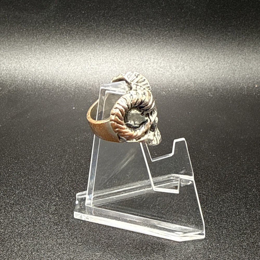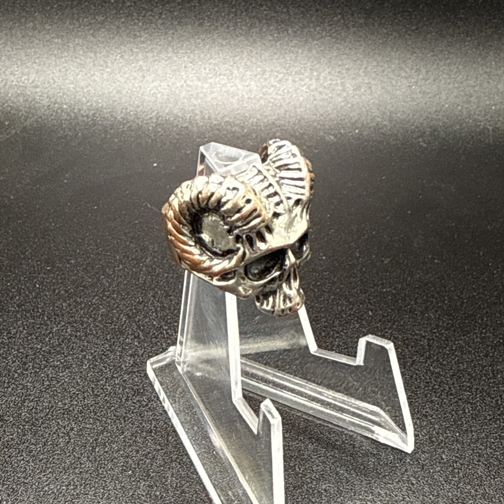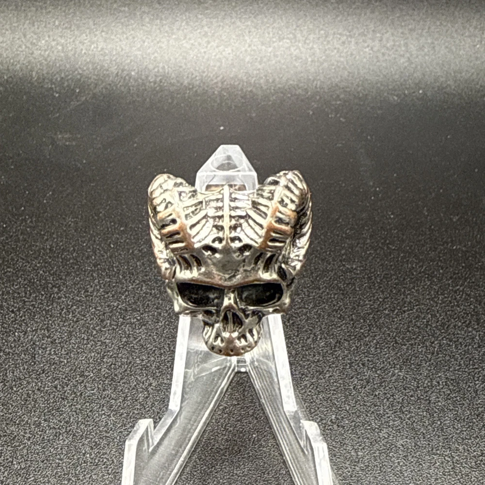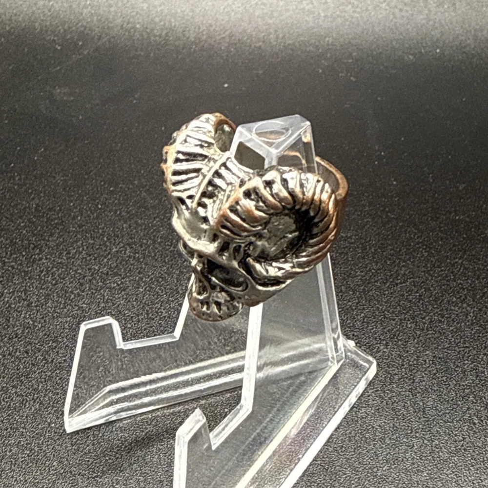 This Heavy Goat Skull Ring with Horns is a unique and stylish piece of jewelry designed for men. Made of stainless steel with a silver color, this band ring features a detailed design with goat skull and horns, making it a standout accessory. Perfect for special occasions like engagement, wedding, anniversary, and birthdays, it is a bold and eye-catching piece that can be worn for various events. Showcasing a striking and masculine style, this ring is a perfect gift for Father's Day or Valentine's Day. Sold as is. No returns.