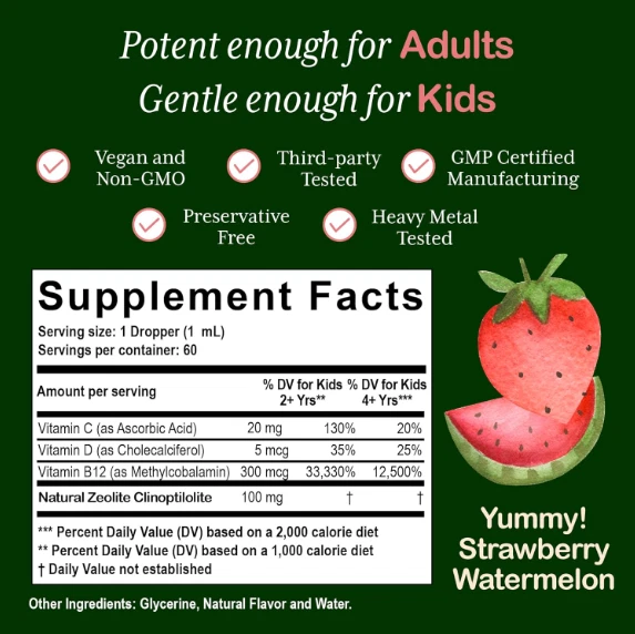 Heavy Metal Detox for Kids and Adults | Natural Zeolite Detox | Methyl Vitamin B US Warehouse - FREE & FAST Shipping in US Product Description: These statements have not been evaluated by the FDA. This product is not intended to diagnose, treat, cure, or prevent any disease or health condition. HEAVY METAL DETOX* FOR KIDS AND ADULTS: Zeolite liquid drops help support your kid's natural detox process by gently binding to and removing toxins and heavy metals. Gentle enough for kids, potent enough for Adults. DEVELOPED BY A MOM FOR MOMS: As a mom, I wanted the absolute best for my daughter. Zeolite Detox* was developed to provide a trustworthy option for kiddos. We are on a mission to provide high quality products and positively impact families everywhere. PURITY: Quality sourced, third-party tested, and manufactured in a facility that adheres to GMP guidelines, our product is Vegan, Preservative-Free, Sugar-Free, Gluten-Free, Soy-Free, Dairy-Free, non-GMO and contains no synthetic flavors or colors! ADVANCED FORMULA: Zeolite is optimized with Methyl B12, Vitamin D3, and Vitamin C, enhancing absorption + bioavailability and supporting Energy and Immunity*. May support the relief of brain fog and help support energy, mental clarity, and immunity.* KID-APPROVED FLAVOR: Our Kids Zeolite Detox supplement features a delightful strawberry watermelon flavor that kids absolutely love, making everyday a tasty and enjoyable experience! Shake well and drop drop drop! Feedback: 1.Any question for your order, please contact us in time, we will reply to you within 24 hours and give you a satisfactory answer. 2.If you are satisfied with our products and services, hope to take up your a little precious time to leave feedback reviews for our products.Thanks! 3.Your satisfaction is our effort. Welcome to order again! Have a great day! Our Policy: 100% Satisfaction Guarantee 20% of restocking fee will be charged for return item
