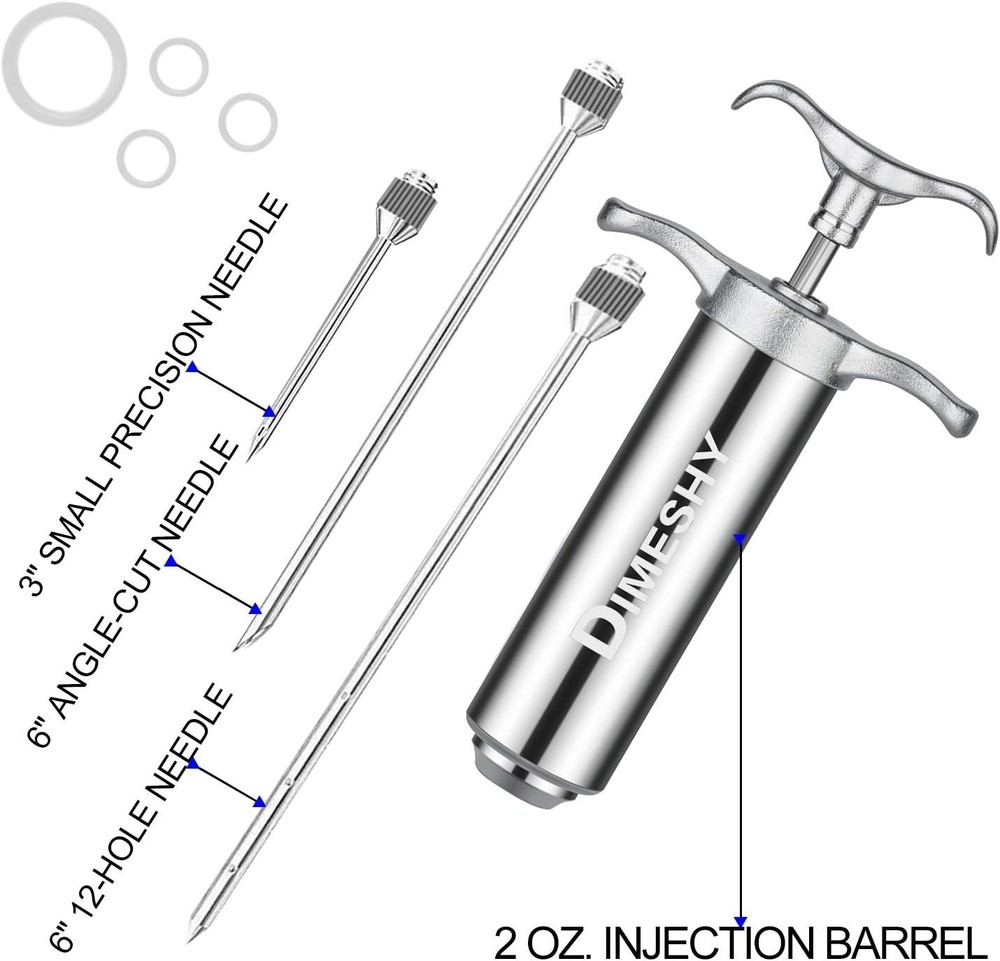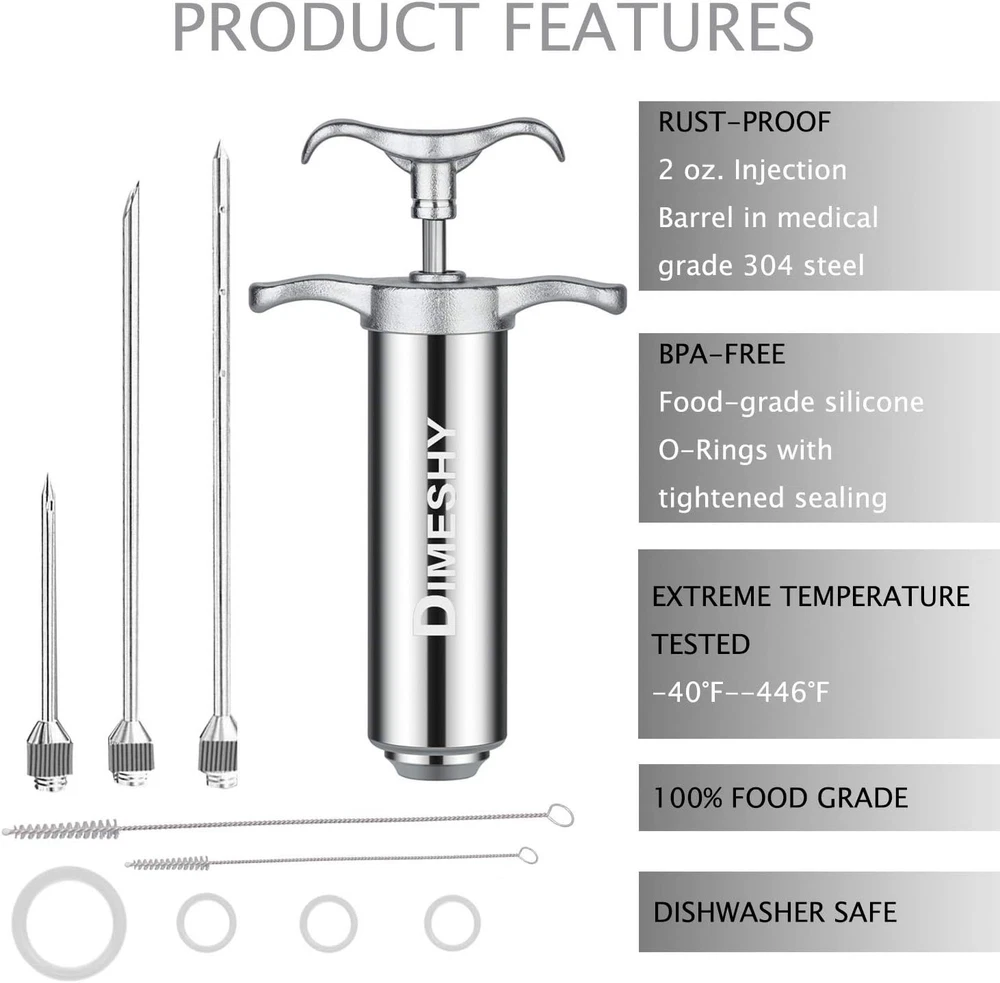 Heavy duty 304 Stainless Steel Meat Injector Kit with 2-oz Large Capacity Barrel with 3 commercial Marinade Needles PROFESSIONAL QUALITY: meat injector is made of 304 stainless steel and with three ring handle, that give you a better grip. Healthy and safe, no rust, no corrode, no bend or break,you can easy puncture the meat with this marinade injector without blocking. SPECIALLY DESIGN with three Seasoning needles, one with side holes for liquid marinades, one needle with large end hole for minced garlic, onion, solids and another short needle for the chicken. marinade injector is perfect for intensifying the flavor of brisket, pork, chicken, turkey, lamb, goose, duck, and more! EASY DISASSEMBLY AND CONVENIENT CLEANING. This marinade injector is Dishwasher SAFE, making clean up super easy NO MORE CHEWY AND BLAND MEAT. With our () perfectly crafted meat injector every bite of the meat is flavorful and juicy. Use it to marinade softer meats like chicken or turkey or use it to marinade lamb or steak. Its sturdy design ensures that you get the same flavorful taste on any meat you love. is a Good kitchen product and meat injector sale long s, it can keep you good service and quality. HIGH QUALITY MEAT INJECTOR Notice: 1. To utilize this Seasoning Injector better, Please clean the meat syringe before If it is difficult for you to press, please add it some oil to make it easier to use. After a certain time, the situation will be KEEP OUT OF THE OF CHILDREN! Because the marinade needles are pretty sharp!4. Seasoning herbs should be grounded up to be quite smaller than needle holes.