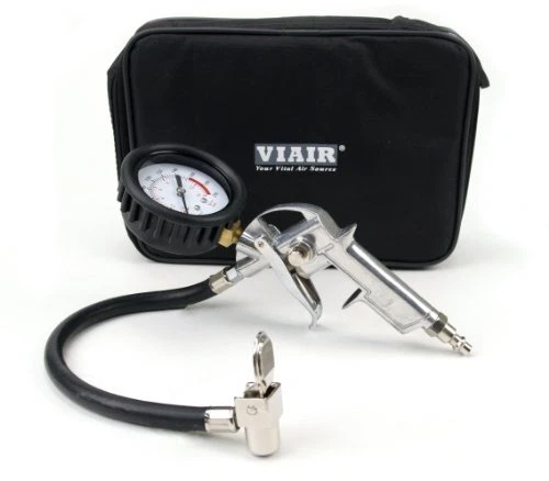 Featuring a normally closed air chuck, the Tire Inflation Gun is a perfect complement to any onboard air systems and VIAIR’s line of “Portable Automatic” compressors. Comes with a deluxe carry bag, available in with a Digital gauge, or analog versions with 160 or 200 PSI gauges. Tire Inflation gun with 2.5" white face gauge, includes protective rubber boot on the gauge for better durability. Reads up to 200PSI or 14 BAR Integrated bleeder valve for pressure adjustment 12 inch Rubber Air hose with a clamp on tire chuck. Standard industrial size quick connect stud pre-installed Folding lever air chuck Deluxe storage bag included
