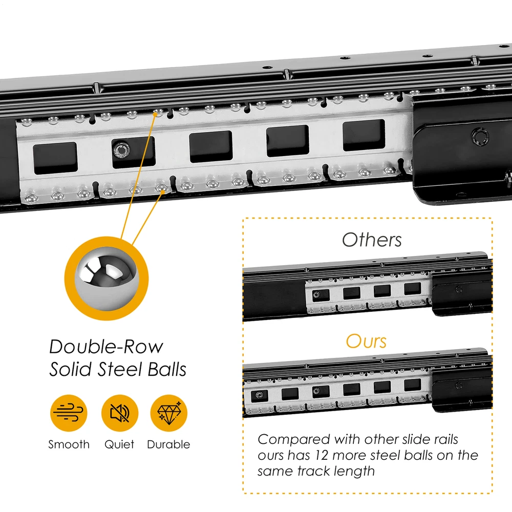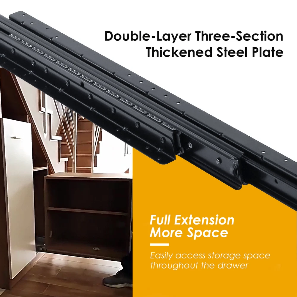 Store category Sign Up Now ! You may also like Product Description Bullet Points: Wonderfully Strong: With a heavy load capacity of up to 260lb, these undermount drawer slides are constructed from high-density, high-strength 2mm thick cold-rolled steel and industrial solid steel balls for enduring years of use, ensuring durability and strength Smooth Operating: With an electrophoretic coating process that minimizes friction and resistant, this undermount drawer slide features industrial-grade solid steel balls for quieter, smoother, and more efficient sliding. Made from rust-proof materials, it's built with durability in mind Maximized Space: The undermount drawer slides can be easily extended, giving you ample space to access everything in your drawer with ease. With a larger storage area, you can store more items than ever before, making organization simple Effortless Glide: Featuring 12 additional steel balls in the same track length and anti-collision silencers, these undermount drawer slides assure a gently sliding motion, reducing noise while being strong and less likely to jam, making every open and close more labor-saving Improved Stability: Our undermount drawer slides assure a smooth, glide-like movement for sundry cabinets, stair cabinets, and any tall or heavy storage cabinets, allowing for an effortless operating every time. With versatile compatibility, they suit a wide range of cabinets This bottom mounted drawer slide is perfect for storage cabinets. It allows for full extension and can handle a heavy load of up to 265lbs. The design minimizes friction resistance, ensuring a smooth glide each time. It's strong and not easily prone to getting stuck. A great upgrade for your cabinet needs. Specifications: Product name: Heavy Duty Drawer Slides Product size: A about 600 mm/23.62 inches, suitable for cabinet depth 650mm and up B about 800 mm/31.5 inches, suitable for cabinet depth 850mm and up C about 1000 mm/39.37 inches, suitable for cabinet depth 1050mm and up Stretching range: 600-1450/800-1850/1000-2250 mm Maximum load: about 120kg/260lbs Packing quantity: 1 pair Color: Black Track width: about 82mm/3.2inches Packing List: 2* Cabinet Drawer Slides 2 packs* Screws Notes: 1. Due to different lighting and screen settings, the item color may be slightly different from the picture. 2. Due to different manual measurements, please allow a 1-2cm difference in size. Payment Delivery details Terms of sales About us Feedback & DSRs Payment Before you palce an order, please kindly make sure that you have a paypal account. We accept PAYPAL payment only. Payment should be completed within 2 days after auction closed, or unpaid dispute will be filed for an closing auction. An unpaid case will be filled after 4 days. Delivery details We ship to your eBay address. Each package will be shipped to US by UPS Regular Parcel with tracking number. Please check your shipping address carefully before checkout, it can't be changed if order completed. All items will be shipped within 1-2 business day upon receipt of payment.Orders placed on weekend will be shipped within 3 days. If you do not receive your item in 7-10 business days.please contact us immediately for further assistance. We will be responsible for any damages or losses incurred in the shipping process. About us We maintain high standards of excellence FIVE STAR and strive for 100% customer satisfaction! Positive Feedback is very important to us. We hope that you contact us immediately Before you give us neutral or negative feedback, so that we can satisfactorily address your concerns. We promise to offer the lowest price and high quality produce. Our working time: From Monday to Friday(9:30 am to 18:00pm), we don't working on holidays ,hope you can understand and know that , thank you. Please always talk to us via ebay Message. We appreciate your business and look forward to growing our e-Bay sales with satisfied customers. Feedback Contact us If you have any questions, please feel free to contact with us by ebay Message during our business hours ( 9:30a.m. to 5:30 p.m.), or email us through eBay, we will try our best to help you to resolve it. For any presale or after-sale questions,please do feel free to email us! Due to the time difference, each email will be replied within 1 working day,and weekend will be delayed a bit. Feedback