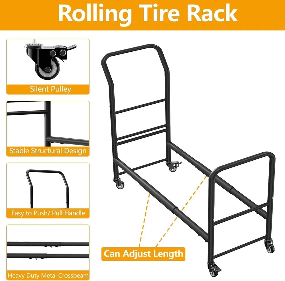 About this item • High Quality Materials: The metal tire rack be made of cold rolled metal steel,the feature is wear-resistant and corrosion-resistant,the tire framework with thickened round pipe and no sharp edges,that to prevent scratches on tires, stable and firm, it isn't easy to shake,easy to push and pull,and long service life • 4 Universal Silent Wheels: The tire storage rack pulley can be 360 ° rotatable, 2 lockable wheels, translatable and brakeable universal wheel,the quality rubber caster wheels easy to push and pull, durable and wear-resistant,and it's convenient to move the trailer or fix it to the position you want to park • Push-pull Handle Design:The tire trailer design with humanized handle, which is very suitable for transporting tires or heavy objects,easy to push and pull, saves effort, and better improves efficiency,can transport four tires at a time,such as the light truck SUV tires, RV and ATV tires etc, convenient and practical • Sturdy & Stable: The tire storage rack designed to provide easy access to the tires.Perfect size design to ensure you can easily place and remove tires.The tire storage rack is stable and secure, even when fully loaded.You can use the tire rack easily to store car or motorcycle tires,to prevent tire deformation,and save space in the garage, workshop or basement, and keep the garage tidy and clean • Multi-purpose: It is easy to install,the tire rack widely application to maintenance workshop, or displayed at the entrance of the tire store.It is very suitable for car shops and family garages.The tire storage rack can be used for other purposes, such as storing and transporting other types of equipment or materials Pushable Metal Rolling Tire Rack Cart with Wheels The rolling tire rack is a versatile and well-designed solution for storing and moving various types of tires. This tire rack organizer is ideal for saving space in garages, workshops, automotive stores, auto repair shops, or basements, and keeping your garage tidy. Product Size Product Overall Dimensions: 43.3 in L * 13.7 in W * 34 in Wear-resistant Corrosion-resistant Easy to Push 360 ° rotatable pulley The tire trailer design with humanized handle, which is very suitable for transporting tires or heavy objects,easy to push and pull, saves effort. The tire storage rack is easy to install,designed to provide easy access to the tires.Perfect size to ensure you can easily place and remove tires. The metal tire rack maximum bearing 330 LBS,and it can transport four tires at a time,such as the light truck SUV tires, RV and ATV tires etc. The tire rack pulley can be 360 ° rotatable,translatable and brakeable universal wheel,the quality rubber caster wheels easy to push and pull. Store the rack safely indoors in the garage or outdoors in all seasons, it prevents tire deformation Widely Applications Shipping We offer FREE shipping on all orders! We ship within Three business days of payment, usually sooner. We use a selection of shipping services such as UPS, FedEx, USPS etc. We only ship to the lower 48 states, no APO/FPO addresses or PO Boxes allowed. Local pickups and combined shipping options are not provided at this time. Return You can return a product for up to 30 days from the date you purchased it. Any product you return must be in the same condition you received it and in the original packaging. Please keep the receipt. Payment We accept payment by any of the following methods: PayPal Please pay as soon as possible after winning an auction, as that will allow us to post your item to you sooner! Feedback Customer satisfaction is very important to us. If you have any problem with your order, please contact us and we will do our best to make you satisfied. Contact Us If you have any queries, please contact us via ebay. We usually respond within 24 hours on weekdays. Please visit our eBay store to check out other items for sale! Thank you for shopping at our store. Disclaimer We are working with different suppliers in USA to deliver the item to your doorstep. If you have any issues regarding the item, Feel free to ask.
