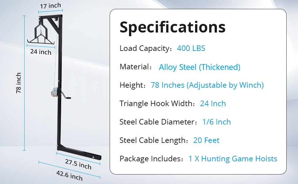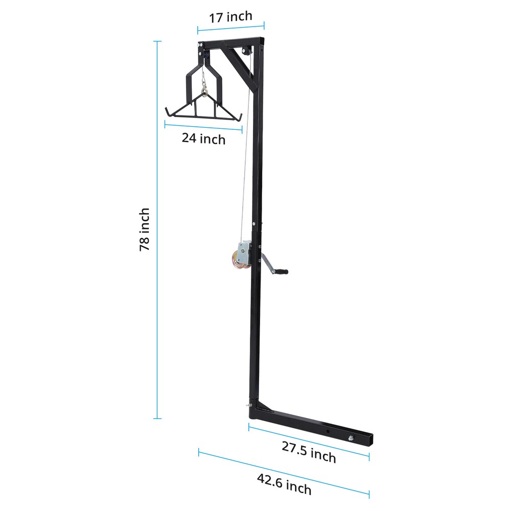 Specifications: Color: Black Vehicle Service Type:Truck Material:Alloy Steel Finish Type:Powder Coated Load Capacity:400 LBS Height:78 Inches (Adjustable by Winch) Triangle Hook Width:24 Inch Steel Cable Diameter:1/6 Inch Steel Cable Length:20 Feet Features: 【Height Adjustable】 This deer hanger for skinning is equipped with a self-locking lifting winch, which can easily lift the prey to the appropriate height and lock it, or lift the cargo to the pickup truck. 【400 LBS Load Capacity】 Our deer hoist is made of high-strength alloy steel structure with a load capacity of up to 400 LBS, which can easily hoist any deer and other large game animals. 【Stable Triangular Hook】 The deer hoist hitch adopts a stable triangular support design, and the ratchet fixing piece at the top can catch the triangular hook to prevent it from shaking left and right. 【360° Flexible Rotation】 The threaded lock pin at the bottom of the support rod can adjust the support frame to rotate 360°, making it easier to control prey or cargo. 【Wide Range of Uses】 This deer hoist for truck can not only be used to hoist prey when hunting outdoors, but can also be used to lift heavy objects in daily life. One person can easily solve the problem of lifting and carrying heavy objects. Payment Delivery Returns Feedback We accept Payoneer only. All major credit cards are accepted through secure payment processor PayPal. Payment must be received within 7 business days of auction closing. If you have bought multiple items from me, you can send me one payment for all the items instead of paying for them individually. When you click the Pay Now button, eBay will automatically determine if there are other items you have won or purchased from me and will combine them for your review. NOTE: Import duties, taxes and chargers are not included in the item price or shipping charges. These charges are the buyer's responsibility. Please check with your country's customs office to determine what these additional costs will be prior to bidding buying. 1. We will delivery out at the handing time when we receive the payment. 2. The delivery time is 3-5 business days to US by usually time.The parcel maybe delay 1-2day of the weekend.Due to the bad weather,Holidays,Hot Season ect.the parcel maybe delay,If you have any problems,mssage us,we will try our best to solve it. 3. We ship to your eBay address. Please make sure your eBay address is correct before you pay. 4. If you want to change the shipping address,message us before our send out. 5. We cannot deliver your order if your state is PR. 1. If you donot receive the items at the delivery time,the parcel has broken/missing,Please message us before you open case/return,we will try our best to solve it. 2. We offer a 30 day return policy from checkout winning date. 3. An RMA number is required for all returns. Message us for return instructions. Items Returned without a RMA number will not be processed. 4. Items defective upon receipt must be packaged in their retail packaging as if new and returned with a detailed description of the problem. 5. Return shipping fees are not refundable.We reserve the right to decline any returns if the above guidelines are not followed. If you are not satisfied with the item for any reason, please do not quick to leave negative/neutral feedback even open request and case without any communication with us. We devote ourselves making EVERY CUSTOMER in 100% Satisfactory and resolve any problem. Thank you for your understanding and recognition,we are always leave positive feedback to all our customers. About Reply: All replies will be sent to your email box, if you do not get response within 24 hours (Sat. & Sun. excluded) please check your eBay My Messages in case that our emails will be filtered automatically by your settings.