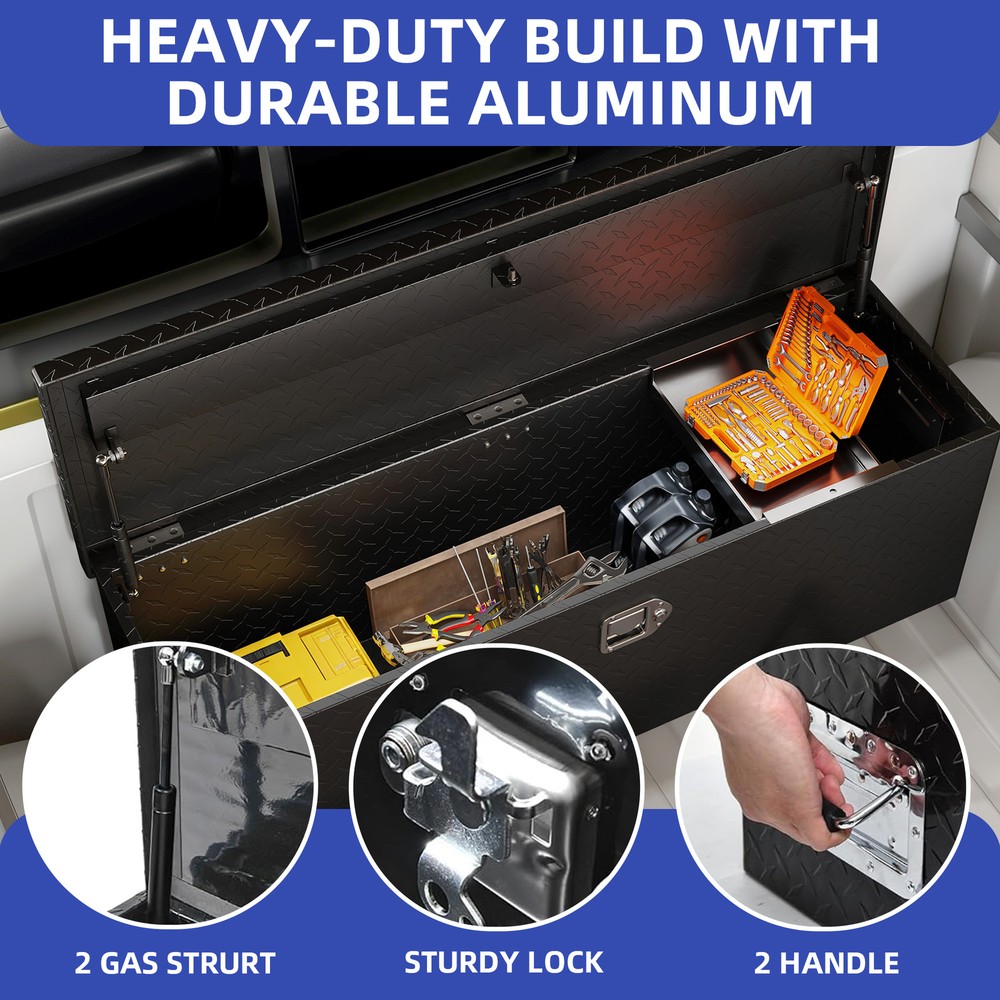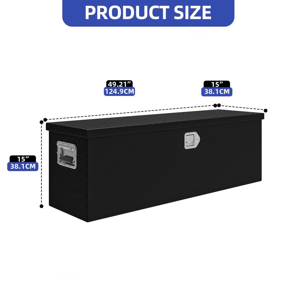Heavy-Duty Tool Boxes 49"x15" Sliding Shelf Chest Storage Lockable Pickup Truck Product Description NOTE: Professional Installation would be Highly Recommended. Description: 1. Color: Black 2. Material: Alumunium 3. Product Type: Tool Box 4. Shape: Rectangular 5. Finish: Powder Coating 6. Special Features: Heavy-Duty Tool Box, Durable Alumunium, 2 Gas Sturt, Sturdy Lock, 2 Handle, Metal Sliding Shelf, High-Performance Sealing Features: Effortless Access with Sliding Shelf & Gas Struts: Stay organized with a built-in sliding shelf, making it easy to locate small tools quickly. Dual gas struts allow for smooth, hands-free lid opening, providing full visibility and easy access to your equipment. Heavy-Duty Aluminum for Maximum Durability: Built from high-density aluminum with a non-slip surface, this toolbox delivers exceptional strength, stability, and oxidation resistance, ensuring long-lasting performance even in tough environments. Secure, Smooth & Built to Perform: Keep your gear protected with a robust locking system, while stainless steel handles offer easy, rust-resistant portability. The gas strut lid opens smoothly for instant, stable access —perfect for quick grabs on the job. Whether in a truck, garage, or workshop, this toolbox delivers secure storage and effortless functionality wherever you need it. Weatherproof & Rust-Resistant Protection: Engineered with professional-grade sealing strips and a durable powder coating, this toolbox offers superior water and rust resistance, keeping your tools dry, secure, and protected in any weather condition. Versatile Storage for Any Application: Designed for pickup trucks, trailers, RVs, and warehouses, this toolbox extends your storage capabilities, ensuring your tools remain organized, secure, and within reach wherever the job takes you. Dimensions: 1. Product Dimensions: 49"L x 15"W x 15"H 2. Sliding Shelf Dimensions: 11.02"L x 13"W 3. Item Weight: 33.7 lb Package Included: 1 x Tool Box 1 x Assembling Hardware Kits 1 x Instruction Manual Book Shipping 1. Normally the item will be dipatched within 1 business day if payment is cleared before 12pm PST. 2. Please verify the correct shipping address in your PayPal account before making the payment. We only dispatch the item to the address that is sent to us at the time of checkout. 3. We don't ship to Hawaii, Alaska, Puerto Rico, APO/FPO/PO Boxes. 4. We don't provide local pick-up service. 5. Normally we will use USPS, UPS, FedEx & LTL to dispatch items. Payment 1. We accept PayPal and credit card. 2. We will ship to the confirmed Paypal shipping address that is provided with the payment only. Return 1. 30 days Money Back Guarantee. 2. Please contact our customer service to receive a RMA form first if want to return the item. 3. All returned items MUST in new condition with the original package. Contact If has any problem, please contact us by sending an ebay message. Our customer service will resolve the problem as soon as possible. On Mar 26, 2025 at 05:58:14 PDT, seller added the following information: