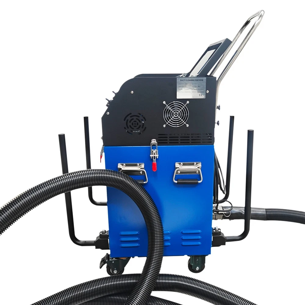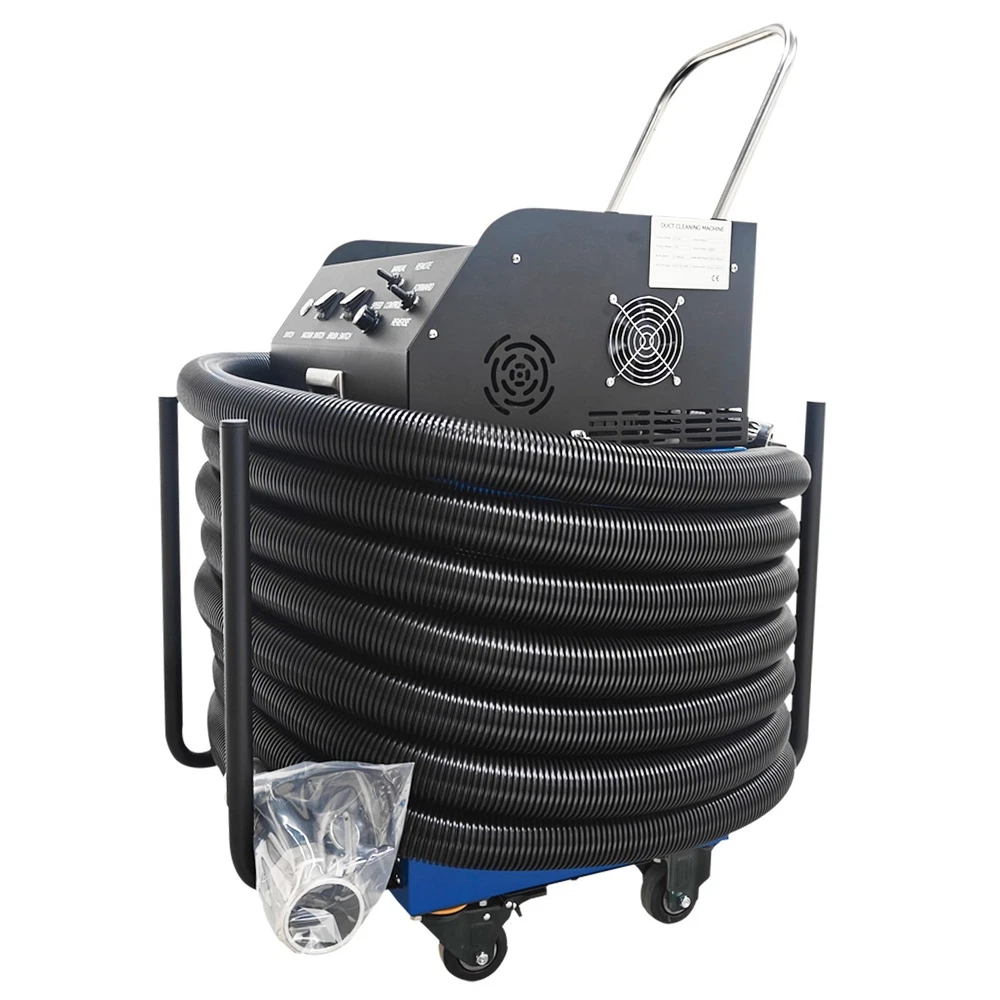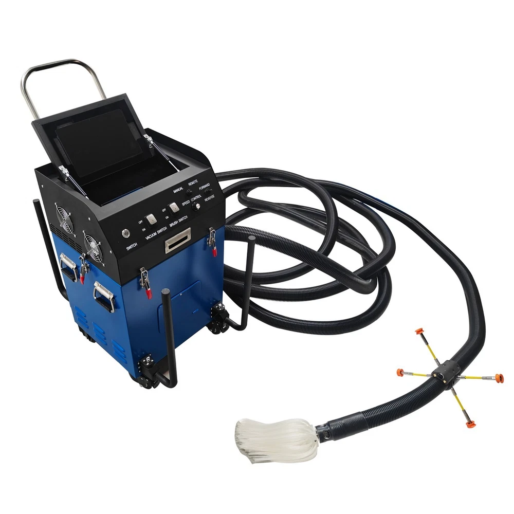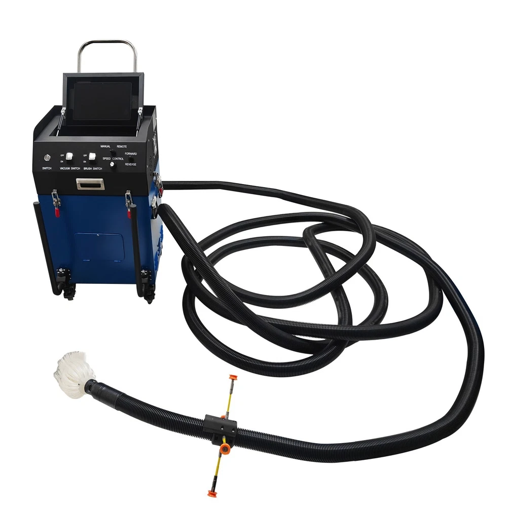 Air Duct Cleaning and Suction Integration Machine Duct Cleaning Machine 110V Product Overview This is an efficient ventilation duct cleaning machine. The brush disc is driven by a flexible shaft to rotate so as to loosen dust, the vacuum cleaner at the front end simultaneously sucks the dust into a collection bag, achieving simultaneous cleaning and dust suction. The machine is equipped with a high-definition camera, and the operator can observe the duct interior operation conditions in real time and records videos for documentation. The whole duct cleaning machine is small in size and light in weight, can be operated by a single worker to accomplish duct cleaning in hotels, restaurants and similar places and is an ideal choice for air duct cleaning and maintenance. Product Parameters Voltage 110V/60Hz Power 2800W Rotating Speed 0-1000rpm Applicable Duct Diameter 100-800mm (3.9-31.5 inches) Length of Flexible Shaft 15m (49.2ft) Guide Supports 15.5cm*4pcs, 21cm*4pcs Size of Flat Panel Display 11in Camera 2-megapixel high-definition wide-angle camera Remote Control Range of Remote Controller ≤ 24m (78.7ft) (Unobstructed) Note: For transportation safety, no batteries are included in the remote controller. Please prepare batteries by yourself. Precaution 1. Before starting the machine, ensure the flexible shaft is fully extended. Failure to do so will twist off the shaft core. Any accessory damage caused by this will be at the customer's own expense for replacement parts. 2. Wear safety goggles and protective gloves before operation. During operation, do not touch the transmission device to avoid danger. 3. Place the machine on a clean, dry and stable ground. Keep the machine clean at all times. 4. Do not operate the machine when the environmental temperature is above 40˚C. 5. The machine must be grounded. Ensure the power supply matches the rated voltage of the machine. 6. If the tablet computer is not in use for an extended period, fully charge it before turning it off. Recharge it fully and power it on to activate it once every other month. 7. After operation, clean the dust bag timely to prevent reduced suction power or damage to the fan. 8. Handle the camera with care to avoid collision damage during use. Product Features 1. The machine is suitable for comprehensive sweeping and dust suction of round ducts, rectangular ducts, horizontal ducts, vertical ducts and other ducts, has a wide applicable diameter range of 100-800mm, and is applicable to most commercial and industrial ventilation systems. 2. The machine is equipped with a 2800W high-power motor and dual negative-pressure fans with a large air volume of 2000m³/h, ensuring the powerful vacuum suction. 3. The machine features a high-definition camera for real-time monitoring and video recording, and is equipped with a 160˚ wide-angle lens to clearly display the cleaning effect inside the duct. A branded tablet computer is designed for lossless HD image transmission, enabling intuitive quality control. 4. The suction and cleaning integrated machine can be operated by a single person, reducing the labor cost and improving work efficiency. 5. The main unit is equipped with a hose winding support frame, which effectively stores the flexible hose, saves the storage space and facilitates transportation and on-site transfer. Control Panel The control panel is of an integrated structure, achieves independent control over vacuum suction, brush operation, speed regulation, mode selection and rotation direction control, is clear and visual in function division and effectively avoids misoperation. Flat Panel Display The 11-Inch flat panel display enables the operator monitor to observe and monitor the duct interior cleaning state in real time, effectively improving the cleaning quality and effect. It is convenient to store and resistant to dust and collision. Filtering Assembly The wrinkle type filter materials are adopted to substantially increase the effective filter area and effectively filter various pollutants away. The filtering assembly is matched with the fans to prevent dust from entering the machine and prolong the service life. Flexible Shaft The 15m flexible shaft is used in conjunction with the brushes and guide supports to achieve effective cleaning and dust suction. It can be effectively wound and stored, greatly saving space and keeping the environment clean and neatly. Fixing Buckles The fixing buckles can be quickly tightened and released to achieve combination and separation of the top unit and the box body, facilitating dust removal and maintenance, improving the operation efficiency and ensuring the operation safety. Universal Wheels The machine can be easily pushed to move in different working environments through the universal wheels, and the flexible movement and environmental adaptability are greatly enhanced. The brake design achieves stable fixing of the machine on site. Operation Method 1. Take down the flexible hose, connect one end of the hose to the main unit, and ensure the buckle is tightly connected. Install a brush head with the appropriate size at the other end according to the working conditions. 2. Install the guide frame suitable for the duct around the camera. 3. Ensure the dust bag is installed in place to prevent dust from damaging the fan. 4. Start the machine, connect the main unit to the tablet computer. Place one end of the brush head into the duct and start operation. 5. Clean the dust bag after the operation is completed. Product Display Item Included (022869): 1 x Air Duct Cleaning and Suction Integration Machine 110V Shipping & Handling Details Default Shipping Cost or Free Shipping Information: Default shipping cost or free shipping service is only for the lower 48 United States by UPS Ground or USPS. Other areas or needs other shipping ways, please contact us. Buyers from Guam, Puerto Rico, Virgin Islands, American Samoa, Alaska, Hawaii, PO Boxes, APO/FPO addresses or other countries/are