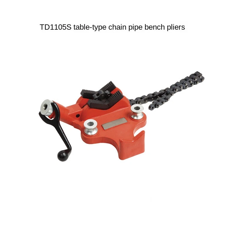 TD1105S2.5/S4/S5/S6 Benchtop Chain Pipe Bench Vise with Cast Iron Base and Crank 6 Inch Screw Table Manual Vise Clamping Bend Name: Chain pipe pliers About this product Features and details 【High capacity】 Bench vises have a large pipe capacity and are used to secure pipes from 1/8 to 5 inches (3.2 mm to 127 mm). The vise grips pipe easily and smoothly over a range of diameters. [Frame is sturdy and durable] This 5-inch pipe vise is designed with a heavy-duty cast iron base, neoprene-coated jaws, and heavy-duty chain for superior stability and durability for a long life. [Fatigue-free operation] With the hand crank, you can use this home bench vise effectively. You can use steel handles and chains to securely secure the pipe and hold it in place. 【Easy to install】 The chain clip mounts easily and quickly to any safe surface such as a workbench, truck or tripod. It's small and light. 【 widely used 】 Vise is suitable for fixing and bending large pipes and other bulky materials and is widely used in industry or home.