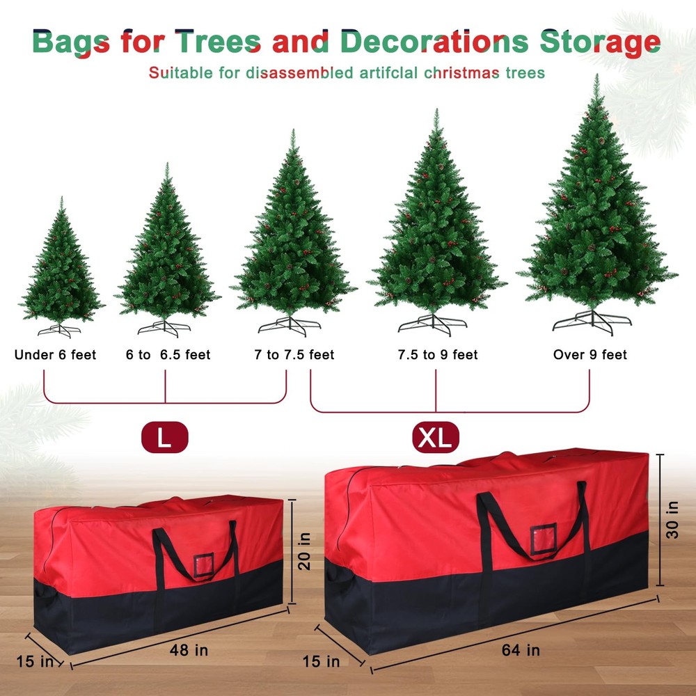 SPACIOUS DIMENSIONS: Our Christmas tree storage bag is designed to accommodate trees up to . With ample room, it ensures your tree fits comfortably, making it an ideal solution for your Christmas tree as well as Christmas ornaments storage needs. HEAVY-DUTY CANVAS: Crafted from high-quality, tear-resistant material, our storage bags have been upgraded to be more secure at the seam locations of the easy-to-break carry handles. Protect your organizing items year after year PROTECTS YOUR TREE: Shields your tree from dust, moisture, and pests. The Christmas tree organizer has a waterproof lining to keep your tree new. Sturdy construction protects your tree during storage and transport CLEAR STORAGE: This organizer bag is great for Christmas trees and other items like heavy clothing, bedding, and large toys, etc., suitable for use all year round. Featuring a clear label slot, you can easily identify the contents of your bag for storage EASY ACCESS: Double zippers allow the bag to be opened wide for easy placement and removal of the split Christmas tree. Equipped with front and back carry handles for easy removal in addition to the two necessary carry handles