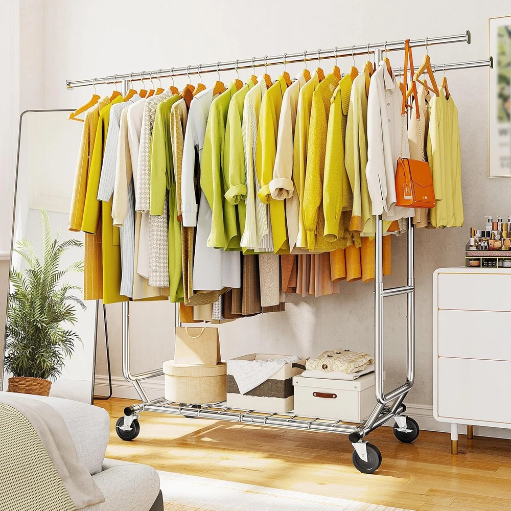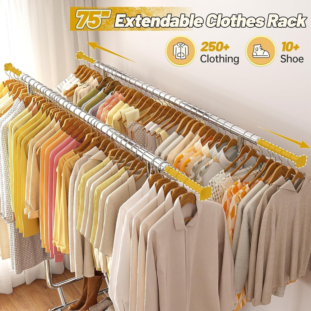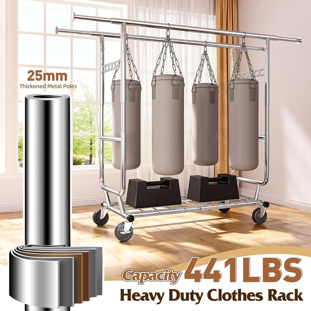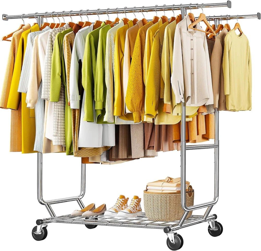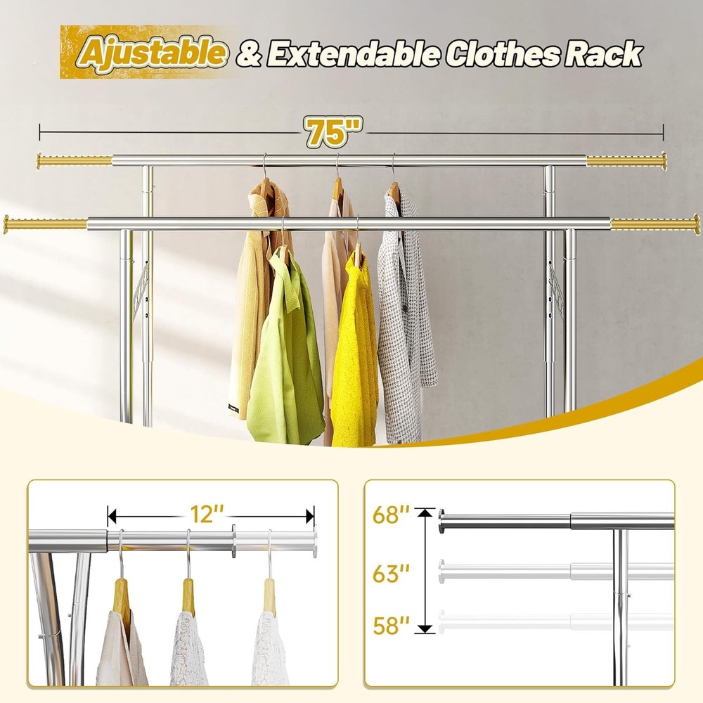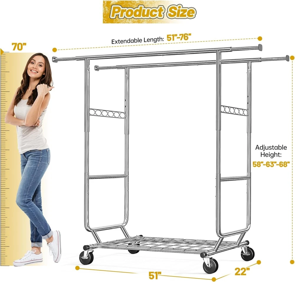 Product Description About this item 【Heavy Duty Clothes Rack】Our clothing racks for hanging clothes are made of heavy duty steel with chrome finish. 25mm thick metal with coating, which makes this clothing rack much thicker and sturdier. With a maximum load capacity of 441 lbs, it remains rigid and stable — outperforming ordinary rolling racks without bending or wobbling. 【Adjustable and Extendable Clothing Rack】Designed with adjustable metal tubes, this clothes rack can be extended from 51.5" to 75.5" in width and adjusted to three different heights: 58.5", 63.5", and 68.5". Offering significantly more hanging space than traditional racks, it's an efficient, space-saving solution for homes and retail environments. 【Dual Rod & Extra Storage】The dual-rod layout provides double the hanging capacity without taking up extra floor space. Its sturdy structure remains stable under heavy loads, ensuring worry-free use. With a 22-inch spacing between rods, you never have to worry about two rows of clothes touching or overlapping. Completing the design is an integrated shelf with a 300 lbs weight capacity — ideal for storing shoes, bins, or travel luggage to maximize your space efficiently. 【Multifunctional Rolling Clothing Rack】Easy to assemble and disassemble with the included tools, this portable clothes rack is ideal for bedrooms, closets, storage rooms, or retail use. Use it to hang clothes, store shoes, or organize luggage — ideal for guests or as a spare closet solution. Thanks to the smooth-rolling wheels, it’s easy to move around. When not in use, simply fold and store under your bed or in a small space. 【Easy to Move】Raybee commercial garment racks equipped with four 360° removable rolling solid casters (2 with lockable brake) . The wheels move smoothly on any floor surface, leaving no scuff marks, whether the rack is loaded or empty. Ideal for both home and commercial use, it can be easily repositioned or stored when not in use. 【Tool-free Assembly 】Assemble your heavy-duty clothes rack in minutes — no tools or hardware needed. With a simple, intuitive design and clear instructions, setup is fast and hassle-free. If you need assistance, we provide support to help you every step of the way. Double Roads Heavy Duty Clothes Rack Applicable in Business Settings What is the overall size of the clothing rack ? 22"D x 76"W x 69"H. What is weight capacity of this clothes rack ? Max Load 441 LBS. Is the height and width adjustable? Yes, this clothing rack can be adjusted in both length and width according to your preferences. On Aug 6, 2025 at 21:08:14 PDT, seller added the following information:
