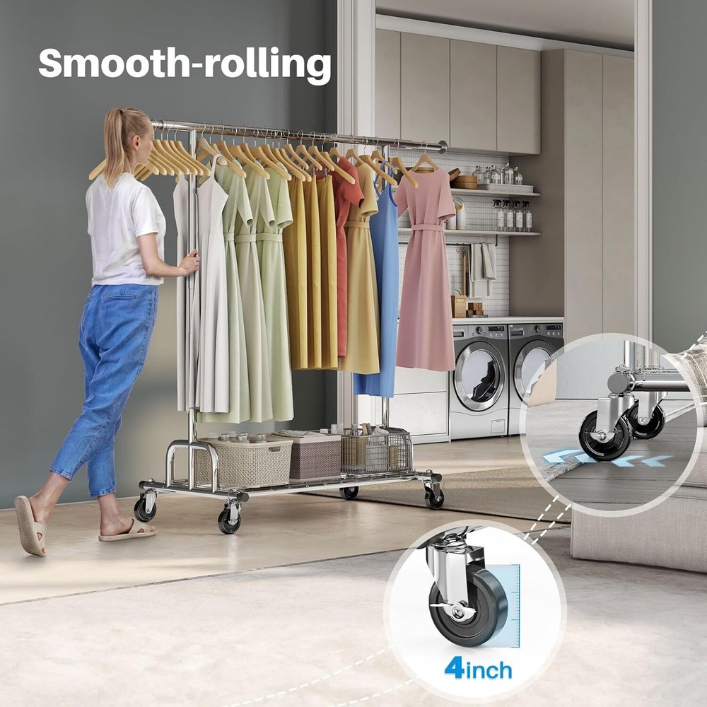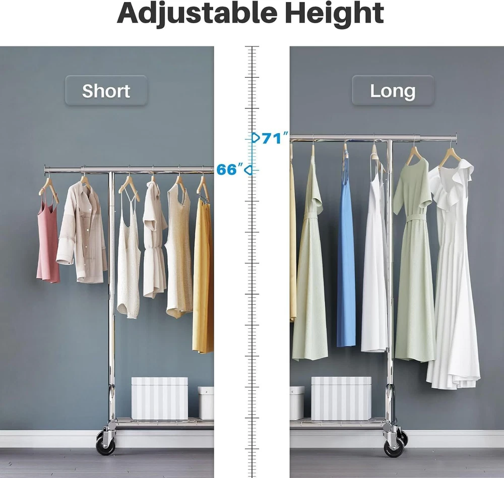Uses: Clothing storage, hanging clothes, storing shoes and luggage, commercial use, organizing clothing in bedrooms or dormitories, drying portable closet shelves boutiques retail stores, showrooms, flea markets Product Dimensions: 22"D x 42"W x 71"H Color: Chrome, Material: Stainless Steel 【No Corrosion & Rust-off】- Our Freestanding clothes rack is made of metal with durable chrome coating to enhance protection against water, rust, corrosion & scratch 【Max Load Capacity 525 Lbs】- All-steel heavy duty clothes rack is solid and sturdy to hold up to 525lbs. (310lbs on the hanging rods and 215lbs on the bottom shelves for shoes and luggage storage). It can meet all your extra garment storage needs 【Say Goodbye to Wobbly & Bending】- Our 3rd Generation rolling clothes rack uses E-shape structure for stronger support. With this commercial grade garment rack you can say goodbye to wobbly and bending racks 【Mobile Clothes Rack & Stable Guarantee】- 4 heavy duty omnidirectional casters for clothing rack with shelves ensure flexible movement and smoothly across any flooring. 2 lockable casters (foot operated) keep it in place when stability is needed, guarantee the safety of your family. Notice: The clothes rack for hanging clothes also works while removing the casters 【Fit Your Space & Needs】- Dimension: 51-75" L x 22" W x 66-71" H. The extensible horizontal rod of rolling garment rack from 51" to 75" provides 1.5 times more space than ordinary single rail garment rack. Height adjustable from 66" to 71" accommodates short and long garments. You can adjust the length and height of rods to meet your space needs 【3-in-1 Commercial Clothing Rack】- clothing racks on wheels is integrated by garment rack, free standing shoe racks and umbrella rack. Great for organizing your clothing in bedroom or student dormitory, or drying clothes in laundry room, also a portable closet shelves in a boutique, showroom, retail store or flea market