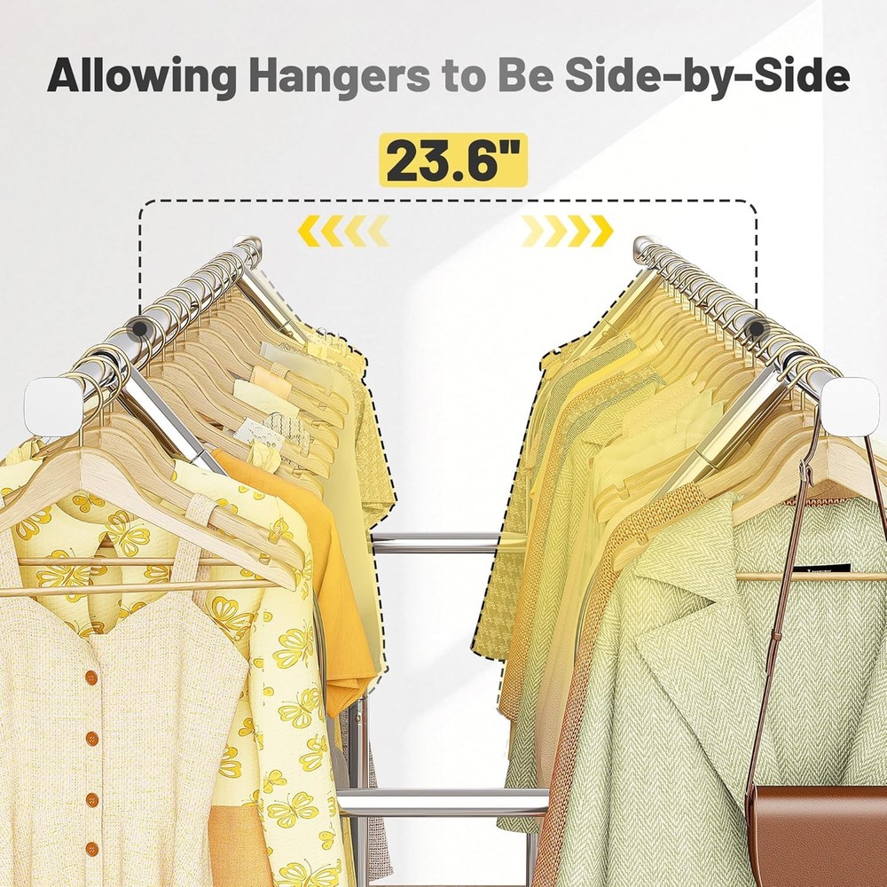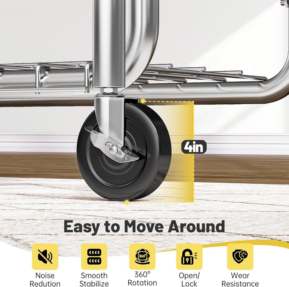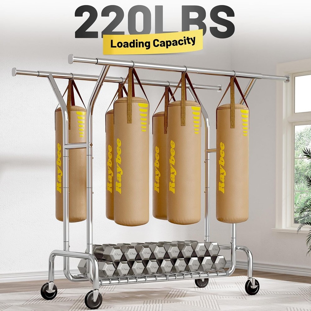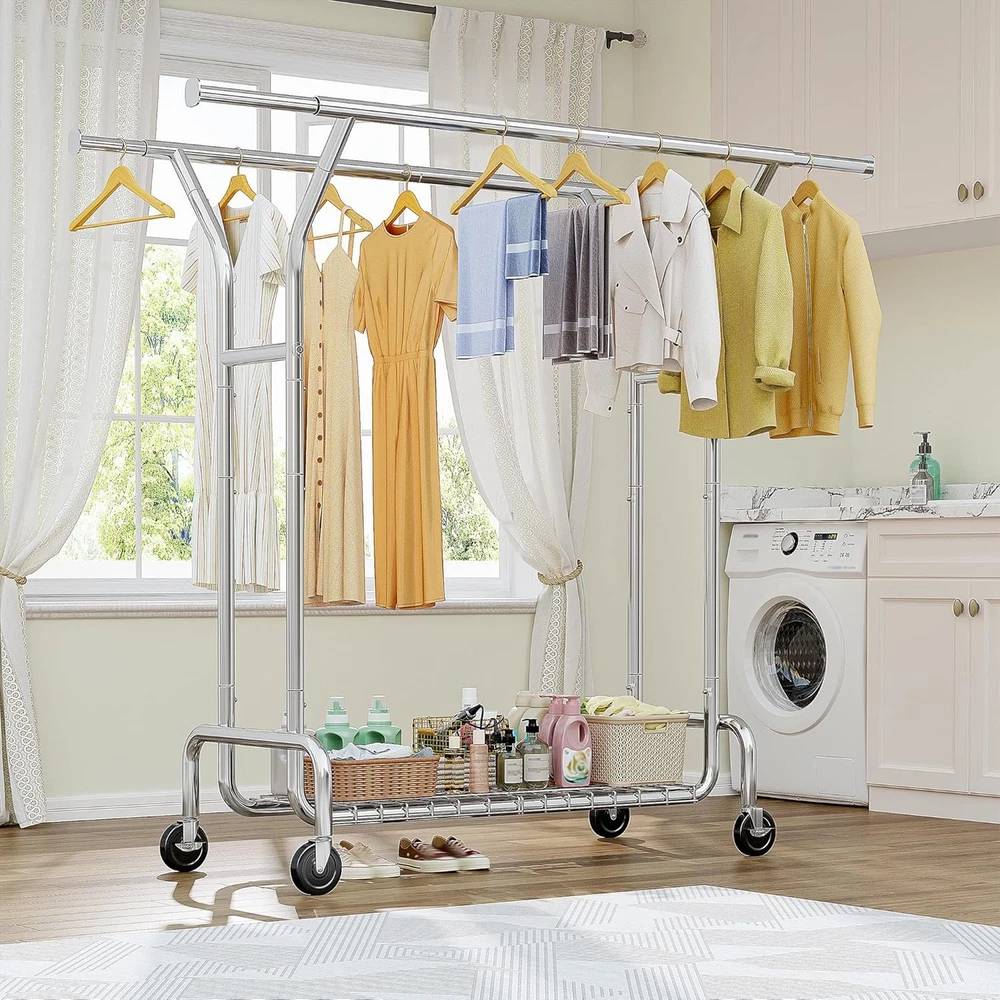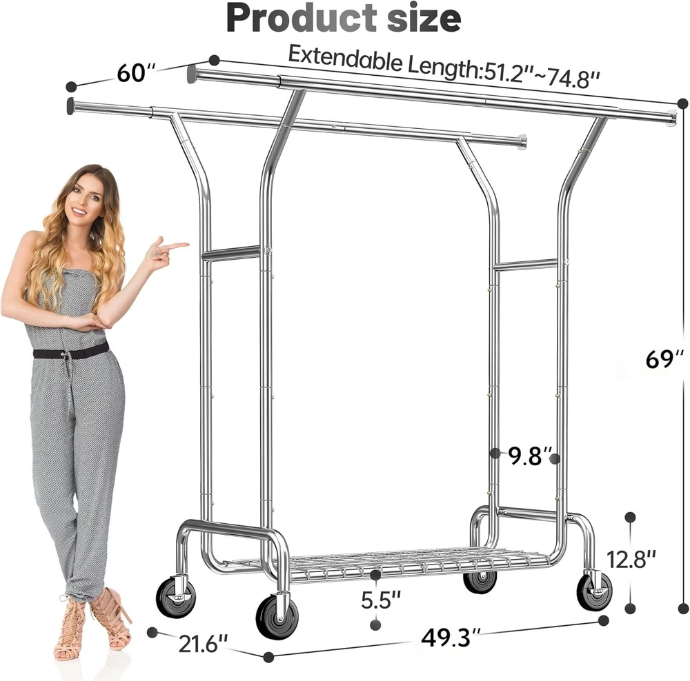 Product Description Heavy Duty Clothes Rack Clothes Rack Meets Your Needs in Every Scenario Previous page Next page Do wheels lock in place when rack is stationary? Yes, the clothing rack features four 360° removable swivel casters, two of which include lockable brakes for added stability when the rack is in use. Can it hold heavy winter coats and jackets? Yes, this clothes rack has a weight capacity of 220 pounds, making it possible to hang multiple heavy coats and jackets without any issues. Does it require tools for assembly? No, the clothes rack comes with all necessary parts, clear instructions, and includes gloves to protect your fingers during assembly. On Aug 6, 2025 at 21:08:15 PDT, seller added the following information: