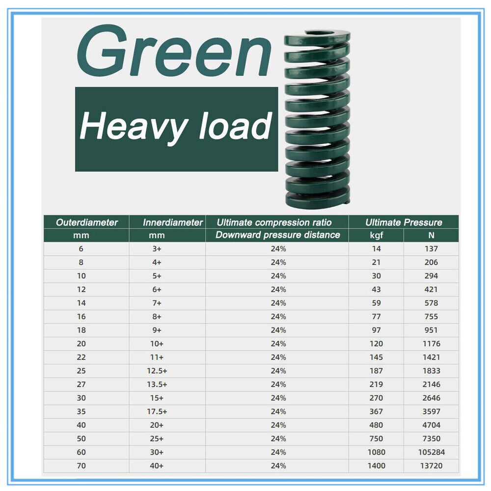 Product description Specifications: Features - Rectangular die springs have the following characteristics: Rectangular die springs have the characteristics of small size, good elasticity, high stiffness, high precision, rectangular material, surface color separation spraying (electroplating) to distinguish different loads, and beautiful appearance. Applications - Die springs are widely used in stamping dies, metal die-casting molds, plastic molds and other elastic motion of precision machinery and equipment, automobiles and other fields. Yellow and blue are mainly used for plastic mold assembly, and red, green and brown are mainly used for hardware assembly. Color:Green Outside diameter:8 - 40mm Inner diameter:4 - 20mm Length (height):15 - 300mm