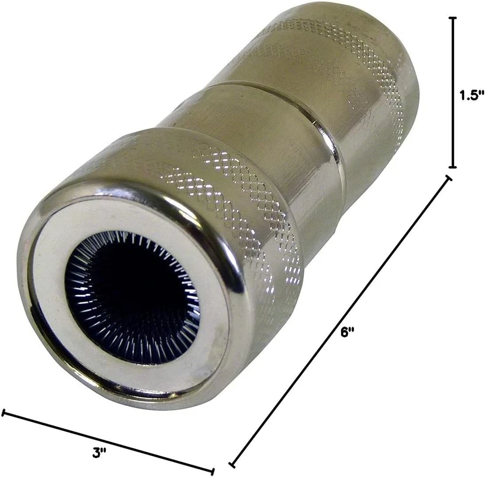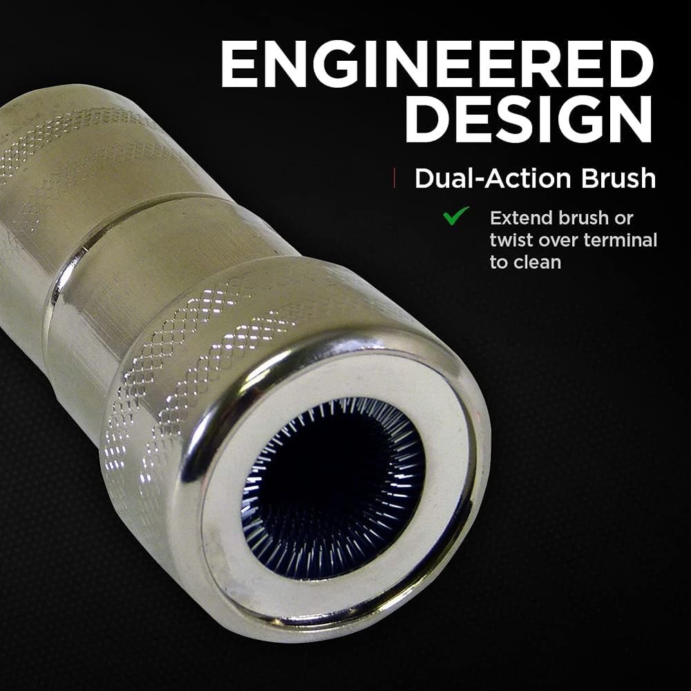 About this item For Top and Side Terminals: Use the battery terminal cleaning brush to easily clean and maintain your battery’s top or side terminals and posts. Chrome Brush: The stiff metal bristle brush offers reliable cleaning power for removing tough buildup and dirt, extending the life of your battery. Safe for Positive and Negative Terminals: This battery terminal cleaning brush can be safely used on both the positive and negative terminals of automotive, marine, and power sports batteries. Simple Operation: Remove the cap of the battery terminal cleaning brush and extend the brush head or press the brush hood over the terminal post for easy cleaning. Compact Size: The battery terminal cleaning brush is small enough to fit in the palm of your hand, making it easy to store in a toolbox or glove compartment. Built Green: This battery terminal cleaning brush meets the standards established for RoHS (Restriction of Hazardous Substances) compliance. In the Box: With your purchase, you will receive one battery terminal cleaning brush for automotive batteries. Dimensions: 6"L x 3"W x 1.5"H