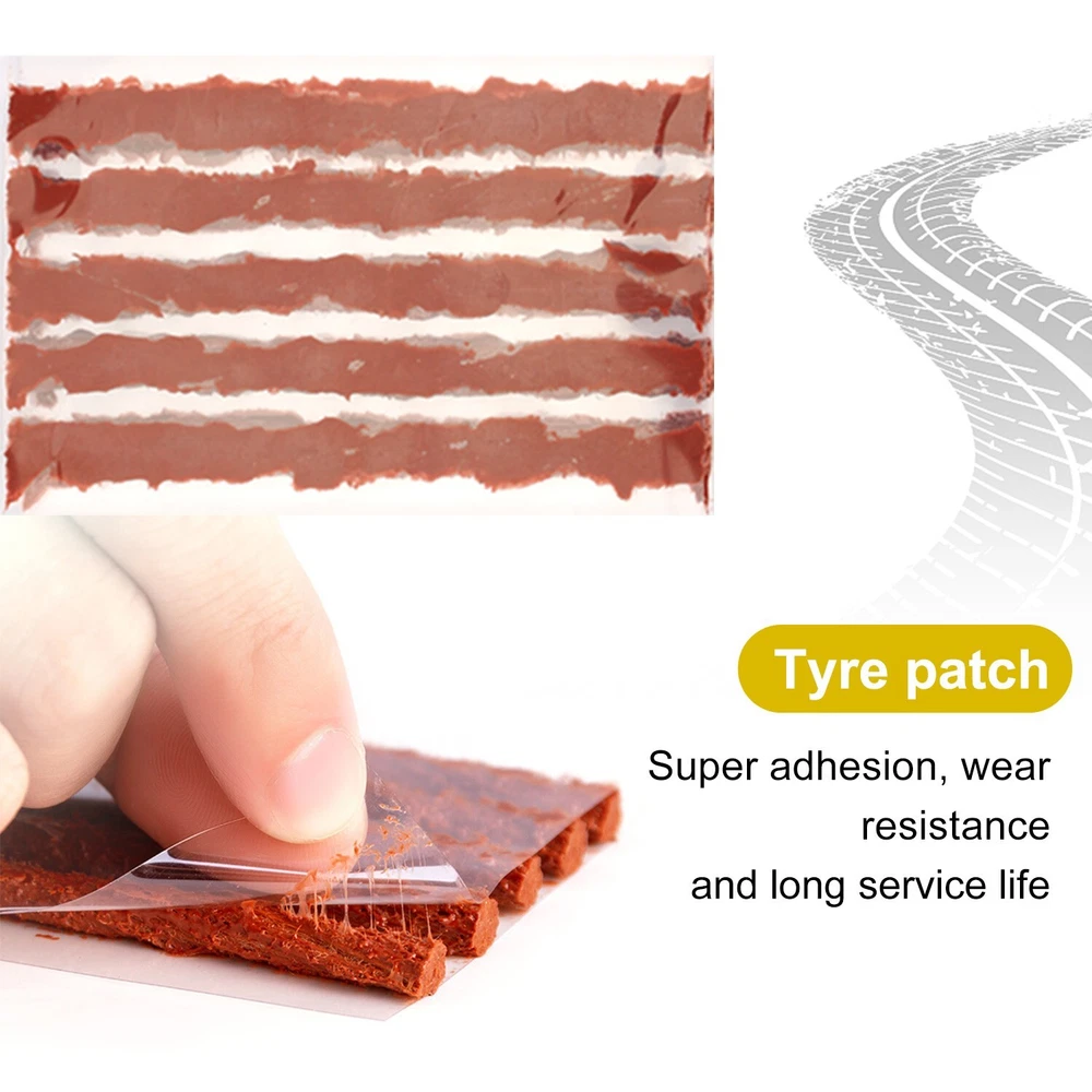 Features : 1.Emergency Vehicles Puncture Repair Kit for Tubeless Tires. 2.The Car Tyre Repair kit will allow you to mend punctures quickly and effectively. 3.Durable Plastic Handles providing great grip. 4.Essential for Vehicles with Tubeless Tires. 5.This Rasper Tool allows Tire hole widening and cleaning. 6.Needle Tool allows Tyre Rubber Strip insertion. 7.Includes 5 Repair Rubber Strips. 8.Useful Tool to keep in the car with spare wheels. How to use: 1.Remove object that causedthe puncture. Insert the rasp tool into hole and slide up and down to roughenand clean the inside of the hole 2.Coat needle tool withrubber cement and slide up and down into hole to lubricate area. 3.Insert a repair plughalfway through slit of needle. 4.Gently push needle throughhole until about half inch is left of the plug. 5.Pull split eye tool leavingthe plug inserted into hole. 6.Trim excess plug stickingout and let dry. Inflate tire and test for leak Package Included: 1 x Rasper Tool 1 x Needle Tool 1 x Rubber Solution 5 x Repair Strips