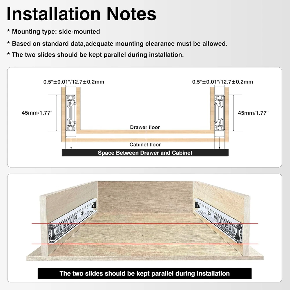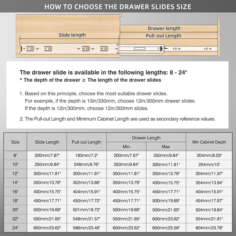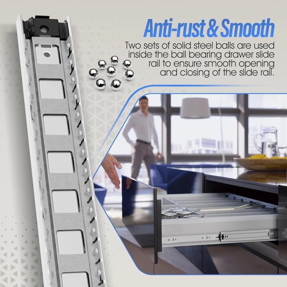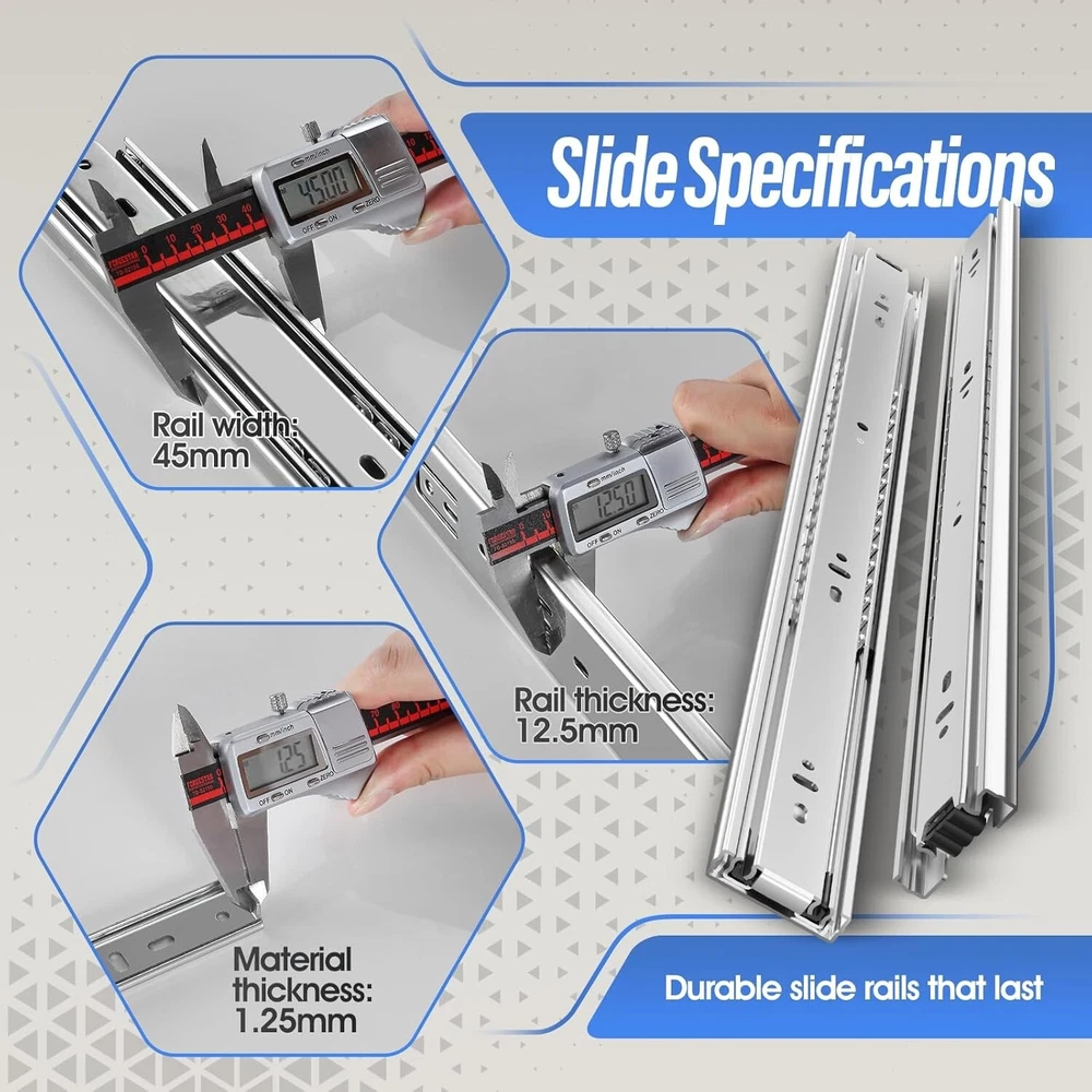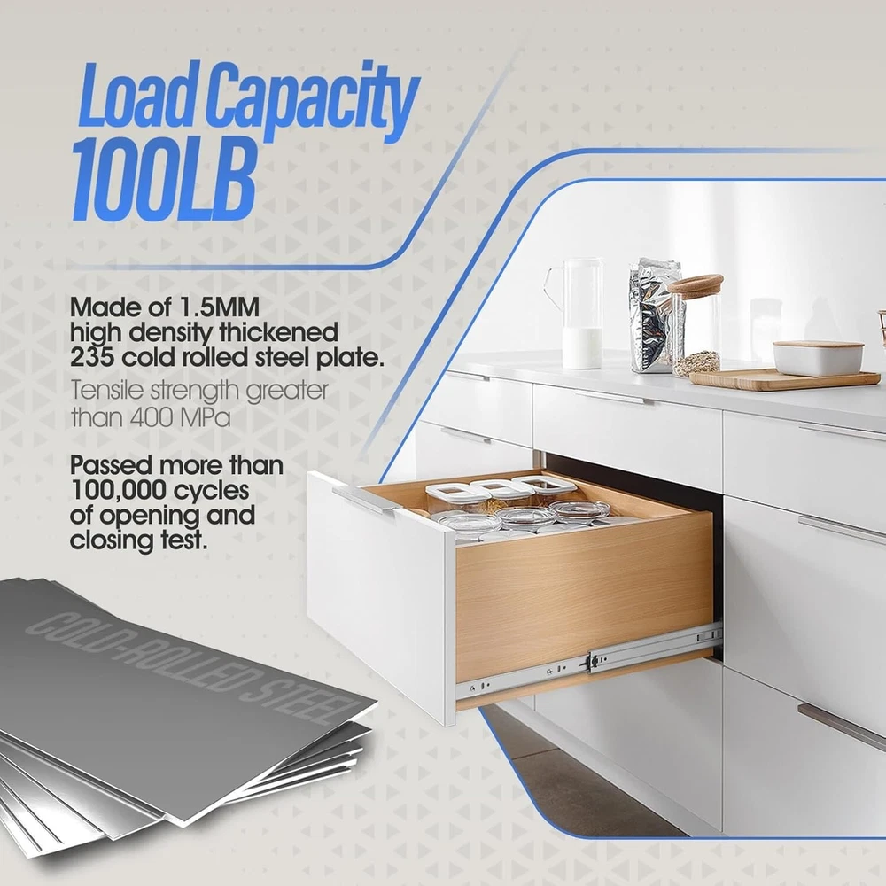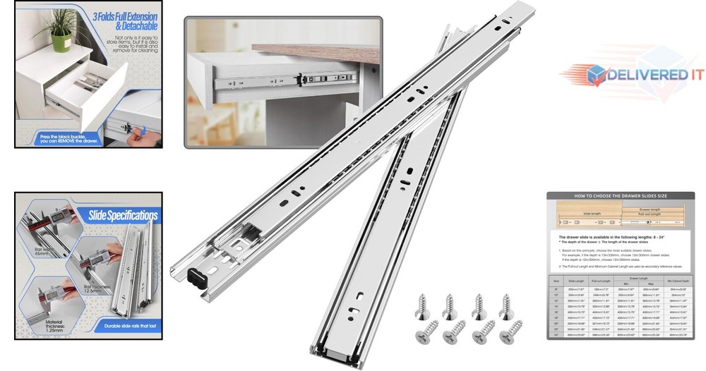 Full Extension Ball Bearing Drawer Slides 8-24 Inch 100 LB Capacity Silver ‹ › ‹ › ‹ › ‹ › ‹ › ‹ › ‹ › ‹ › ‹ › ‹ › Full Extension Ball Bearing Drawer Slides Dimensions: 8-24 Inch Capacity: Up to 100 LB Color: Silver Features: Installation Note: Length: 9.84" (250mm), full extension lengths: 19.6" (498mm). Requires left and right side mount clearance of 0.5" (12.6mm). Full extension and ball bearing design for easy access and smooth operation Detachable buckle for simpler installation and a rubber mute pad for whisper-quiet operation (as low as 35 decibels) Exceptional anti-rust and oxidation resistance, enhanced by special electrophoretic coating Sturdily crafted from 1.2mm cold-rolled steel, providing double the load-bearing capacity of conventional drawer slides (100 pounds) Benefits: Effortlessly pull out drawers for full visibility and accessibility Smooth and silent operation adds a luxurious feel to your furniture Durable construction ensures longevity, even under heavy use Reduces noise while closing, creating a tranquil environment Ideal for various applications, from kitchen cabinets to office filing systems Why choose our Ball Bearing Drawer Slides? Elevate your space with our top-of-the-line Full Extension Ball Bearing Drawer Slides. Designed for both functionality and aesthetics, these slides are perfect for anyone seeking quality and performance. The innovative ball bearing mechanism guarantees an unparalleled smoothness in drawer operation, while the robust construction ensures they can effortlessly support heavy loads. Plus, with noise-reducing features, your living space will remain serene. Discover the difference in quality and design. Transform your drawers with the precision of our drawer slides today! Shipping Free & Fast Shipping - We offer free shipping to most of the USA with a normal delivery time of 3-7 days. However, due to the current situation, additional delivery time (up to 3 weeks) may be required for some items. Alternative Carriers - We may use alternative carriers (e.g. USPS, FedEx, UPS, etc.) to ensure your package arrives safely and on time. Due to the use of multiple carriers, we are unable to provide a tracking number automatically. Handling Time - Orders are processed and shipped within 1-2 business days of receiving cleared payment. Shipping Restrictions - Shipping to Alaska, Hawaii, Puerto Rico, Guam, and other US territories may incur shipping charges or delivery restrictions. Please contact us before ordering, or your order can be refunded/cancelled. State Restrictions - There may be restrictions based on your state of purchase. For example, certain items may not be shipped to California due to state regulations. Contact for Tracking Updates - If you require tracking updates or have any concerns about the delivery of your order, please feel free to contact us, and we will be happy to assist you. Return 30-Day Hassle-Free Returns - We want you to be completely satisfied with your purchase. If you are not, you can return the item within 30 days of receiving it for a full refund or exchange. Easy Return Process - To start a return, simply contact us and we will provide you with a prepaid return shipping label and detailed instructions. Restocking Fee - There are no restocking fees for returns. However, the buyer is responsible for return shipping costs if the return is not due to a seller's error. Refund Processing Time - Refunds will be processed within 5 business days of receiving the returned item in its condition. Payment We accept all major credit cards, PayPal, and Apple Pay for your convenience. Your payment information is secure and encrypted to ensure a safe and seamless transaction. Please complete your payment within 3 days of purchase to avoid any delays in shipping. Feedback Your feedback is extremely important to us. We strive to provide the best products and customer service possible. If you are satisfied with your purchase, please take a moment to leave us a positive review. If you have any concerns or issues with your order, please contact us before leaving negative feedback. We are committed to resolving any problems and ensuring your satisfaction. Contact Us If you have any questions or concerns, please feel free to out to our customer support team. You can contact us through the eBay messaging system. We are available Monday to Friday, 9:00 am to 5:00 pm EST, and we will do our best to respond to your inquiry within 24 hours. Buy it now and enjoy a pleasant shopping experience! Unit Quantity: 1 Material: q235 cold rolled steel,electrophoretic coating Closing Type: Self Closing Type: Full Extension Item Height: 2.6 Centimeters Color: Silver Number in Pack: 1 Style: Modern Unit Type: Unit