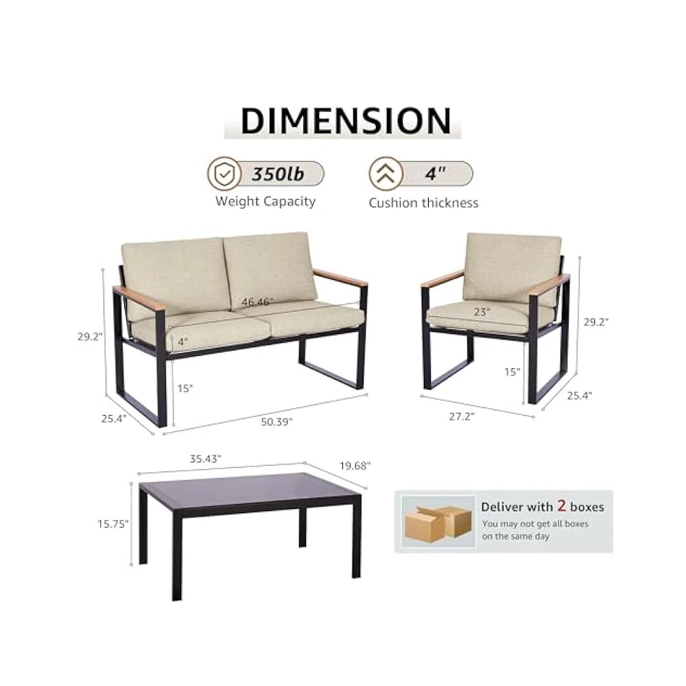 STORE NEW ARRIVALS ADD TO FAVORITE VIEW FEEDBACK Heavy,Duty Metal Patio Sectional, 4,Piece with Water,Repellent Cushions & Mesh Description 4-Piece Patio Furniture Set – Create Lasting Family Moments Outdoors! This 4-piece patio furniture set provides a comfortable and inviting space for family gatherings and relaxation. Featuring a durable metal frame, a stylish wooden armrest designed to prevent scalding, and breathable sling mesh seating, this set offers both safety and comfort. The included 4" olefin cushions add an extra layer of coziness for enjoying warm weather with loved ones. This set is built to withstand the elements, offering years of enjoyment for your family. Create a welcoming outdoor oasis where memories are made, all while providing a reliable and value-focused addition to your home. Perfect for conversation and creating a peaceful retreat, this set will quickly become a favorite spot for the whole family. Enjoy quality time outdoors with a durable and comfortable setup, designed for lasting family enjoyment. Product Features Durable metal frame Stylish wooden armrest designed to prevent scalding Breathable sling mesh seating 4" olefin cushions for extra comfort Built to withstand the elements Perfect for family gatherings and relaxation Creates a welcoming outdoor oasis Reliable and value-focused addition to your home Technical Specifications Frame Material Metal Armrest Material Wood Seating Material Sling Mesh Cushion Material Olefin Cushion Thickness 4" ABOUT US We offer the best prices around on high quality products. Our E-store includes media such as books, movies, music and games while offering electronics, toys, sporting apparel, clothing, tools, general home, garden items and more. SHIPPING We are always working hard to ensure your package arrives as soon as possible. Please understand that some factors like weather, high postal traffic, and the performance of shipping companies are outside of our control. For shipping outside of the continental USA, we only use eBay's Global Shipping Program.The item is shipped to KY and then sent to the rest of the world. International customers are responsible for all duties and taxes. Continue to check out in order to calculate costs for shipping the item to your country. Messages regarding eBay's Global Shipping Program MUST be directed at eBay EXCLUSIVELY. RETURNS We offer a 30-Day Return Policy on items which you are not completely satisfied with. You have the option for a full-refund or an exchange of the item. No returns are available on items shipped outside of the USA. CUSTOMER SATISFACTION We try our very best to make sure every customer is completely satisfied. If there's a problem, message us! We're happy to help. WE ACCEPT Copyright © 2021 AutoDS. | All Rights Reserved