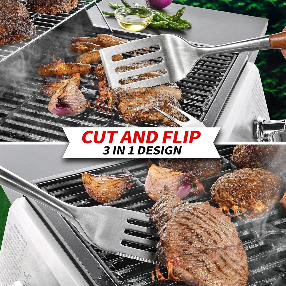 ๐ฅ๐ฒ๐ฎ๐น ๐ฅ๐ผ๐๐ฒ๐๐ผ๐ผ๐ฑ ๐จ๐๐ฒ๐ป๐๐ถ๐น๐: Upgrade your old, rusting grill tools or start from scratch with our rosewood barbecue utensils set. Made of incredibly sturdy stainless steel, and comes in a classic wood grain finish that will fit seamlessly into any indoor or backyard design scheme. This might be your last grill tool purchase. You'll have the three essential tools you'll need to do all your outdoor cooking. ๐๐ผ๐ป๐๐ผ๐๐ฟ ๐๐ฒ๐๐ถ๐ด๐ป: Our set includes a spatula, fork, and tongs. The contoured design of the natural wooden handle was pleasantly smooth to the touch. The forged stainless steel is sturdy, and heavy-duty and will help you easily handle a large piece of meat for that perfect grilled dish. 3-๐ถ๐ป-1 ๐๐ฝ๐ฎ๐๐๐น๐ฎ: Having a hard time with cutting and grilling? This 3 in 1 spatula with serrated edge is the perfect tool for you. It will make your grilling experience easier and faster. The bottle opener is located at the top of the handle, both for the kitchen grill spatula and forks. It's a multi-functional grilling tool that will make your life much easier! ๐๐ผ๐ฐ๐ธ๐ฎ๐ฏ๐น๐ฒ ๐๐๐ค ๐ง๐ผ๐ป๐ด๐: Even the most delicious BBQs are ruined when the meat falls off the grill. The Grilaz tongs are the perfect way to grill the perfect steak, chicken breast, or vegetables. Lockable BBQ Tongs are just the tool you need to keep your food in the place. These strong tongs have a deep and wide grip and a lock closure to store them away, saving you time andeasy to storage. ๐๐ฑ๐ฒ๐ฎ๐น ๐๐ถ๐ณ๐ ๐๐ถ๐ For Men: The essential tool kits are well polished, all tools are made of crafted stainless steel and come in the perfect gift box. they are designed for grilling and are the perfect gift for any grill master, or whoever just needs something new to make their barbecue better. It is also the ideal gift for Father's Day, Christmas, an anniversary, or retirement.