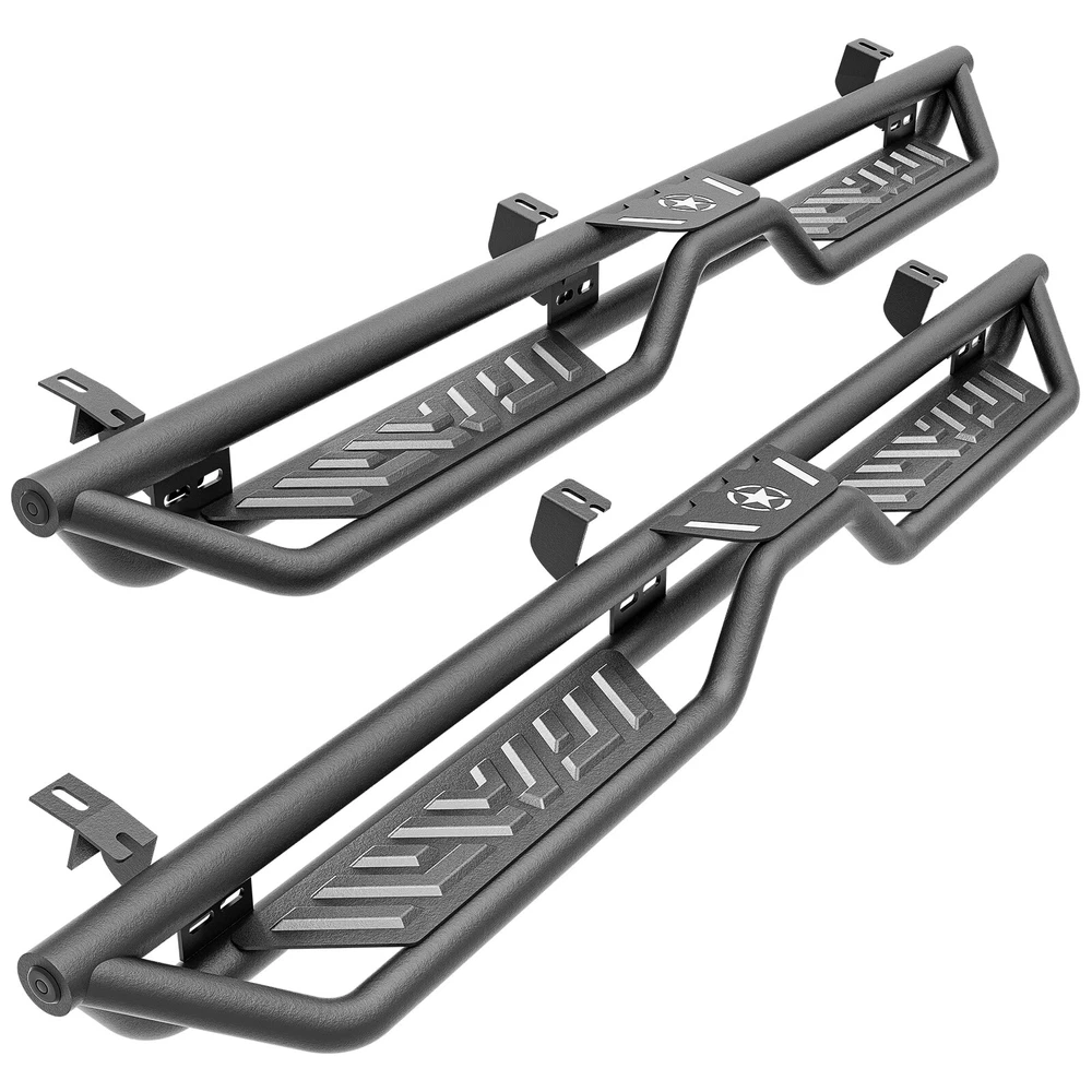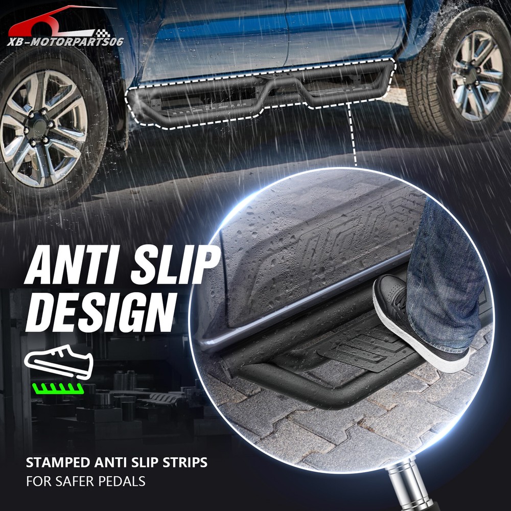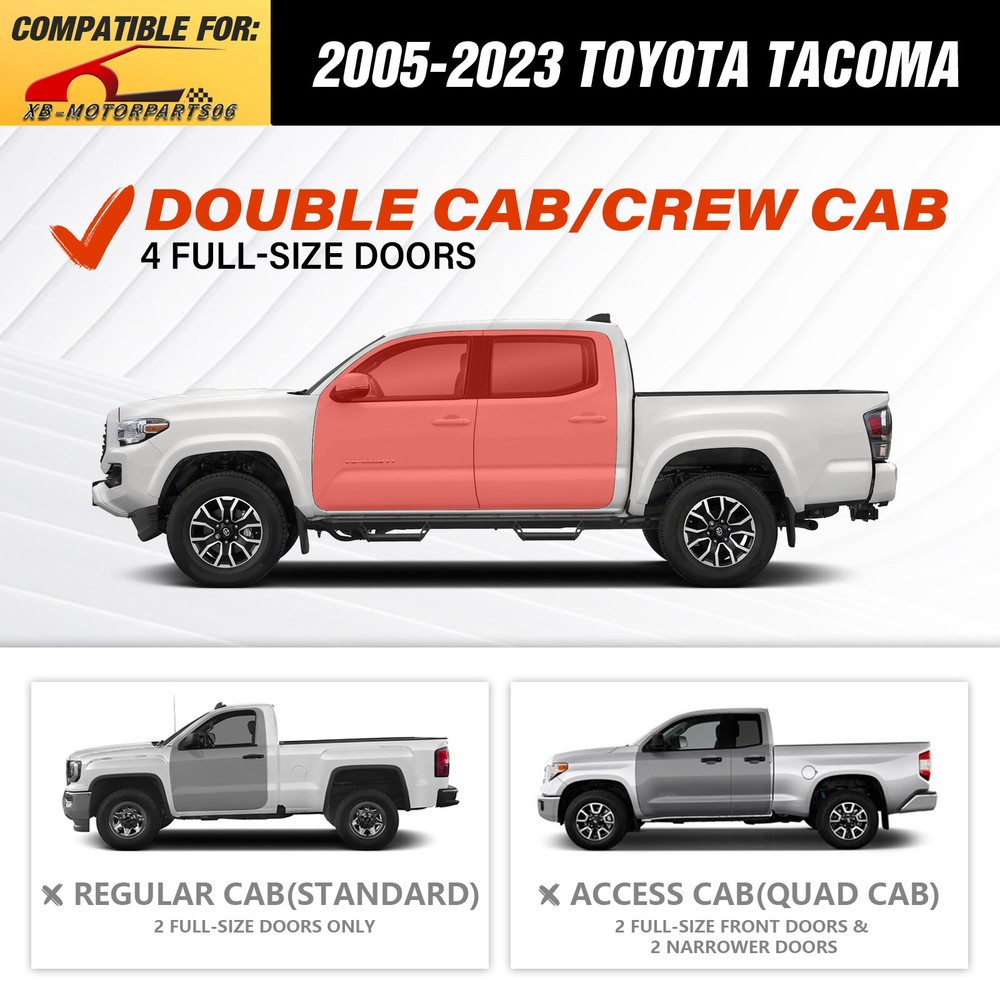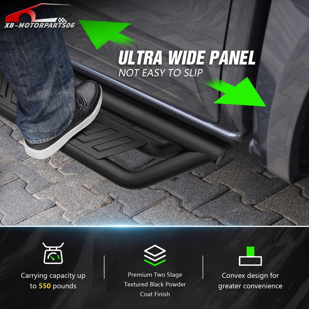 Heavy-Duty Side Steps Running Boards For 2005-2023 Toyota Tacoma Double&Crew Cab Suitable Models : Compatible with 2005-2023 Toyota Tacoma Double Cab & Crew Cab (4 Full-Size Doors) Package Includes : 2 x Running Boards Side Steps, brackets, instructions, and all necessary hardware Product Information : Product Dimensions: 76 x 7 x 6 inches Installation mode: Bolt-On Weight Limit: 550LBS Placement on Vehicle: Left and Right Item Weight: 63.14 pounds Material: Carbon Steel Color: Black (hand measurements may have an error of 2-3 mm/0.078-0.118 in) Feature: ① The side steps feature a dual-layer design, enhancing convenience for vehicles with lift kits and oversized tires, while also making roof access easier; ② The extra-thick main tube provides superior load-bearing capacity, preventing deformation and enhancing vehicle protection; ③ The stepping area is designed with a high-end textured pattern, ensuring secure and stable footing to prevent slipping; ④ The high-quality black powder coating provides outstanding rust and corrosion resistance. Constructed from heavy-duty 2mm carbon steel, each side can withstand a weight of 550 pounds. Precision laser cutting and stamping techniques contribute to a non-slip step surface and enhanced traction; Warranty Period : 2 year Standard Shipping (FedEx Ground or FedEx Home Delivery) Will usually ship within 3 business days of receiving cleared payment Suitable Models : Compatible with 2005-2023 Toyota Tacoma Double Cab & Crew Cab (4 Full-Size Doors) Package Includes : 2 x Running Boards Side Steps, brackets, instructions, and all necessary hardware Product Information : Product Dimensions: 76 x 7 x 6 inches Installation mode: Bolt-On Weight Limit: 550LBS Placement on Vehicle: Left and Right Item Weight: 63.14 pounds Material: Carbon Steel Color: Black (hand measurements may have an error of 2-3 mm/0.078-0.118 in) Feature: ① The side steps feature a dual-layer design, enhancing convenience for vehicles with lift kits and oversized tires, while also making roof access easier; ② The extra-thick main tube provides superior load-bearing capacity, preventing deformation and enhancing vehicle protection; ③ The stepping area is designed with a high-end textured pattern, ensuring secure and stable footing to prevent slipping; ④ The high-quality black powder coating provides outstanding rust and corrosion resistance. Constructed from heavy-duty 2mm carbon steel, each side can withstand a weight of 550 pounds. Precision laser cutting and stamping techniques contribute to a non-slip step surface and enhanced traction; Warranty Period : 2 year