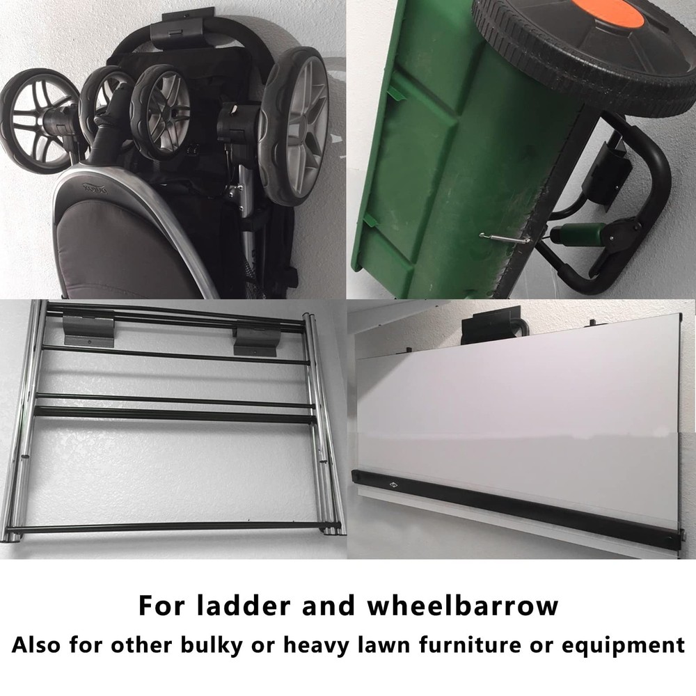 You must be looking for a reliable ladder storage hooks for your ladders, wheelbarrows and other unwieldy home appliances. Then this hanger/hook is your best choice: To keep your floor tidy and organized; To reclaim valuable floor and shelf space; To solve the storage with a minimum of wall space; To hanger the ladder, wheelbarrows and other obstacles firmly on the wall; To lift and lower items easily; No fear of falling over or young kids pulling it down; Specifications: Material: High strength steel Quantity: 4 Pcs Color: Black Size: 5 * 1.7 * 4 inches Package include: Garage wall hook x 4 Pcs Stainless steel screw x 8 Pcs Wall anchor x 8 Pcs Note: Please allow slight size error due to manual measurement; Do not hang things over 50lbs Do not recommended for items over 20 lbs if drywall mounted Well-built and Sturdy Wheelbarrow hanger: Made of heavy-duty and powder-coated steel. Water-proof and rust-proof. To solve the storage with a minimum of wall space Easy to Bulky Items: This ladder holder is not just qualified for hanging ladders and wheelbarrows, but also useful for other furniture and home equipment Multipurpose Ladder Hook: Mount it in your garage or garden fence or any other wall as you wish. To get the messy items off the floor and still be able to lift and lower them easily Easy to Use: This ladder hooks for garage wall comes with two fixing screws for easy installation. It fits most wall surfaces and provides weight capacity up to 50 lbs if wall stud mounted Buy With Confidence: Two supporting points design ensures firmly hanging without fear of falling over. And we stand behind our garage ladder hooks and every single order is excellent guaranteed