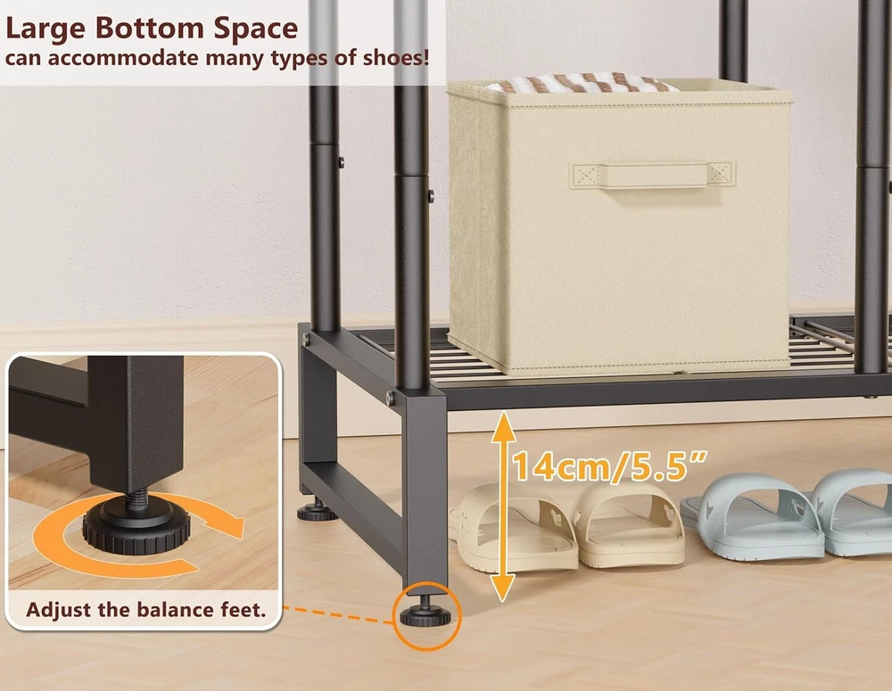 Double Rods Design: Size of clothes rack:63"(H) x 45.3"(L) x 15.7"(W) , the combination of high and low rods of the clothes rack can accommodate a large number of clothes of different lengths,keeps your clothes and belongings organised. The non-slip hanging beads on the clothes rack prevent clothes from falling. It‘s an excellent choice for bedrooms, living rooms, laundry, and balconies High-Quality Materials:Made of high-quality metal steel, the whole is connected by screws, which is sturdy and durable. The heavy duty clothes rack can bear more than 780lbs. The hanging rod is sturdy and not easy to break. It is a clothes rack with strong stability and load-bearing capacity 4 Tier Metal Mesh Storage Shelf :The side storage shelf can be used to store folded clothes, storage boxes, shoes, etc. Ample storage space to keep your clothes and belongings in order.This high-performance and stylish clothes rack is perfect for bedrooms, dressing rooms, cloakrooms, laundry, clothing stores, photography studios Side Hooks:The clothing rack with 4 hooks on the side increases the overall storage function. The hooks can be used to hang coats, hats, scarves, bags, keys, umbrellas, etc Easy to Assemble: The package comes with assembly tools and detailed installation instructions, which makes the installation effortless and can be assembled in a very short time
