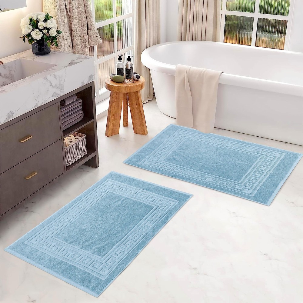 MAXIMUM ABSORBENCY: Made from 100% Cotton, this bathroom rug set offers absorbency compared to thinner bath mats; enjoy cloud-like comfort when you step out of your shower or bath; Choose from 15 gorgeous colors TWO-PIECE SET: Enjoy the convenience of this two-piece bath rug set, measuring 22" x 35" each, to outfit both your main and guest bathroom; transform your bathroom to a mini spa with this stylish duo; perfect for shared, large, or multiple bathrooms ELEGANT DESIGN: The traditional Greek key design will add an elegant touch to your bathroom decor and coordinate beautifully with your existing decor; Enjoy hotel luxury in the comfort of your home with these soft spa and hotel quality bath mats CARE INSTRUCTIONS: Easy to care for, simply toss these bath mats in the washing machine and tumble dry on low or air dry whenever needed; Always follow care label instructions for best results EXCELLENT GIFT: Our designs match a variety of styles and make great gifts; perfect for friends and family; we're committed to make products safer for you and safer for the world; this product is OEKO-TEX certified for safety and sustainability