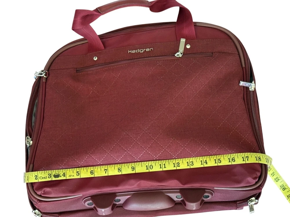 Want a bag that makes you feel like an organized superhero? Meet the Hedgren Travel Bag: spacious, stylish, and secretly plotting to carry your snacks. • Quilted design for added style • Multiple compartments for organization (laptop) • Durable zippers and straps • Measures approximately 18 inches wide