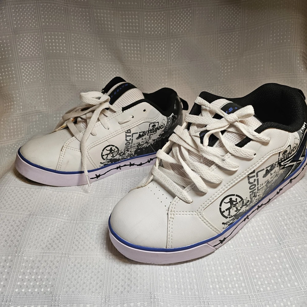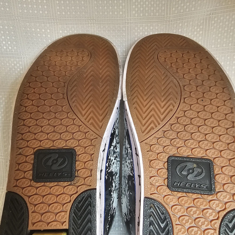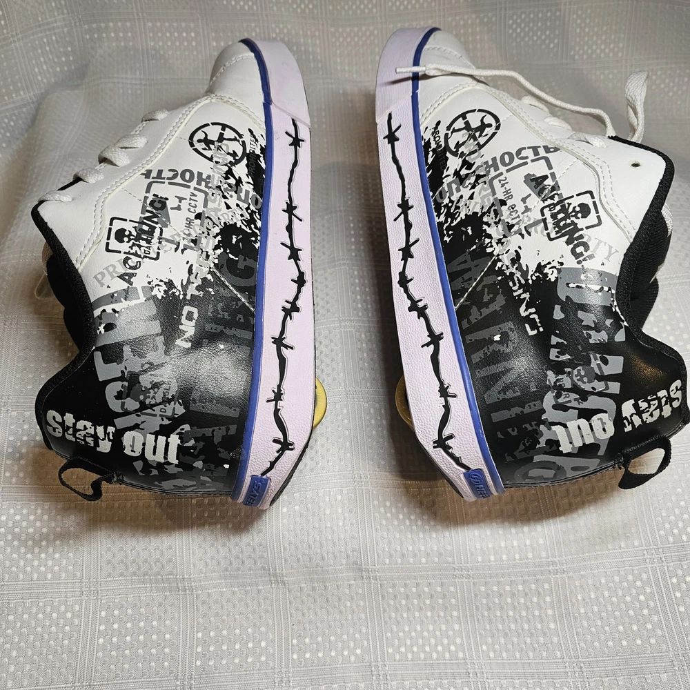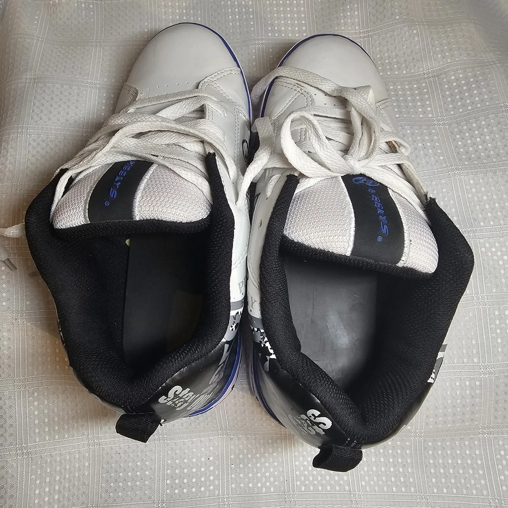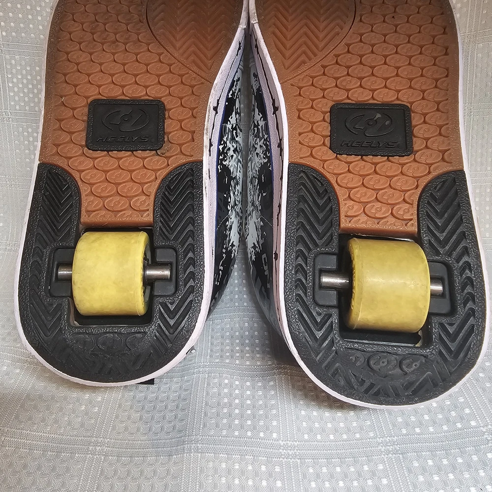 The Heelys Slash Black/White Roller Skate Wheel Shoes (7468) in Youth Size 7 are a trendy and versatile choice for kids who love to skate. Featuring a solid black canvas upper with faux leather accents, these athletic sneakers are both stylish and durable. With wheels integrated into the sole, these Heelys offer a fun and unique way to skate around while still looking cool. Perfect for both boys and girls, these Heelys are designed for casual wear and skate activities. The unisex design, comfortable regular shoe width, and reliable performance make these shoes a must-have for any kid looking to add some excitement to their footwear collection. Heelys have some wear. Price has been reduced to reflect some wear. If you have any questions do not hesitate to contact us. Thank you for stopping by. Kindness is cheap - Spread that stuff everywhere.