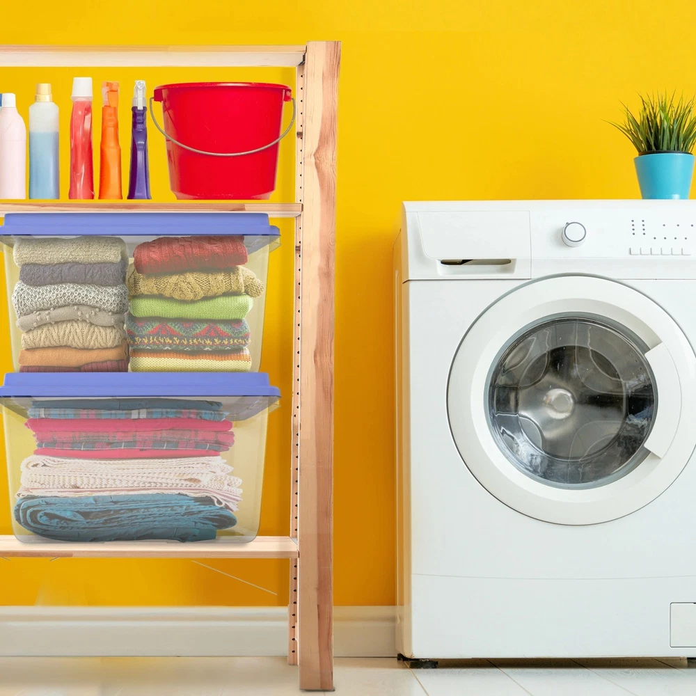 Hefty 72 Qt. Clear Plastic Storage Bin with Blue HI-RISE Lid, 6 Pack Looking for the best storage bins to organize your home or move to a new one? In search of a durable storage container to stow away anywhere in the home, garage, or attic? Look no further! The Hefty HI-RISE, 72 qt clear storage bin is designed to store a variety of household items including, clothing & shoes, seasonal items and accessories. Ready to neatly STACK? Hefty’s HI-RISE patented lid design allows for secure stacking and ABOVE the rim storage, to efficiently save space within your home. A CLEAR view? Identify items quicker and more effectively with the HI-RISE clear storage base. The large, click secure latches allow for secure and comfortable transport. Work to maintain your storage space and organize your household with maximum containment. Store and better protect items to SAVE SPACE and edit your home or business. Check out the complete line of Hefty HI-RISE storage bins to help create a clean & uniform storage space! Adult usage. Large secure latches, keep the lid closed tightly Double rimmed base for added strength Crossbar design on lid supports secure stacking Strong plastic storage container Taller, stackable lid allows for extra storage Adult usage. Assembled product weight 3.68 lb Color Clear Has lid Y Material Plastic Rec. use Keepsake Storage Shape Rectangular Size 14.24" H x 16.81" W x 24.04" D Volume capacity 72 qt Features Stackable Assembly req N Brand Hefty Rec. room Closet, Garage Care and maint Wipe clean with damp cloth Count per pack 6