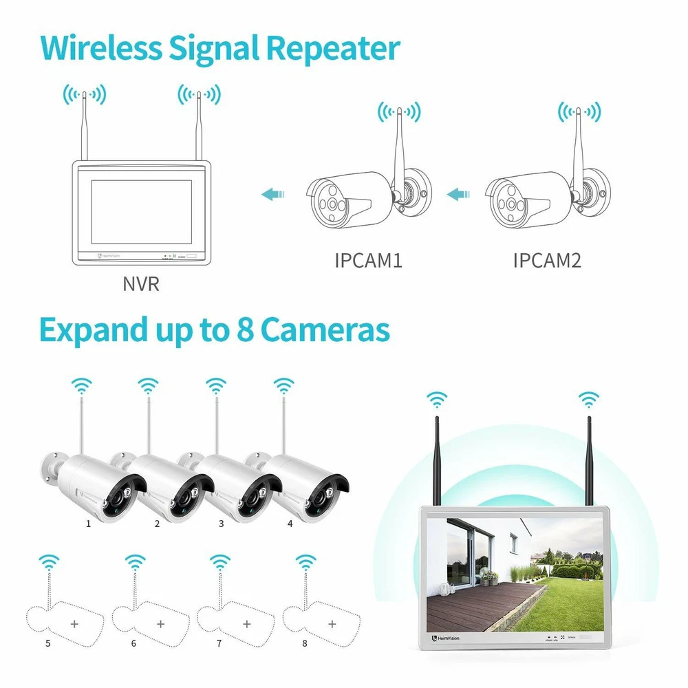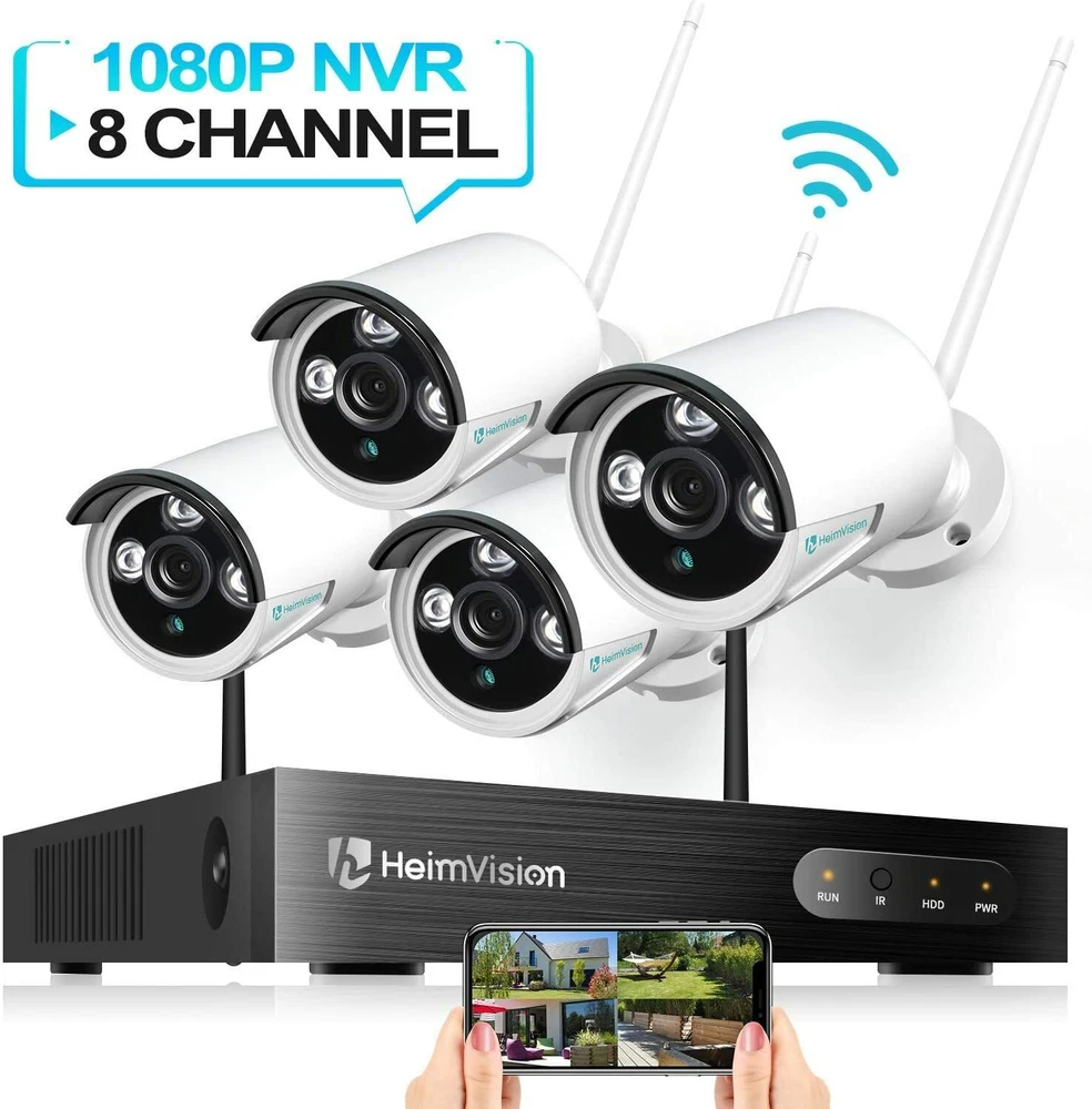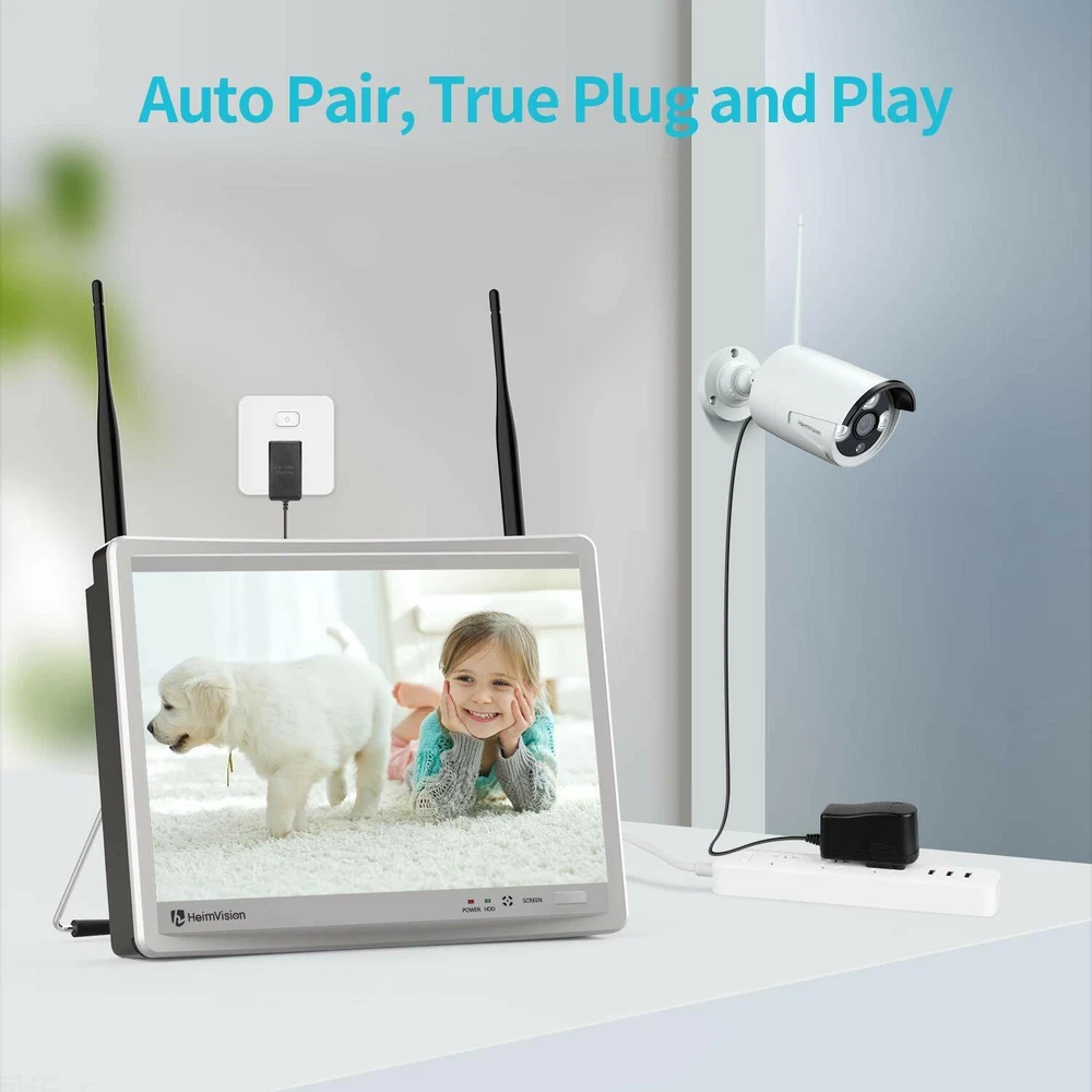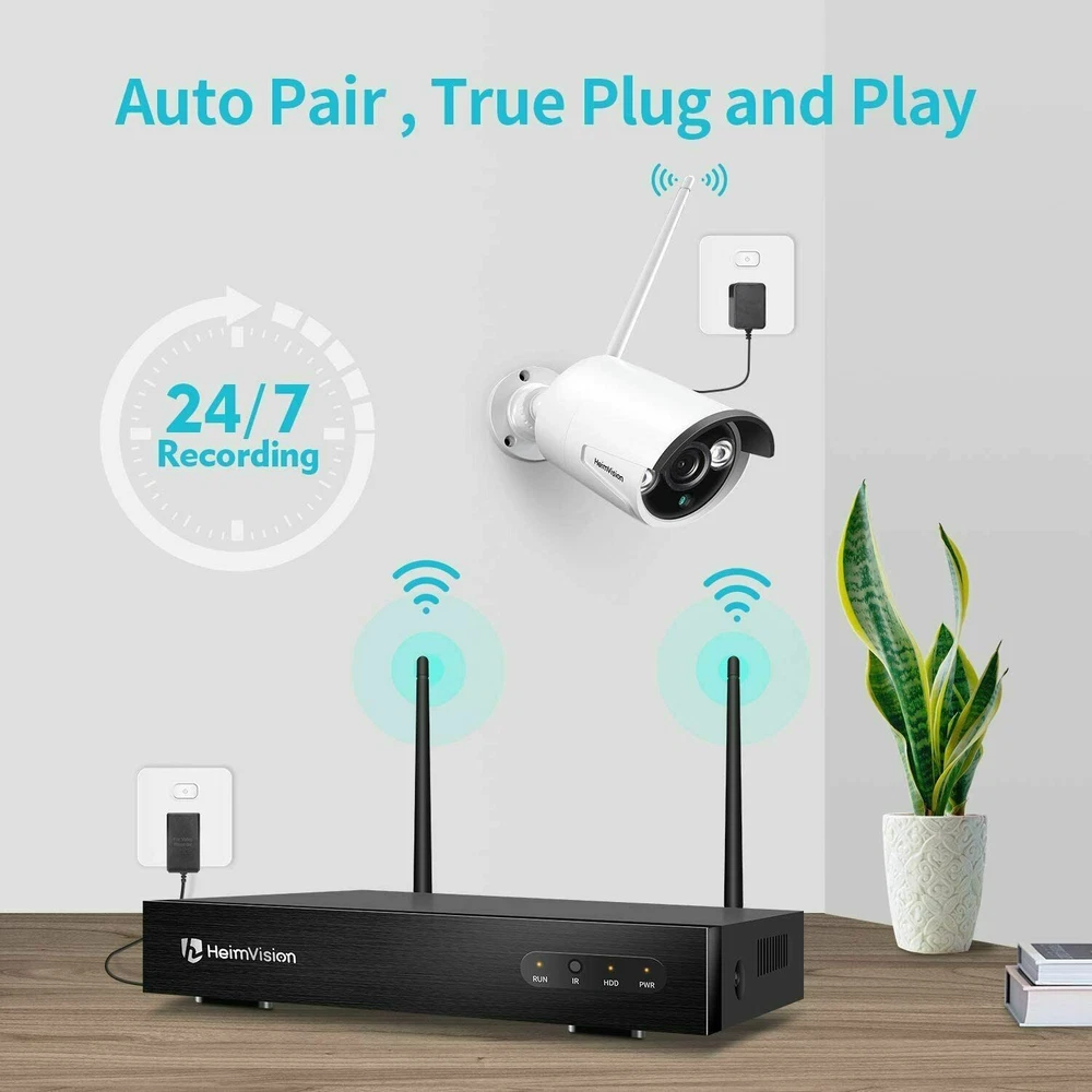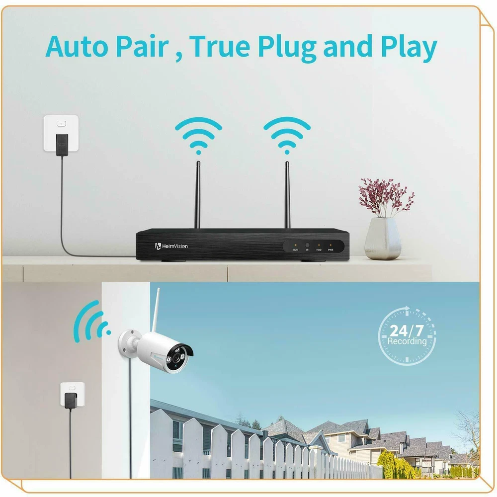 EL_Star Store Store Categories Store Categories Projector Tablet & PC Home Security Drone Electronic Home & Garden Other HeimVision Wireless Security Camera System 8CH NVR 12'' LCD Monitor Outdoor CCTV Item Description HeimVision HM243 1080P Wireless Security Camera System with 12 inch LCD Monitor, 8CH NVR 4Pcs Outdoor/Indoor WiFi Surveillance Cameras • Note 1: Hard Drive is NOT Included (HDD means Hard Drive Disk) • Note 2: Wireless means wireless Internet connection, but also need to be plugged in the power supply/outlet for 24/7 recording. Wireless Camera is different from Wire-free camera, the power cable is still required to get electricity for 24/7 surveillance purposes. Wireless means that there is no video cable between cameras and NVR, easy to install. Features: All-in-One and Easy Setup: Heimvision wireless CCTV camera system features a 12" full HD 1080P monitor (Not Touch Screen). The wireless cameras and NVR monitor are auto-paired during the factory setting. Just need to connect the wireless cameras and NVR with Power Supply provided for 24/ 7 surveillance purposes. Perfect for villa, home, office, shop, hotel, warehouse, school, business or elsewhere. (Wireless means wireless Internet connection, but also need to plug-in power supply) IP66 Weatherproof Security Camera: Records in 1080P Full HD to capture sharp and crisp images, provide crystal-clear HD live video, ensures crisp smooth footage day and night with 2.0 Megapixel bullet cameras. 1080P NVR is an HD video recorder for recording, transmission, and storage, etc. (Hard drive MAX 6TB support. Not Included HDD). Up to 15m Night Vision. The IP cameras are rated as dust-tight and waterproof and cover with durable housing. Best choice for your outdoor home security. Motion Detection and Email Alert: HeimVision wireless surveillance camera system provide to minimize false alarms. Smart notifications with email/ snapshot alerts will be pushed to your smartphone via iPhone/ Android App when motion is detected. Customize your own detection plan and zone for each camera, you will get extra peace of mind by receiving instant alerts and get notified of what’s happening. Mobile Remote Viewing: Connect the NVR to the home router via Ethernet cable provided, then download free app ''HeimKits'' into your mobile device. This video recorder system supports video preview, recording, sync-playback, backup, motion detection, and email alarm. You can remote access simultaneously on smart devices(IOS、Android) at any time, anywhere with WiFi/ 2G/ 3G/ 4G on smart Phone, Pad, and PC. You’ll never miss out on a moment with remote and local playback, no matter where you are. Robust Quality and Service: Security camera system boast a durable and long-lasting design. With well-experienced engineers and dedicated support team, we are always standing by your side and ready to help you. If you have any questions, please feel free to contact us. The expandable system can support up to 8 cameras. Comes with 1x 8-channel 1080P LCD NVR and 4 x 1080P wireless IP66 Cameras. Additional cameras can be purchased on our front store: CA01 Extra camera. Technical Specifications: Product Dimensions: 12.6 x 7.1 x 10.6 inches Item Weight: 8.5 pounds Camera Resolution: 1080P Angle of Field: 110° Night Vision Range: 50ft Power Input: DC 12V 1A for cameras Power Input: DC 12V 2A for the NVR APP: HeimKits PC Client: Eseecloud What’s in the Box: 1 x 8CH 1080P Wireless Network Video Recorder (12inch Monitor Wireless NVR) 4 x 1080P 2.0MP IR LEDs IP Cameras with 5DB Extension Antenna 4 x 10FT Power Supply (12V/1A) Power Adapter for Security Cameras 1 x 3.3FT Power Supply (12V/2A) for NVR recorder 1 x Screw for Hard Drive' Installation 4 x Screw for Bullet Cameras' Installation 1 x 3.3FT Network Cable 1 x USB Mouse 1 x User Manual HeimVision HM241 Wireless 1080P HD Security IP Camera System 8CH NVR WIFI Night Vision * Note 1: Hard Drive NOT Included (HDD means Hard Drive) , only supports 2.4G wifi , not support 5G , The PTZ Camera could not de added to the NVR system. * Note 2: Wireless means wireless Internet connection, it is not battery camera , it is powered via the US plug ( included) Specifications NVR/DVR Box : 8-Channel NVR Box Resolution: 1080P Camera Resolution: 4Pcs/ 1080P Hard Drive: Not included Free App: Heimkits/ IP Pro Connection Type: LAN Cable/ 2.4G WiFi Display: HDMI/ VGA Weatherproof : IP66 Night Vision: 65ft Features: Motion Detection, Email Alert, Video Loss Alert, Privacy Protection Features: Plug & Play and Easy Setup: The wireless cameras are paired with the NVR system at the manufacturing site. Just power on and serve yourself with 24/7 surveillance. Perfect for villa, home, office, shop, hotel, warehouse, school, business or elsewhere you wish. (Refer to the manual for further usage) IP66 Weatherproof Security Camera: Records in 960P HD to capture crisp images, provide HD live video, ensures smooth footage day and night with 1.3 Megapixel bullet cameras. Up to 50ft Night Vision. The IP cameras are rated as dust-tight and waterproof. Best choice for your outdoor home security Motion Detection and Email Alert: Smart notifications with email/ snapshot alerts will be pushed to your smartphone when motion is detected. Customize your own detection plan and zone for each camera, you will get extra peace of mind by receiving instant alerts and get notified of what's happening to your smartphone via iPhone/ Android App Infrared. Clear Day Night Vision: Featuring 3.6mm LEDs with IR CUT function, 110 viewing angle, 50ft Night Vision range. The camera's infrared mode is automatically activated in low lighting conditions. It can clearly monitor everything even at night. Mobile Remote Viewing: Connect the NVR to the router then download the free app ''IP Pro'' into your Phone, Pad, or PC. You can remote access simultaneously on smart devices at any time, anywhere with Wi-Fi/ 2G/ 3G/ 4G. You will never miss out on a moment with remote and local pla