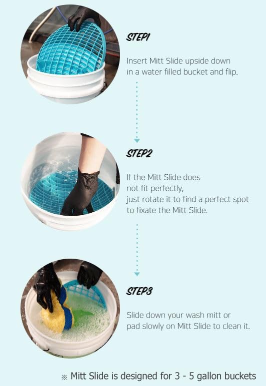 The Anti-Backdraft Design Effectively Eliminates Grit And Dirty Particles From Your Cleaning Mitt Or Towel To Enjoy A Scratch Free Car Wash Easily Cleans Mitts, Towels or Pads on the Sleek Double Curved Shaped Board Simple and Fast Installation: Insert the Mitt Slide Upside Down in a Water Filled Bucket and Flip! Mitt Slide is Designed to fit in Any Standard 3 or 5 Gallon Buckets (14-16 Liters)