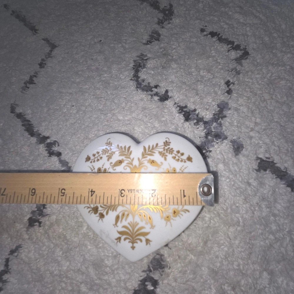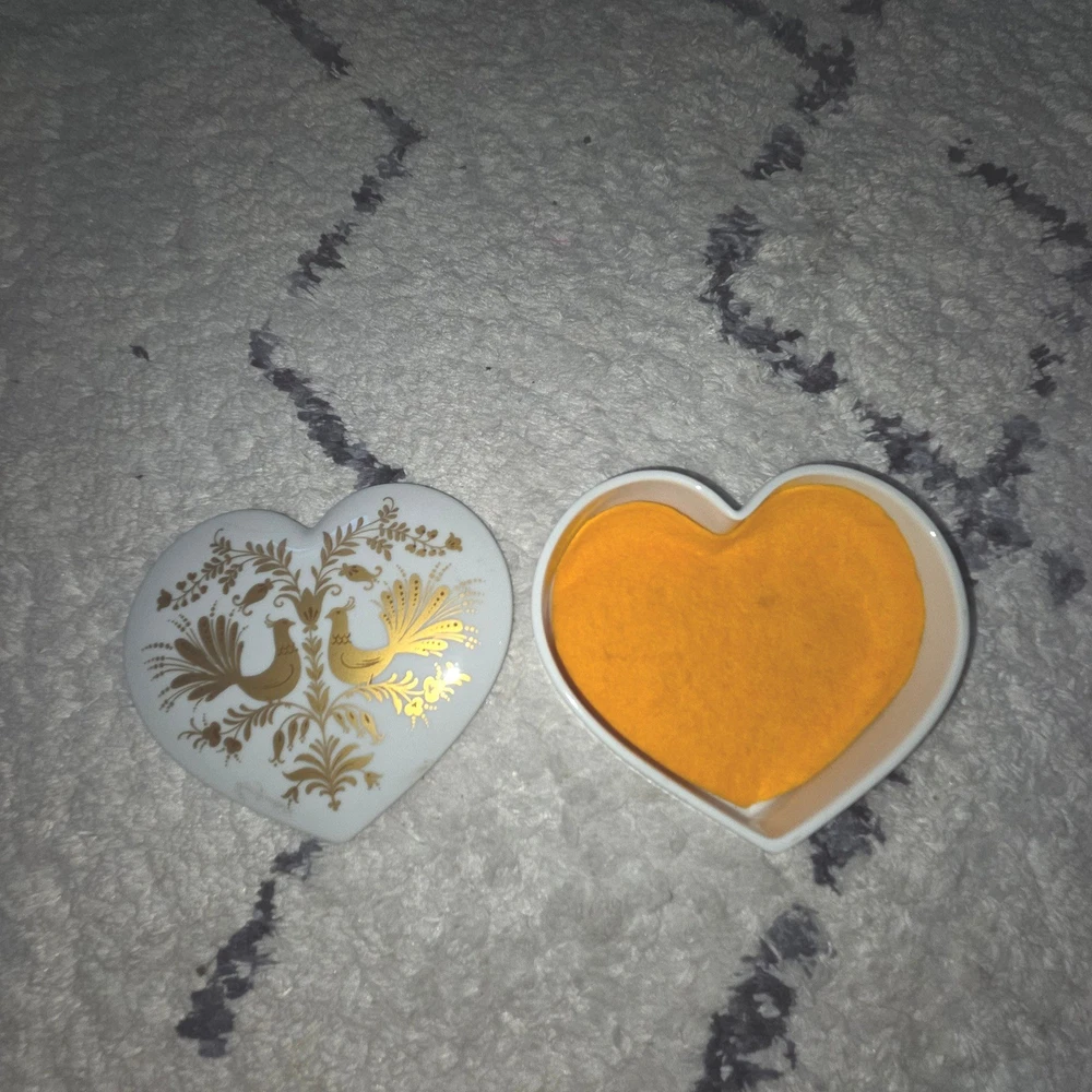 A touch of romance arrives in this heart-shaped trinket box, perfect for safeguarding your most cherished keepsakes. The lid features a delicate design of stylized birds and floral accents in shimmering gold, adding a touch of elegance to any space. Inside, a sweet inscription in German, "Ich hab Dich lieb" (I love you), adds a personal and heartfelt touch. This charming box is ideal for holding jewelry, small mementos, or as a decorative piece on a vanity or bedside table. It would also make a thoughtful gift for a loved one on Valentine's Day or an anniversary. Keywords: Heinrich, Porcelain, Trinket Box, Heart Shaped, Birds, Gold Accent, Germany, Vintage, Keepsake Box, Jewelry Box, Decorative Box, Romantic Gift, Valentine's Day, Anniversary Gift