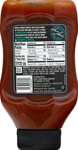 About this item HEINZ CAROLINA VINEGAR STYLE BBQ SAUCE: One 18.6 oz bottle of Heinz Carolina Vinegar Style BBQ Sauce FLAVORFUL BBQ SAUCE: Heinz Carolina Vinegar Style BBQ Sauce is a sauce the entire family loves INSPIRED BY CAROLINA FLAVOR: Carolina-style barbecue sauce inspired by the flavors of one of America’s best BBQ regions ONE-OF-A-KIND FLAVOR: Made with white vinegar and apple cider vinegar for a one-of-a-kind tangy flavor GREAT FOR CHICKEN, RIBS & MORE: Great on chicken, pork and ribs, either as a BBQ marinade or for use as a table sauce SQUEEZE BOTTLE: Easy to use squeeze bottle CERTIFIED KOSHER: Our BBQ sauce is great for those keeping Kosher