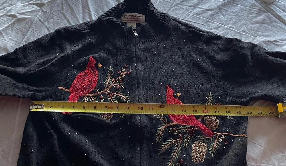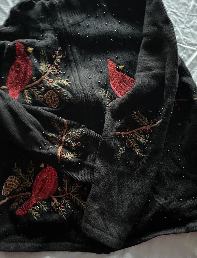 Get into the holiday spirit with this stunning Heirloom Collectibles Christmas cardigan sweater! Featuring a beautiful pattern of birds in black, red, green, yellow, and multicolor, this sweater is perfect for any Christmas occasion. The long sleeves and round neckline provide warmth and comfort during the chilly winter season, while the cotton blend material ensures a soft and cozy feel. This sweater is a size L and is designed for regular size women. It features a full zip and is accented with sequins for a touch of sparkle. The vintage and classic style makes it a perfect addition to any wardrobe, while the graphic print adds a fun and playful touch. Ideal for Western, Christmas, animals, winter, holiday, colorful, classic, ugly sweater, and 90s themes, this sweater is sure to make a statement. Hand-wash only for optimal care and maintenance.