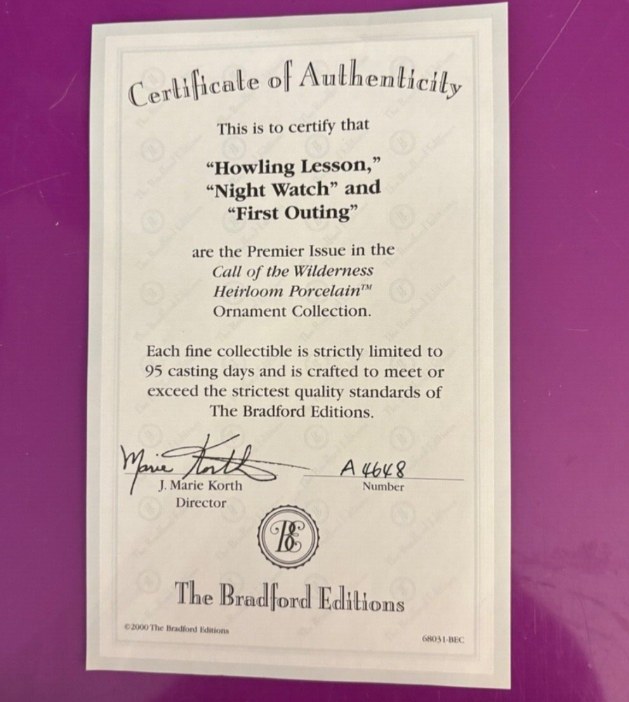 Experience the allure of the great outdoors with the Call Of The Wilderness Heirloom Porcelain Bauble from Bradford Exchange. This exquisite piece is crafted from high-quality porcelain, ensuring a delicate and timeless charm that complements any Christmas decor theme. Perfect for the holiday season, it's designed to capture the essence of nature's serene beauty. Whether displayed on your mantle or as part of a festive table spread, this bauble is sure to add a touch of elegance and warmth to your celebrations. Set includes : “Howling Lesson”, “Night Watch”, and “First Outing” #A4648 Never used/out of box Smoke Free home