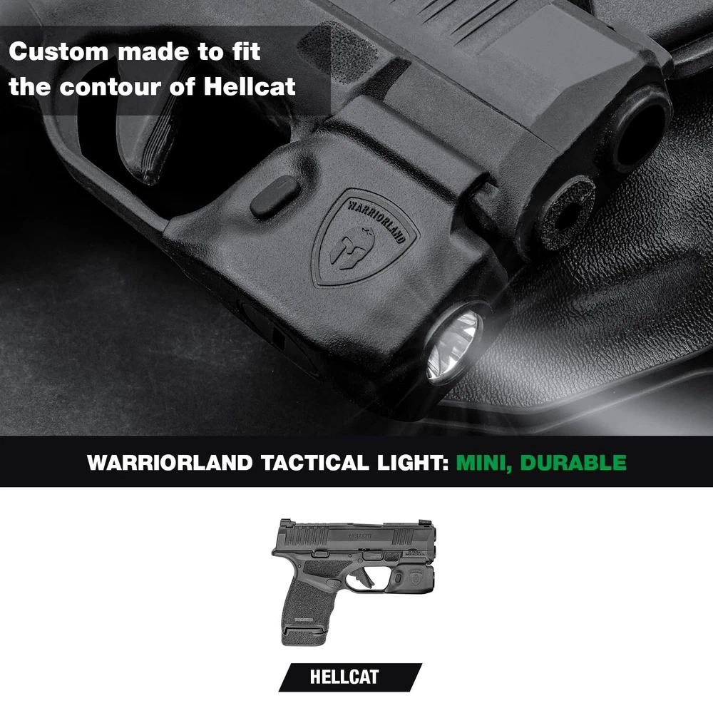 Hellcat Mini Light Tailored Made for Springfield Armory Hellcat , 150 Lumens Hellcat Handgun Light, LED Tactical Flashlight SL-1 MINI SIZE - Mini Size, and Hellcat tactical light's appearance are custom made to fit the contour of Springfield Armory Hellcat Micro Compact BATTERY INDICATOR - Battery indicate when you press any button - Green light indicates battery power upon 70%, Yellow light indicates battery power between 30%-70%, Red light indicates battery power below 30% IPX4 & 1M IMPACT- Protect Hellcat light from splashing water, no matter the direction - Passed 1 meters drop test 4 DIFFERENT LIGHT MODES - Tactical Light Mode / Constant Light Mode / Strobe Mode / Moonlight Mode US DRIVER CHIP - By using US LED driver chips, light can turn on with lower power consumption - Improving the efficiency of rectification HUMANIZED OPERATION DESIGN - The right / left operation button position are designed to fit both men and women's finger operate COMPATIBILITY - Tailored for Springfield Armory Hellcat 3’’ Micro Compact , also with Hellcat RDP and Hellcat - Equipped with a Right Hand IWB kydex holster (Hellcat and Hellcat RDP barrel would come out from holster about 0.7 Inch) WHAT YOU GET - 1*Tactical Light / 1*User Manual / 1*Wrench / 1*Cleaning Cloth / 2*CR1/3N Lithium Batteries OUTPUT - SL-1 tactical light for Springfield Hellcat maximum output of 150 lumen - beam distance of 100 meters