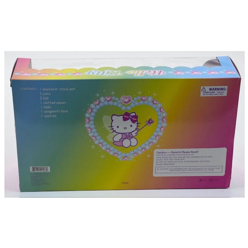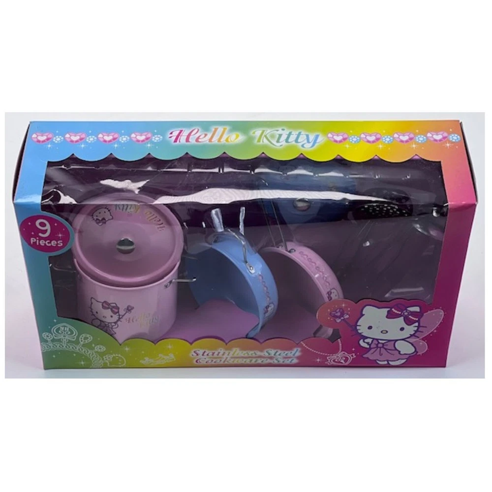 This 9-piece cookware set is perfect for kids who love to cook and play with Hello Kitty. The set includes stainless steel pots and pans in various sizes, all adorned with the iconic Hello Kitty character. The pink color adds a fun touch to the kitchen and is sure to delight young chefs. The set is suitable for children aged 4-7 and is part of the Hello Kitty character family. It is a great addition to any kitchen or playtime toy collection. Let your child's imagination run wild with this fun and functional cookware set. Hello Kitty 9-Piece Stainless Steel Cookware Set for Kids Contents: 1 diameter stock pot 2 pans 2 lids 1 slotted spoon 1 ladle 1 spaghetti fork 1 spatula