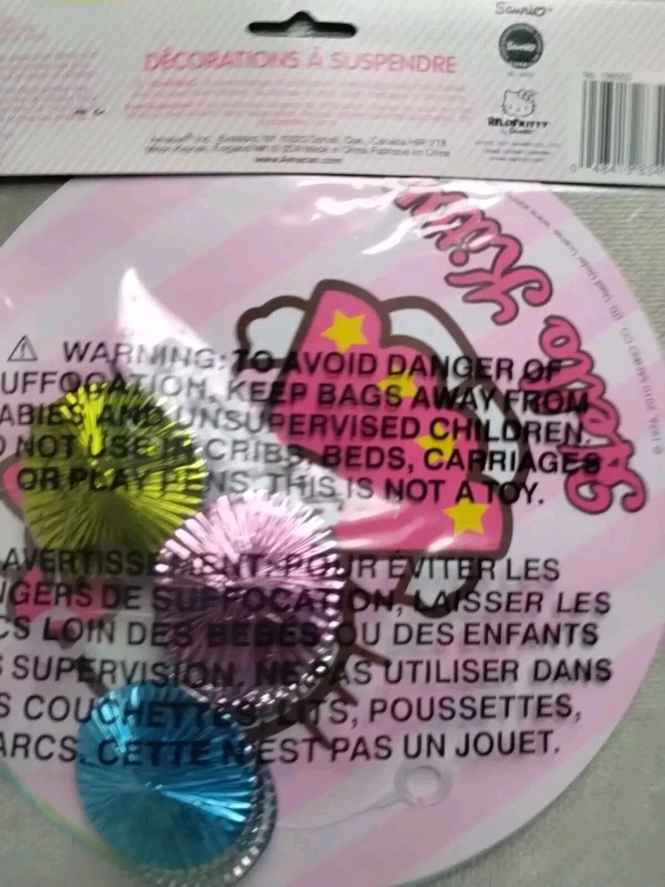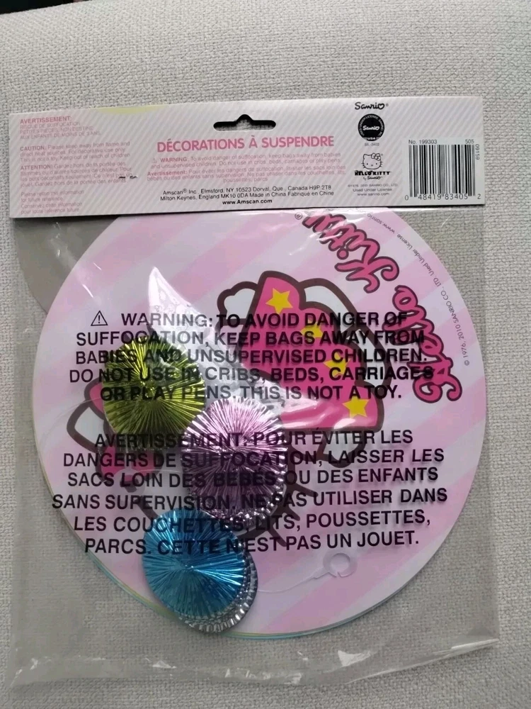 The product is a set of Hello Kitty birthday party decorations featuring dangling cutouts. The decorations are made of cardboard with a foil production technique, showcasing the popular Hello Kitty character in a multi-color design. Perfect for a child's birthday celebration, these party deco items are brand new and come from the Amscan brand. Ideal for creating a fun and festive atmosphere at the party. Track Page Views With Auctiva's Counter