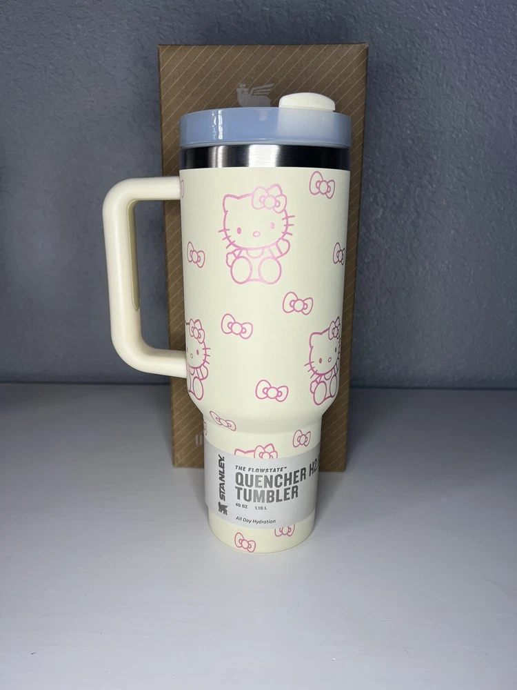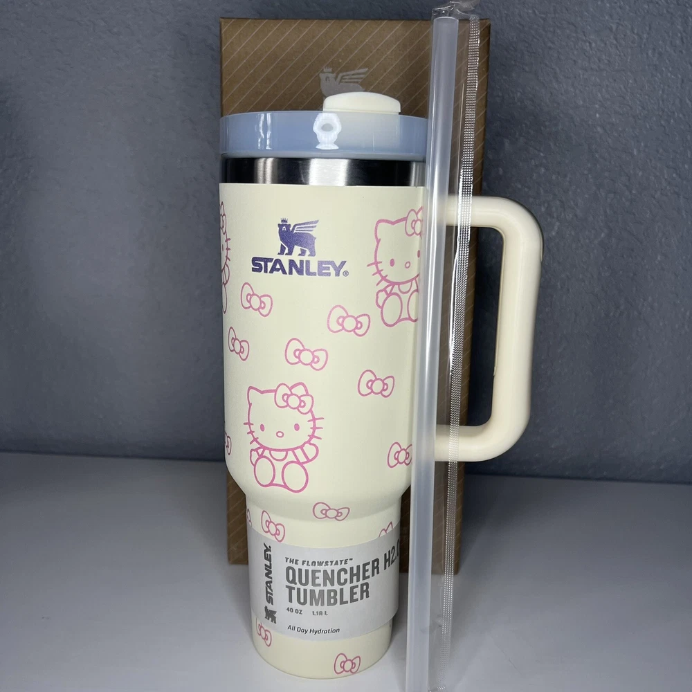Brand new cream&pink hello kitty engraved Stanley tumbler. This Hello Kitty engraved Stanley tumbler is the perfect addition to any collection. With a 40 oz capacity, it keeps beverages hot or cold for up to 7 and 11 hours, respectively. The stainless steel material and pink color make it a stylish and durable choice for teens, adults, kids